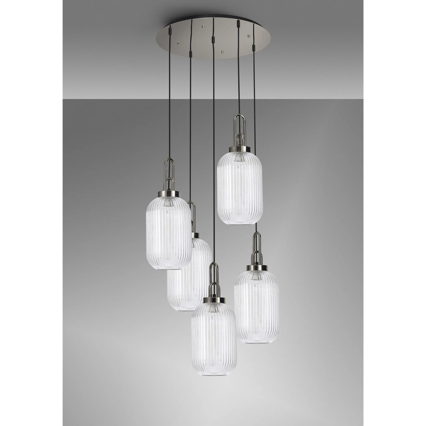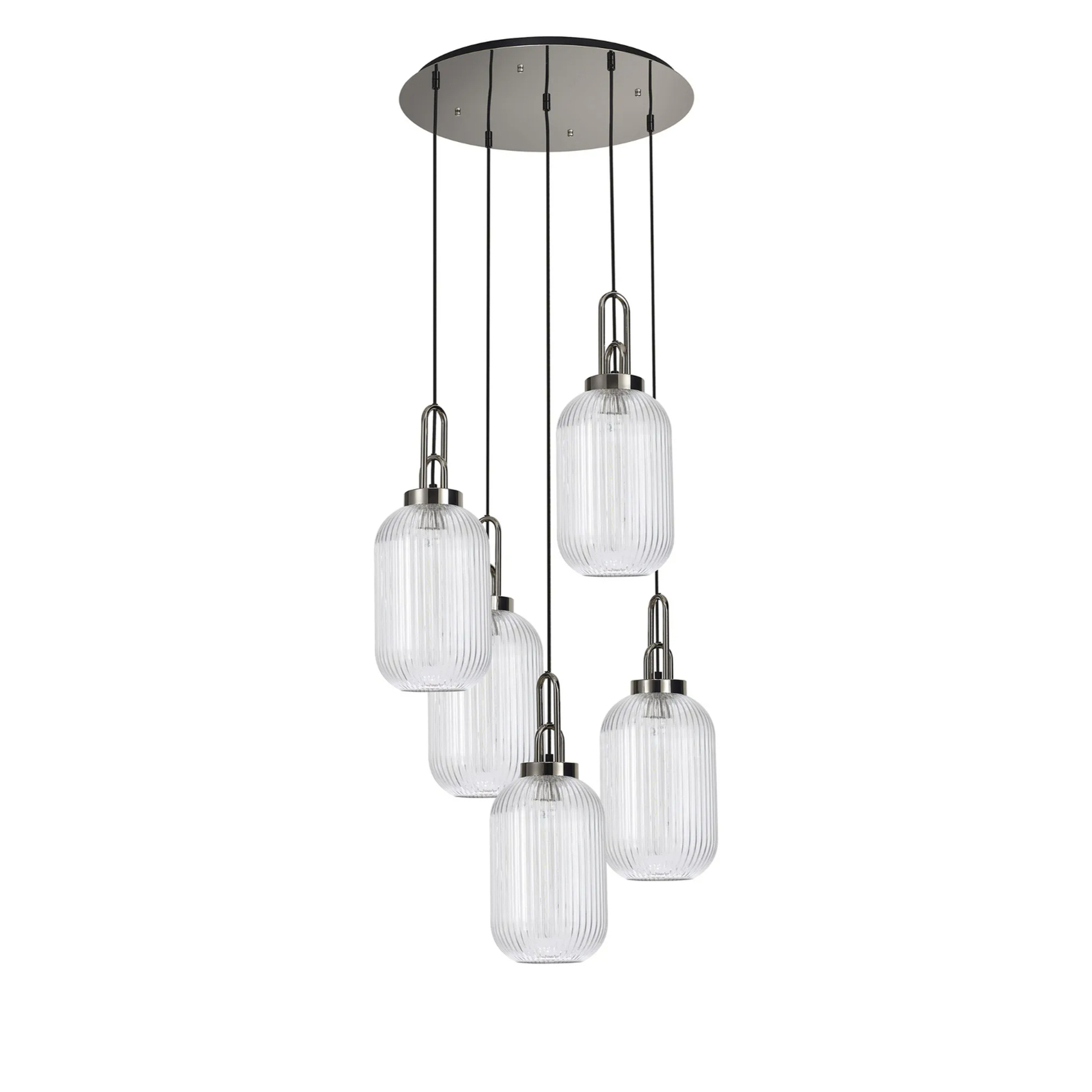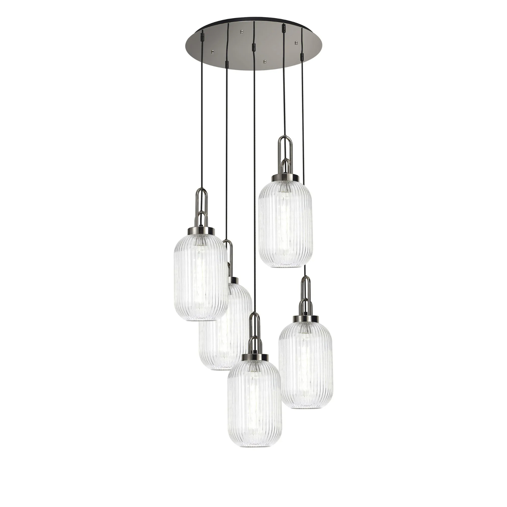 Idolite Camille Round 5 Light Pendant With 20cm Tubular Ribbed Glass, Polished Nickel/Matt Black Clear | IDOK1670