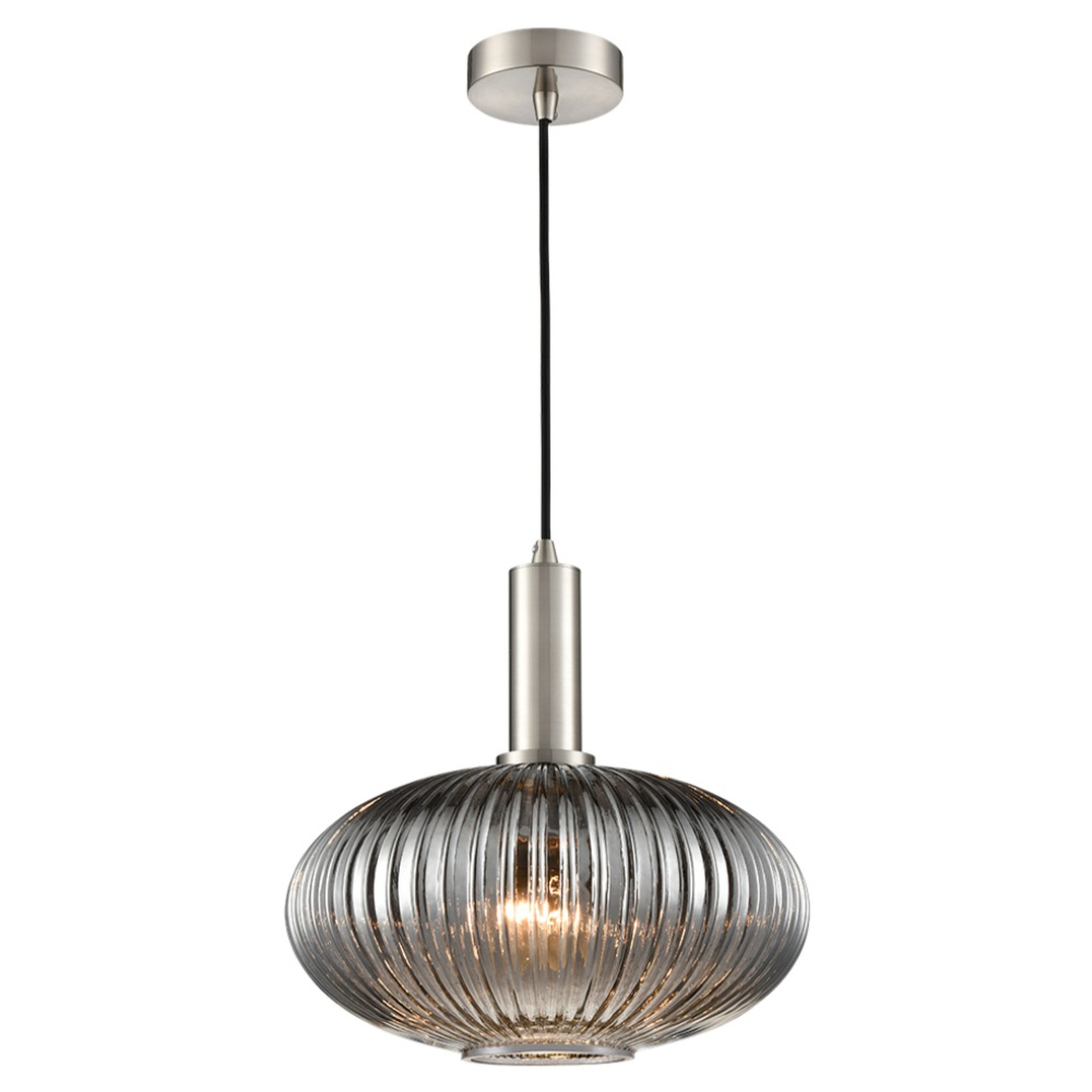 Franklite Mezcla Satin Nickel Single Pendant Light Complete With 300mm Smoked Ribbed Glass Shade | PCH460-398
