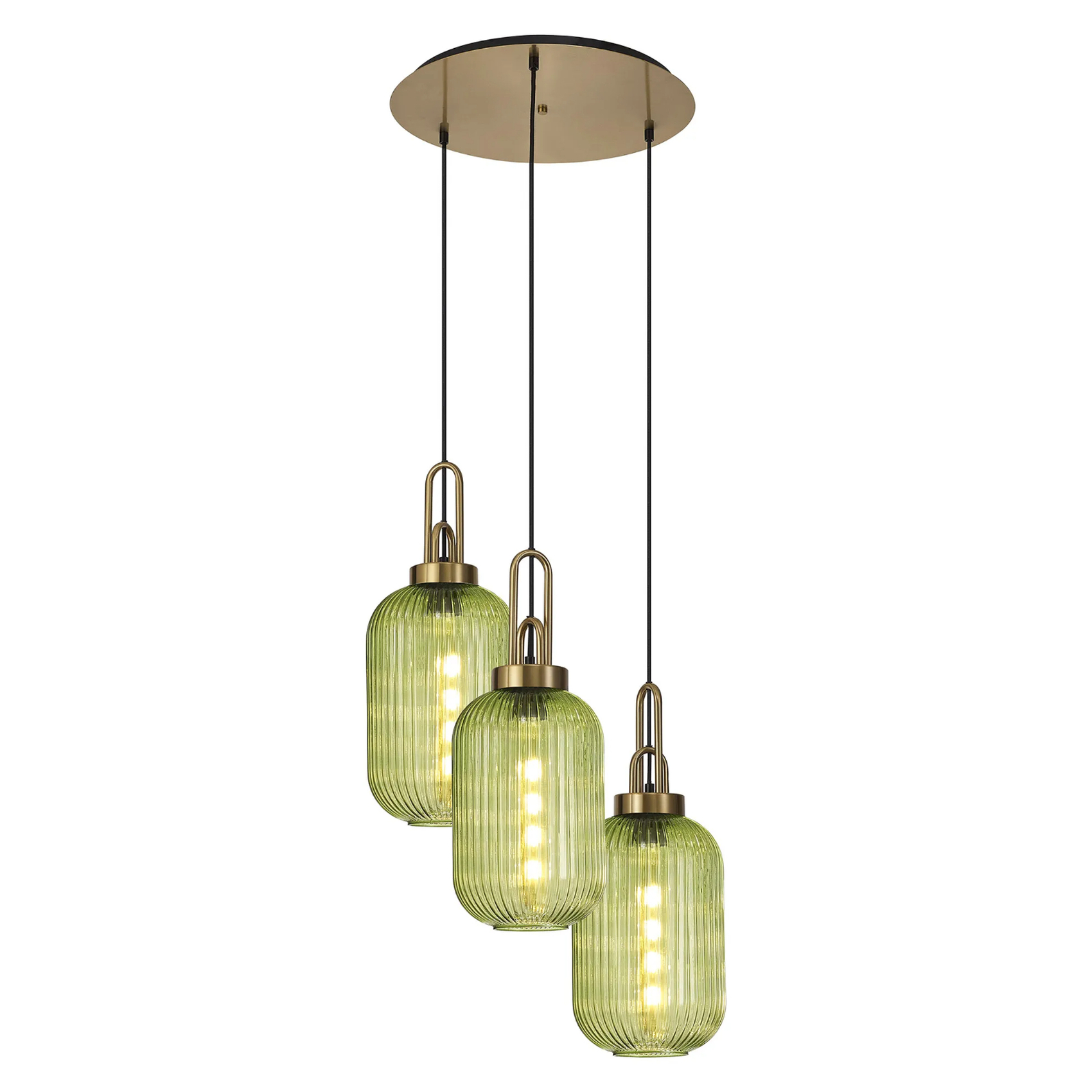 Idolite Camille 2m Round Pendant 3 x E27 With 20cm Tubular Ribbed Glass, Brass Gold/Green/Matt Black | IDOK2551