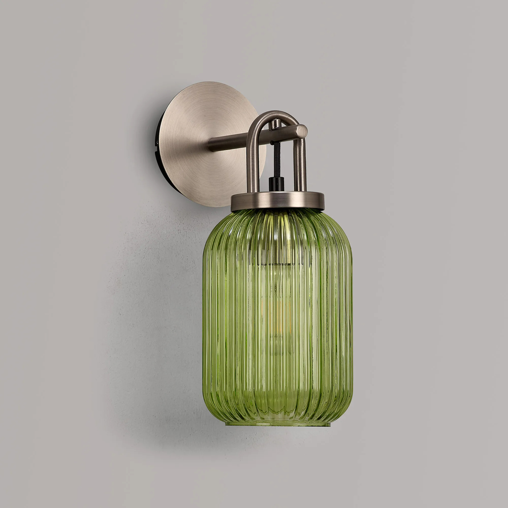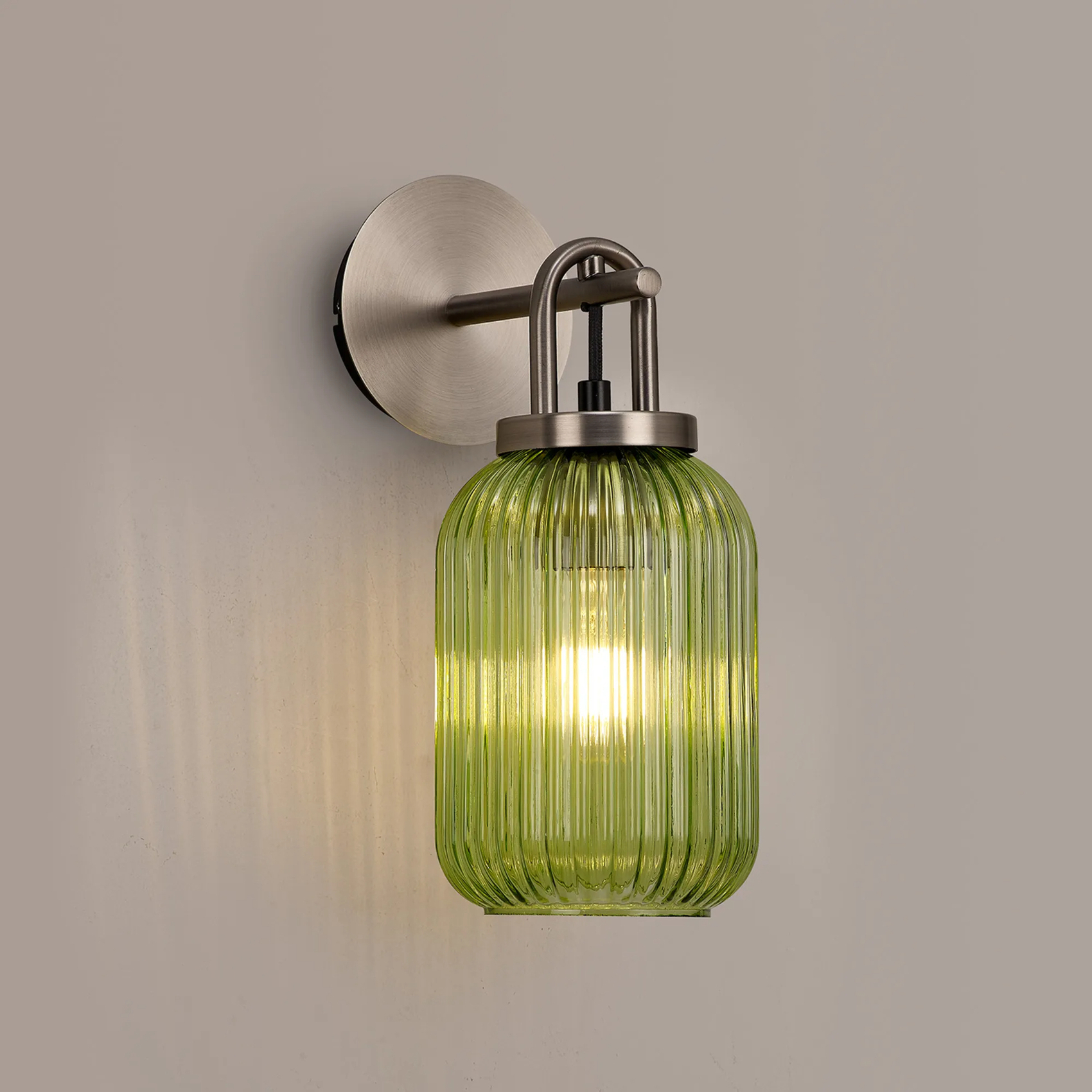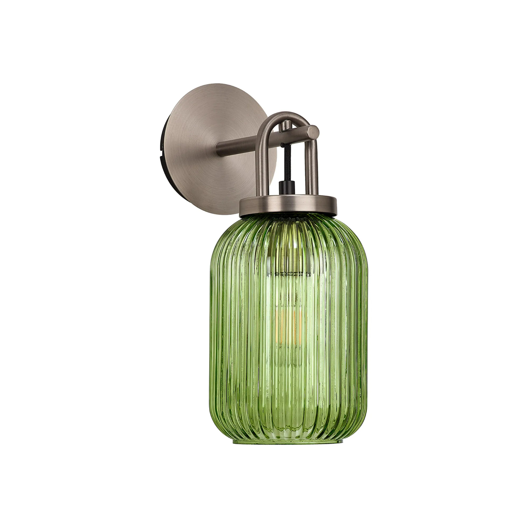 Idolite Camille Wall Light Switched, 1 x E27, Antique Silver With 14cm Tubular Ribbed Glass, Green | IDOK0622