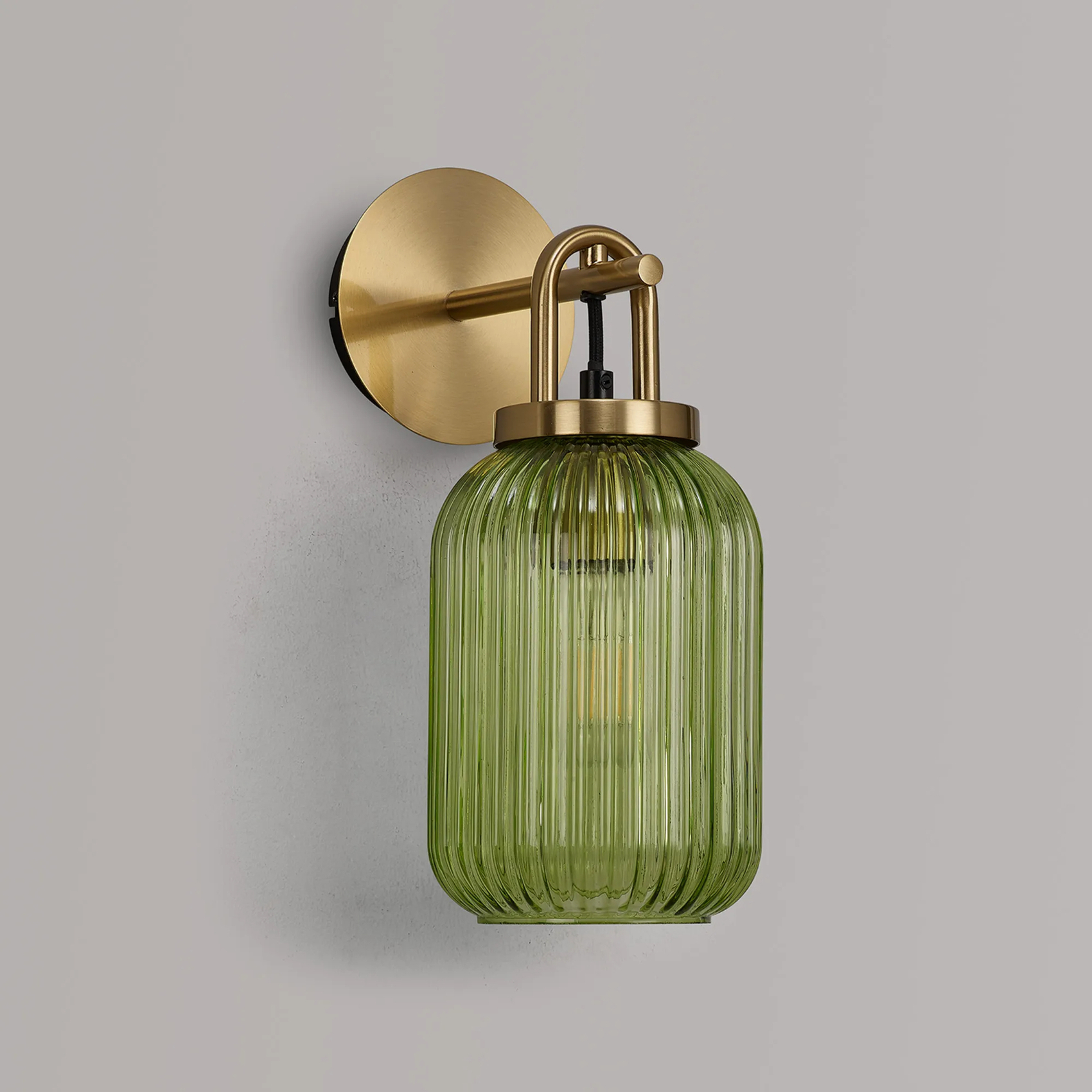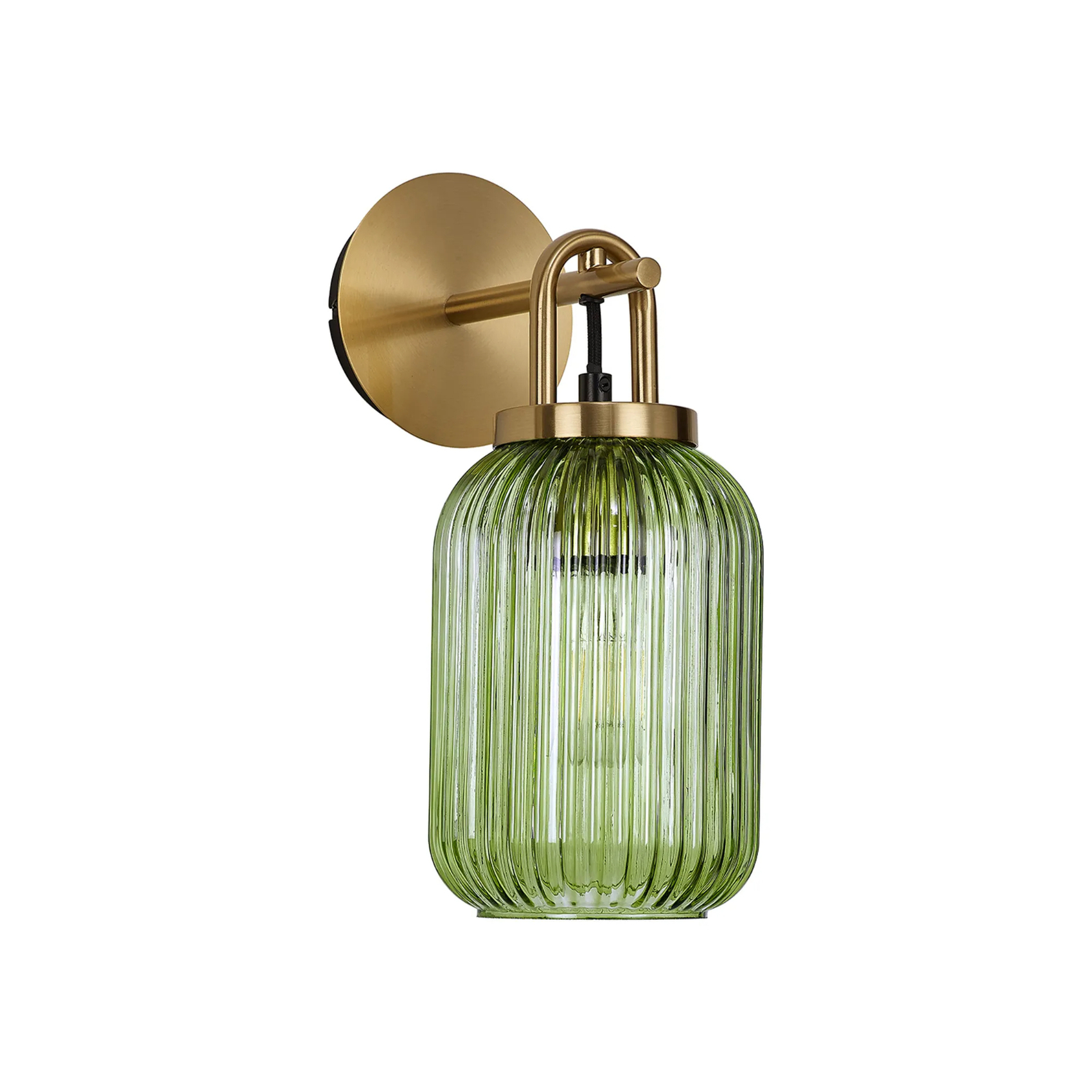 Idolite Camille Wall Light Switched, 1 x E27, Brass Gold With 14cm Tubular Ribbed Glass, Green | IDOK6622