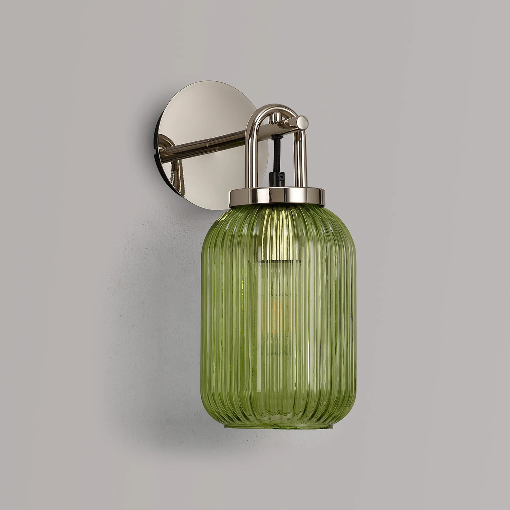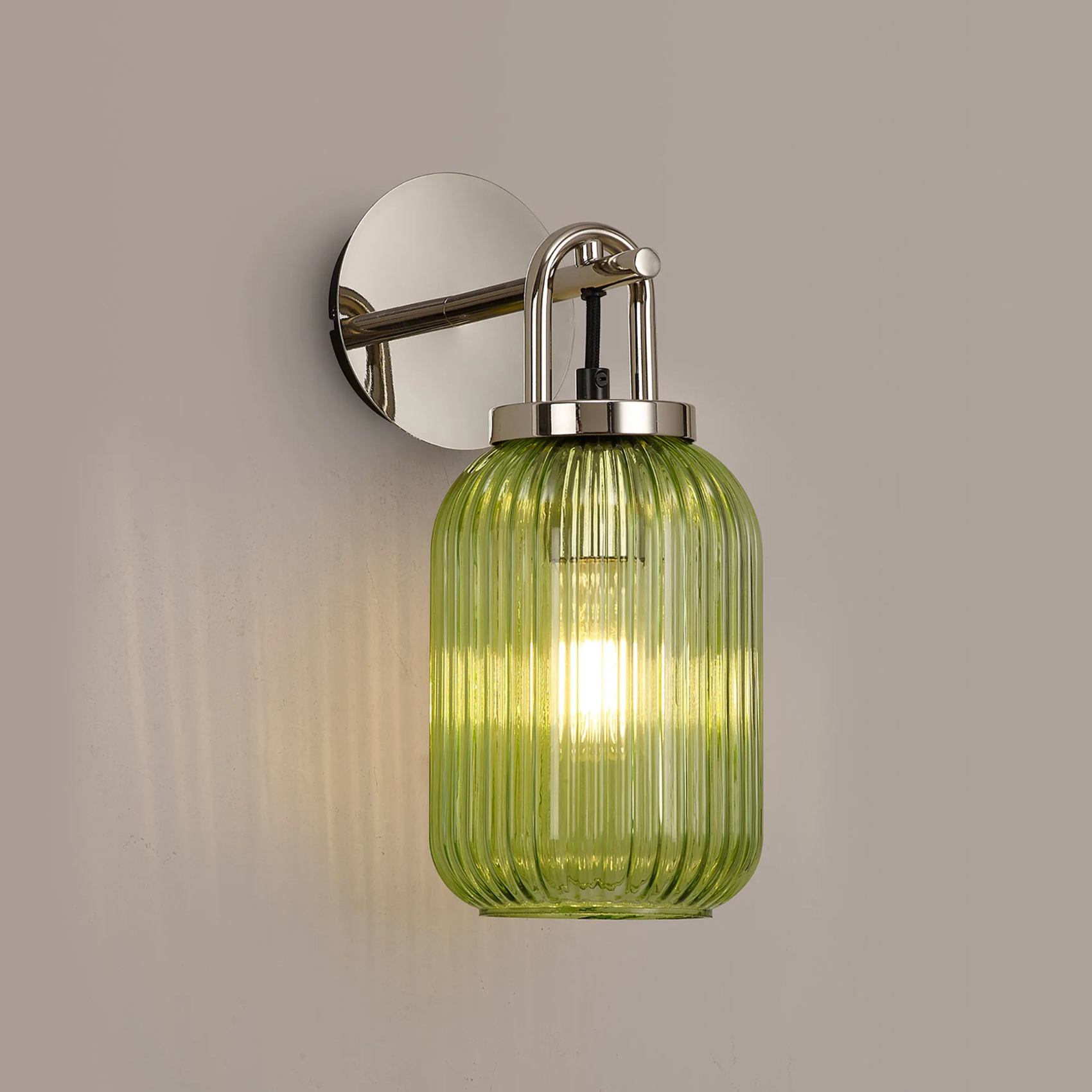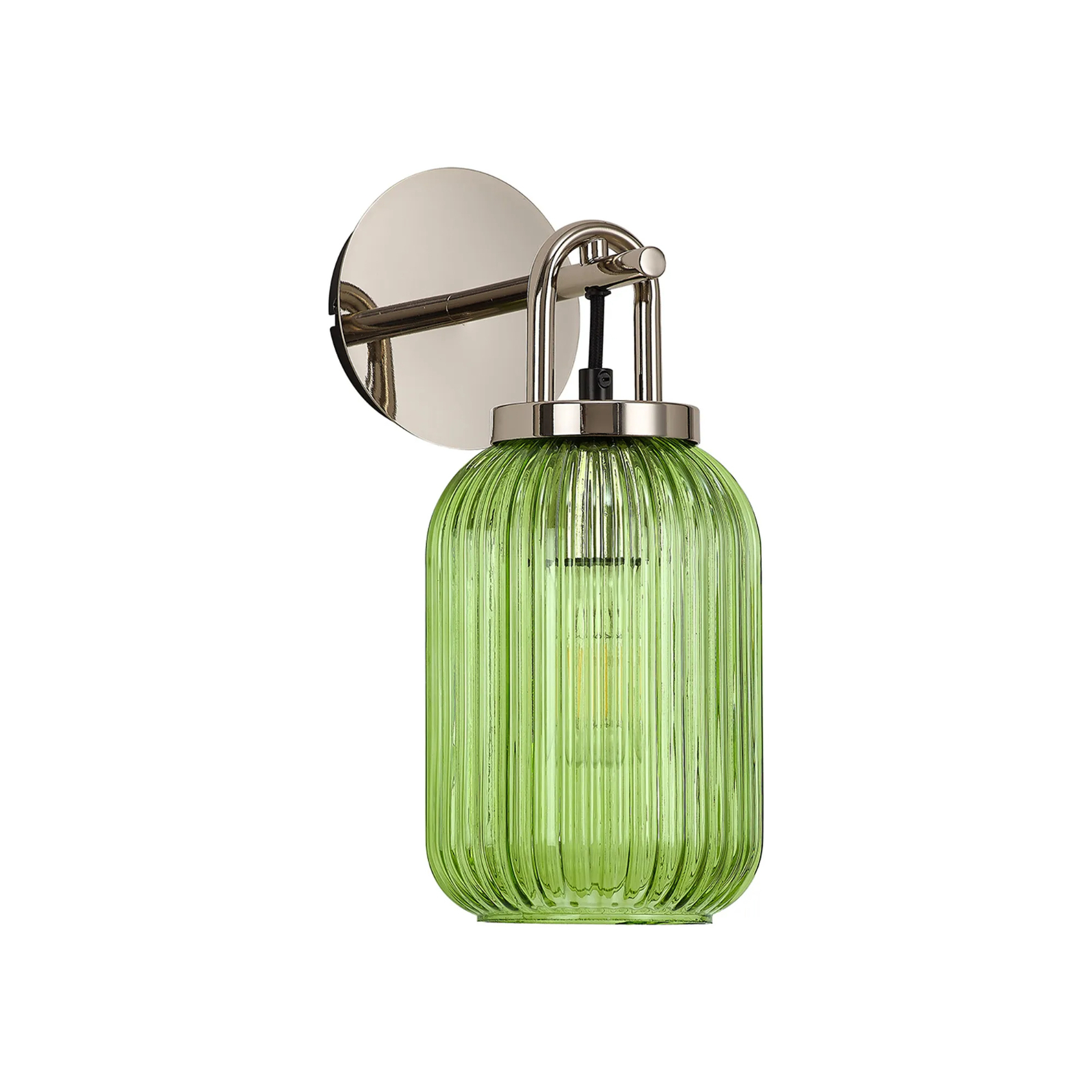 Idolite Camille Wall Light Switched, 1 x E27, Polished Nickel With 14cm Tubular Ribbed Glass, Green | IDOK7722