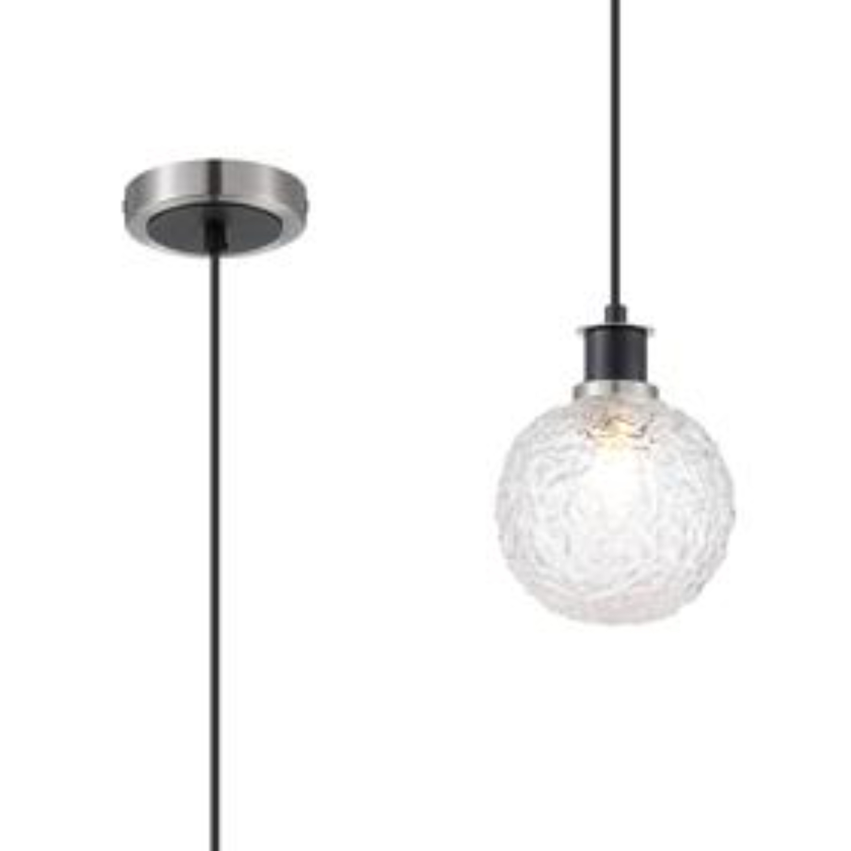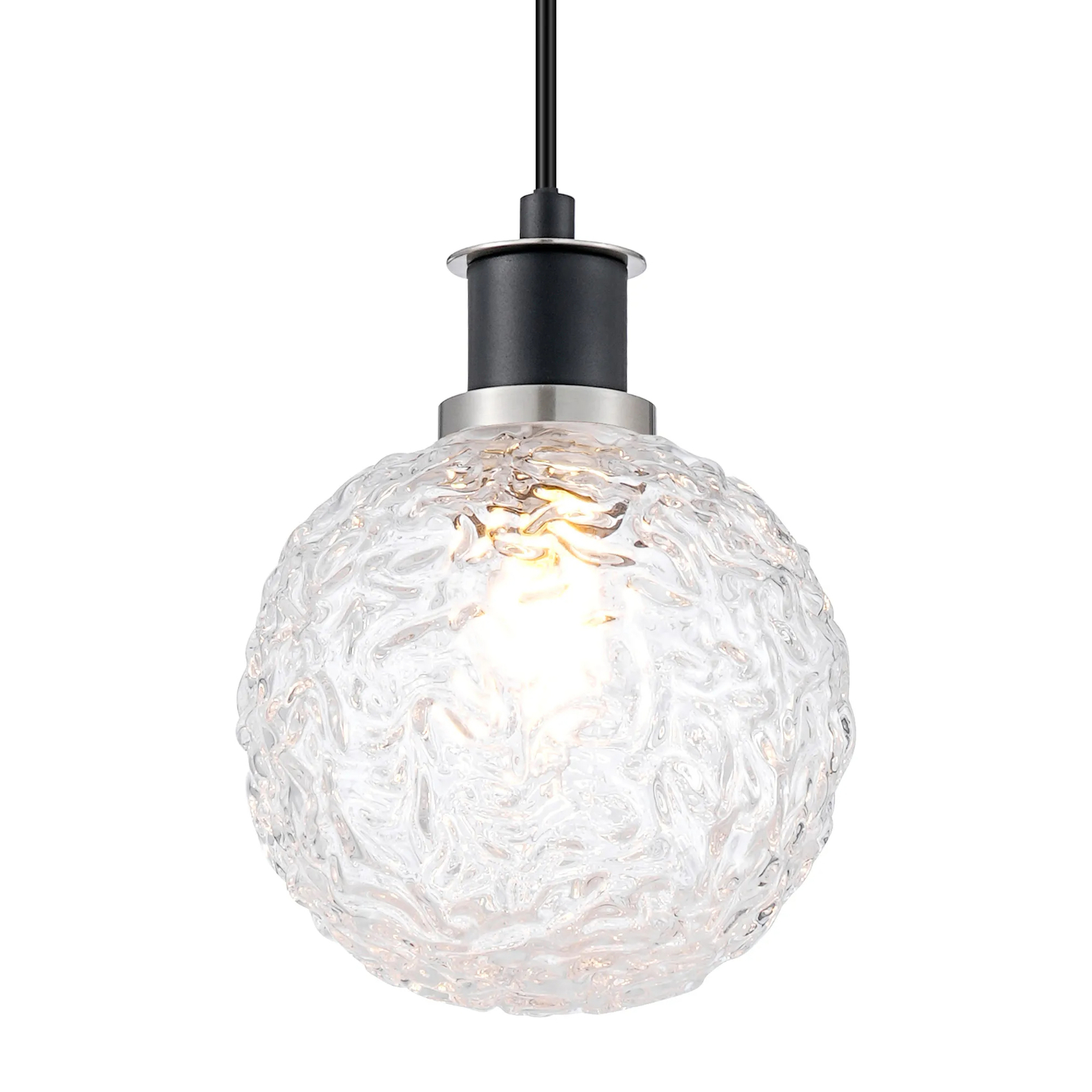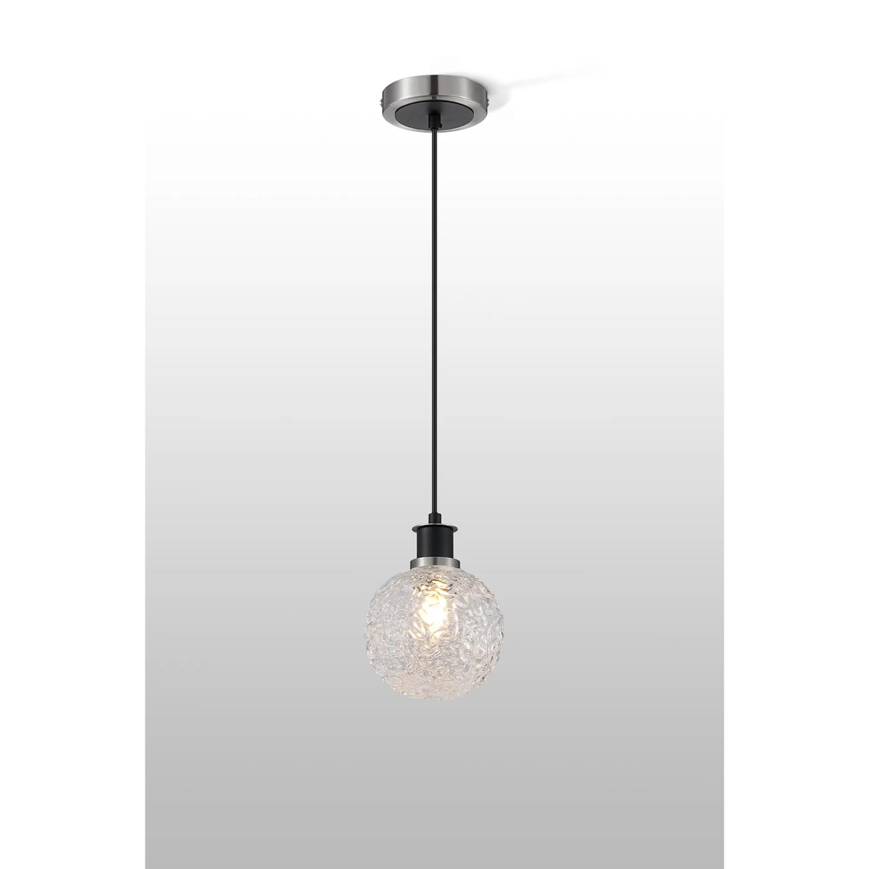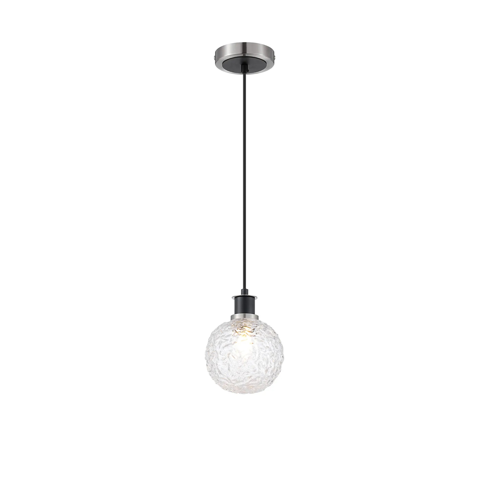 Idolite Haughton IP 1.3m Pendant, 1 x E14 With 15cm Round Textured Crumple Glass Shade, Satin Nickel, Clear & Satin Black | IDOLCPRC/NS4099