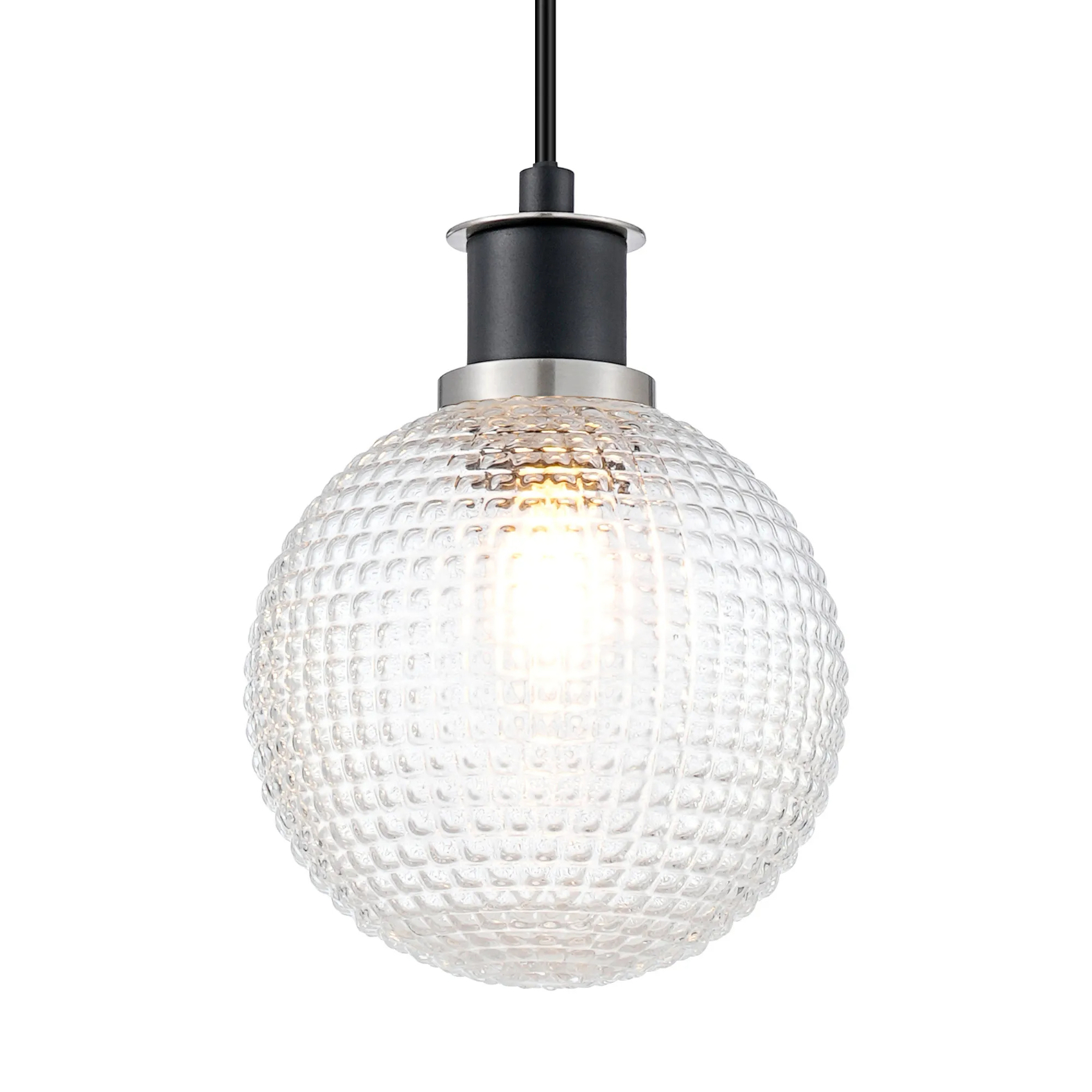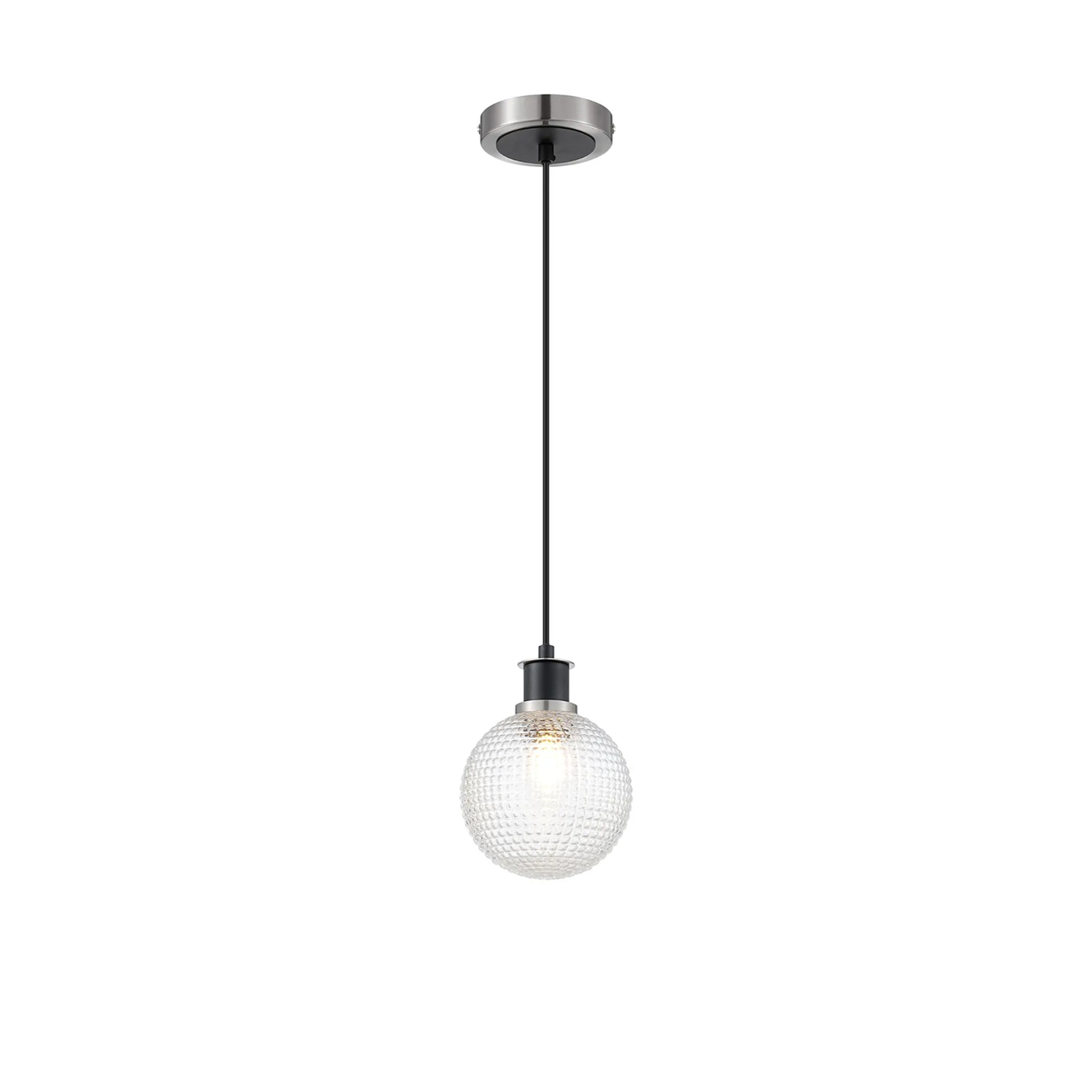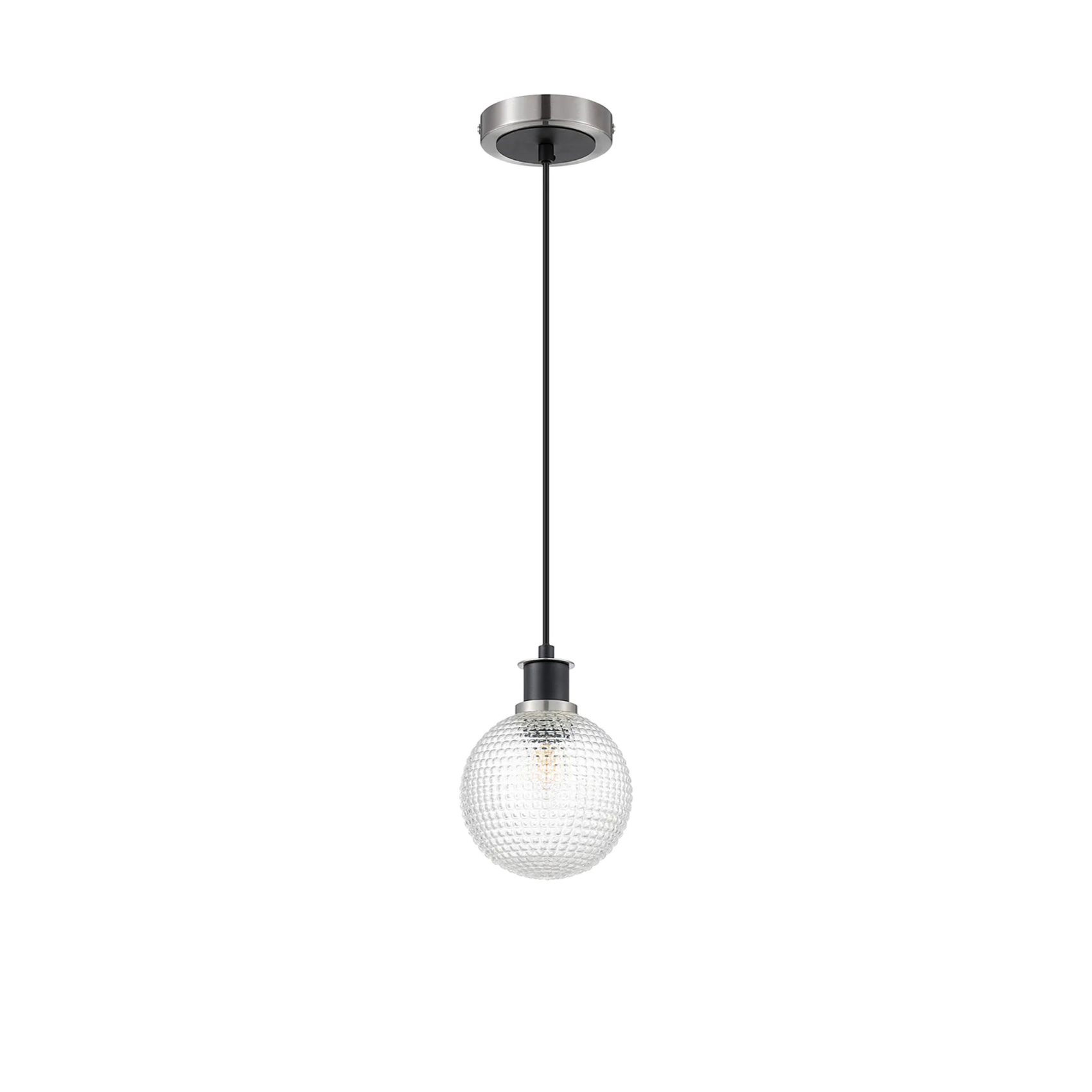 Idolite Haughton IP 1.3m Pendant, 1 x E14 With 15cm Round Textured Diamond Pattern Glass Shade, Satin Nickel, Clear & Satin Black | IDOLCAID/NS4099