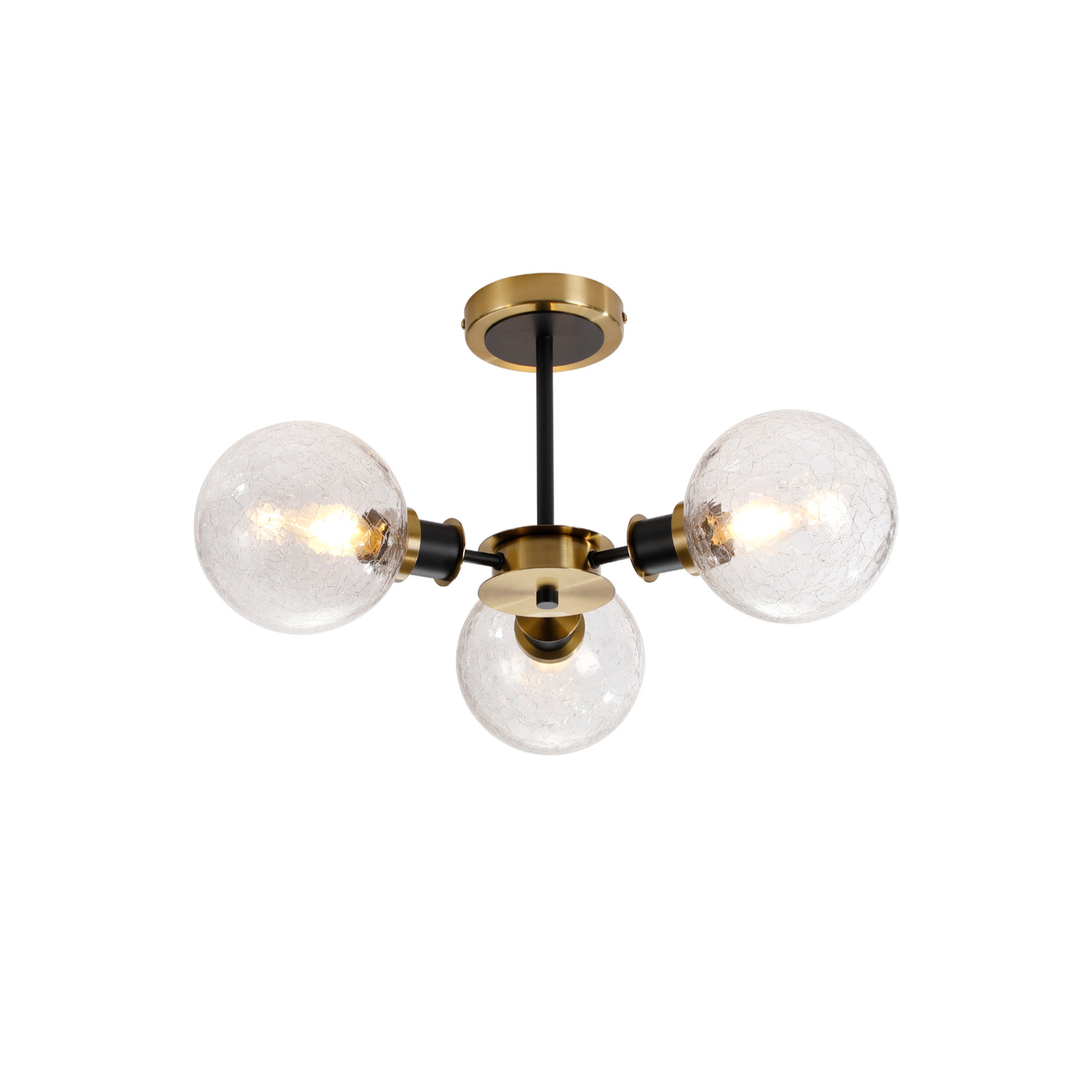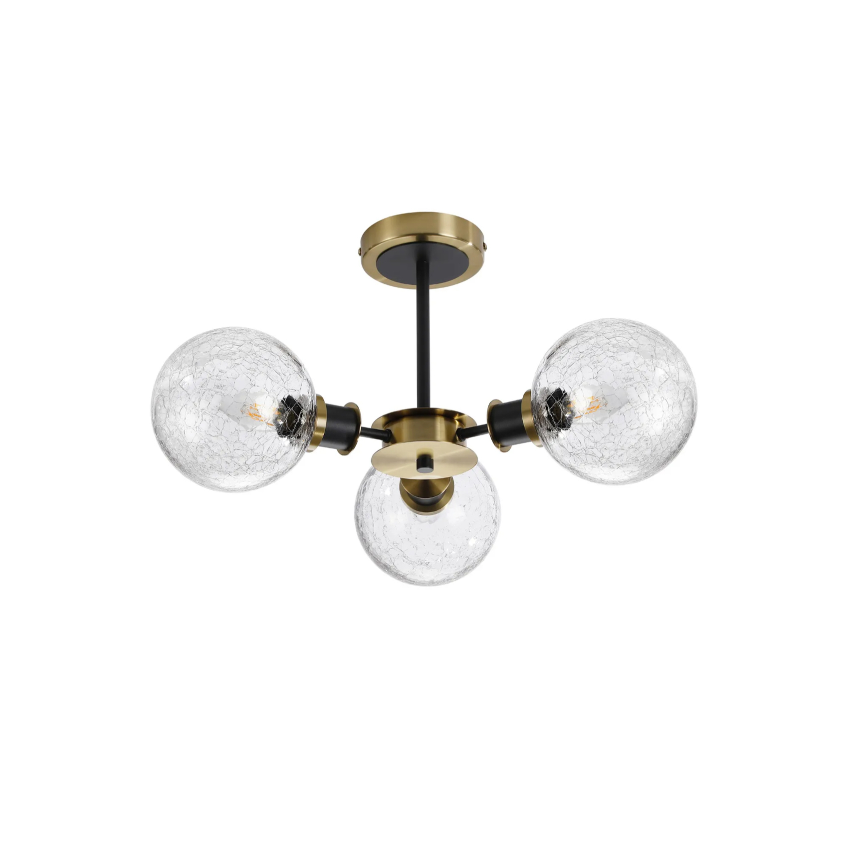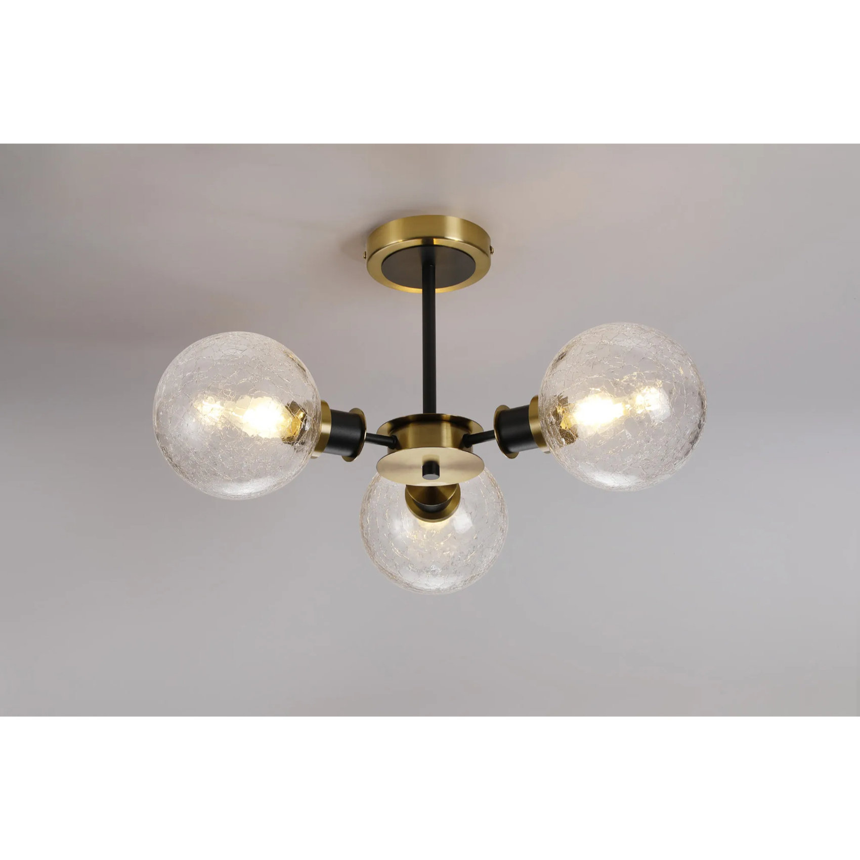 Idolite Haughton IP Semi Ceiling, 3 x E14 With 15cm Round Crackled Glass Shade, Brass, Clear & Satin Black | IDOLCKRC/RB5099