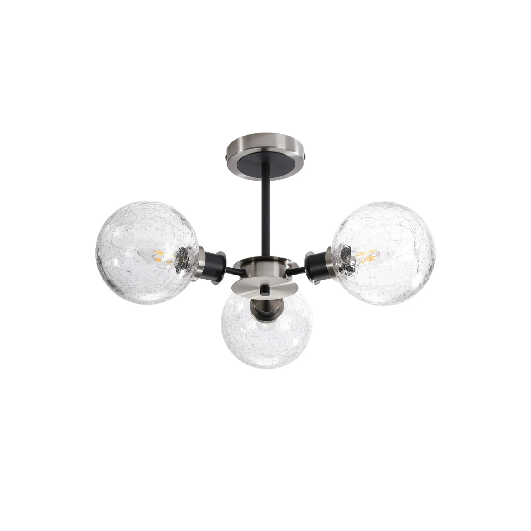 Idolite Haughton IP Semi Ceiling, 3 x E14 With 15cm Round Crackled Glass Shade, Satin Nickel, Clear & Satin Black | IDOLCKRC/NS5099
