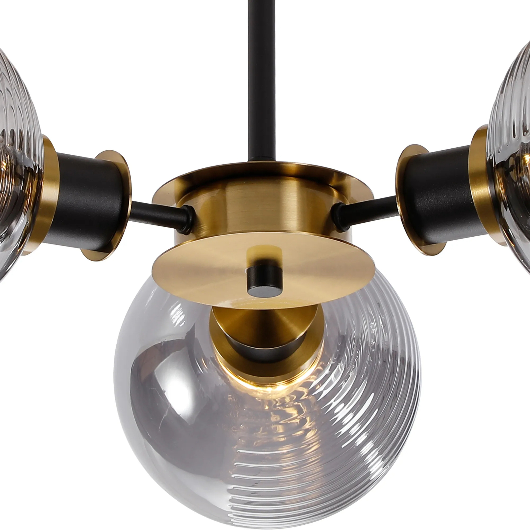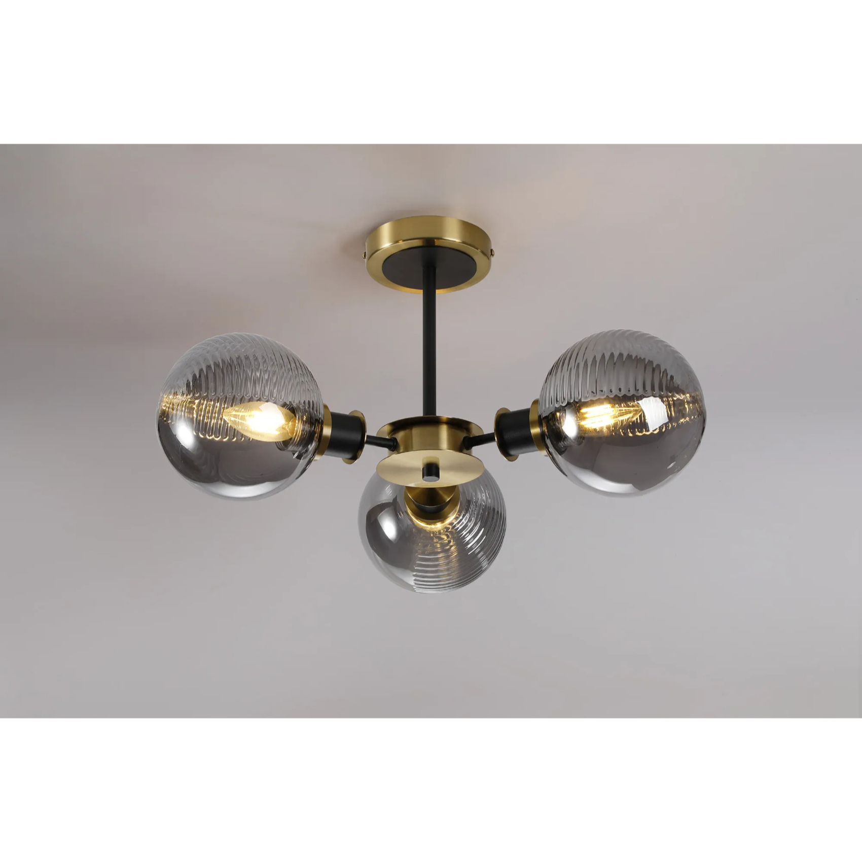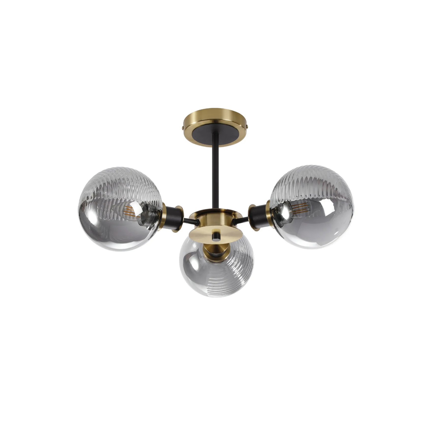 Idolite Haughton IP Semi Ceiling, 3 x E14 With 15cm Round Double Textured Smooth/Ribbed Glass Shade, Brass, Smoke Plated & Satin Black | IDOMSBRS/RB5099