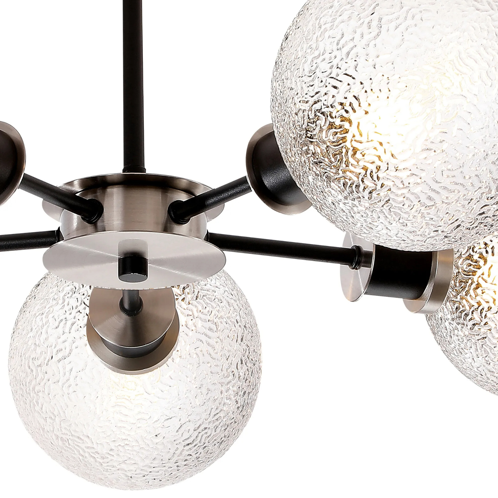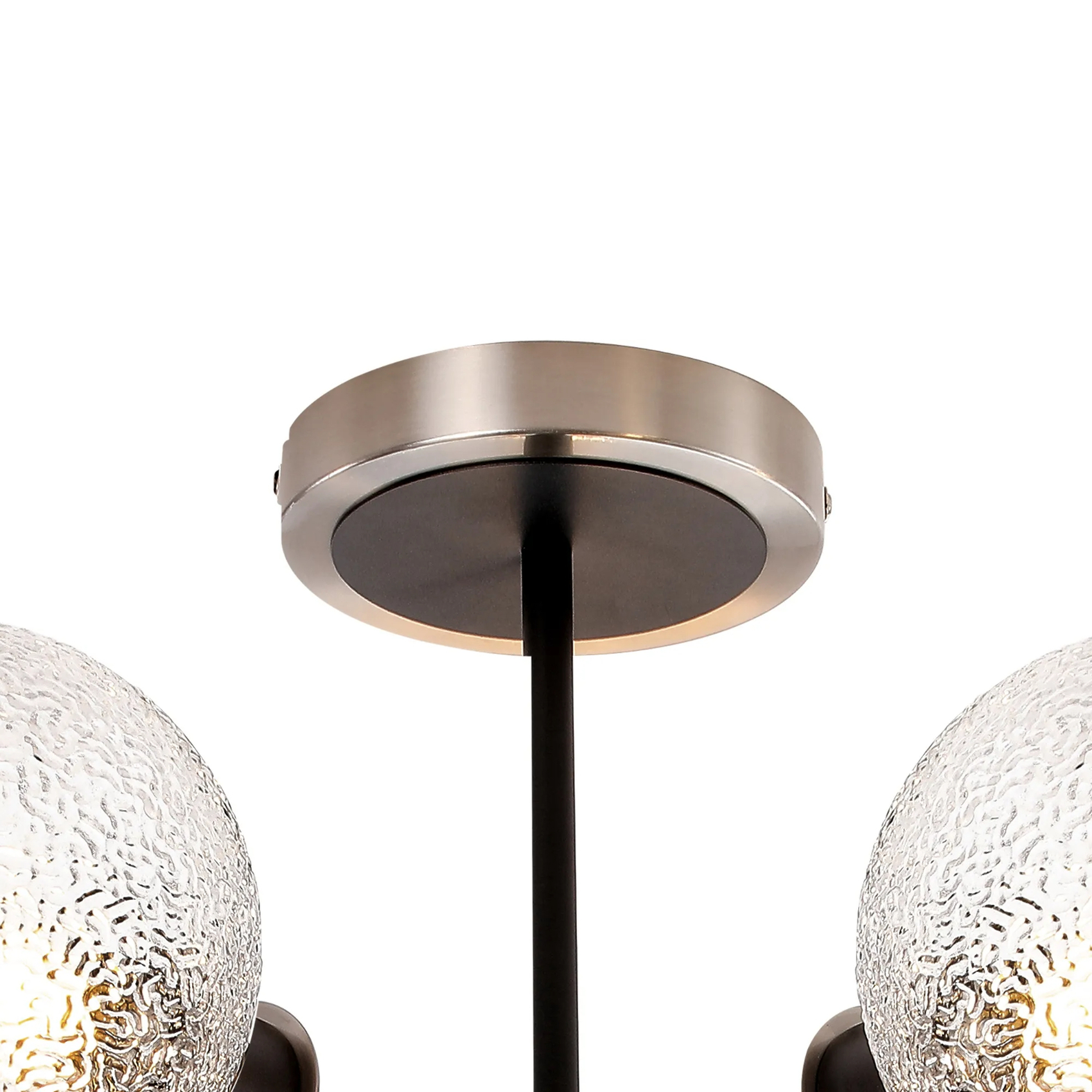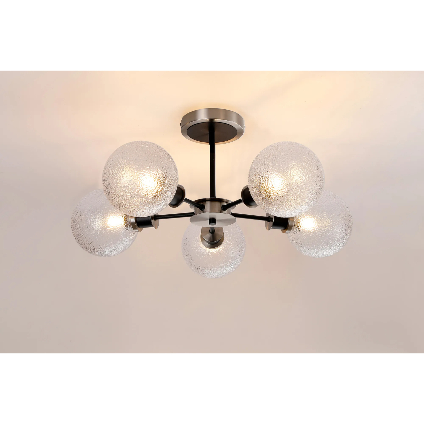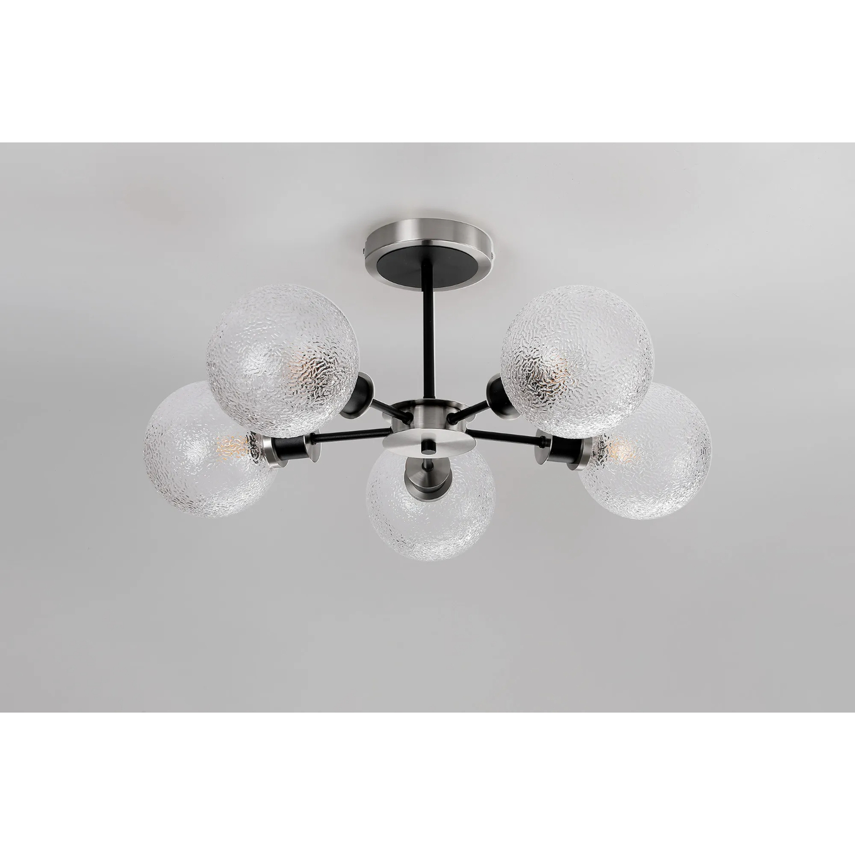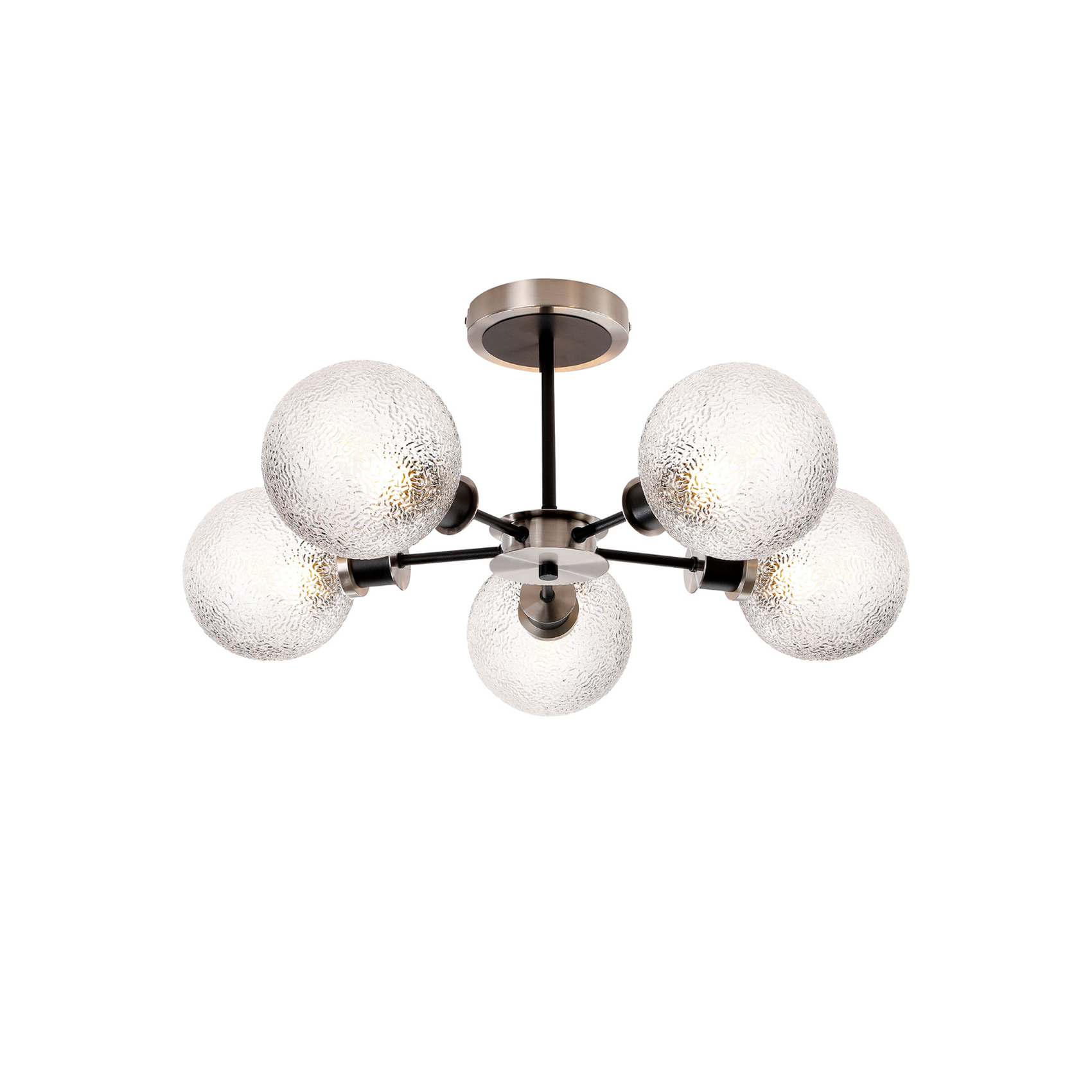Idolite Haughton IP Semi Ceiling, 5 x E14 With 15cm Round Dimpled Glass Shade, Satin Nickel, Clear & Satin Black | IDOLCPMD/NS6099