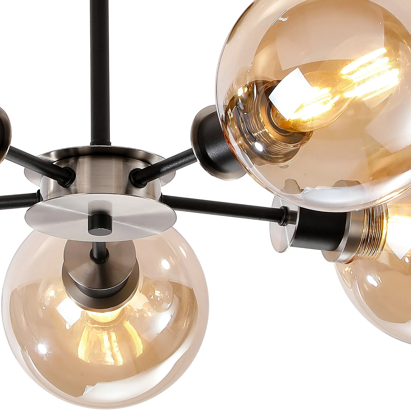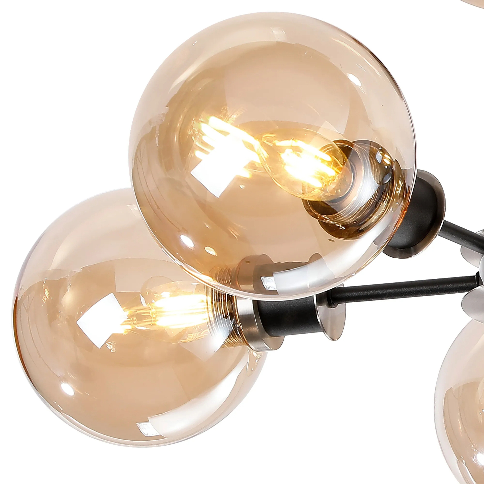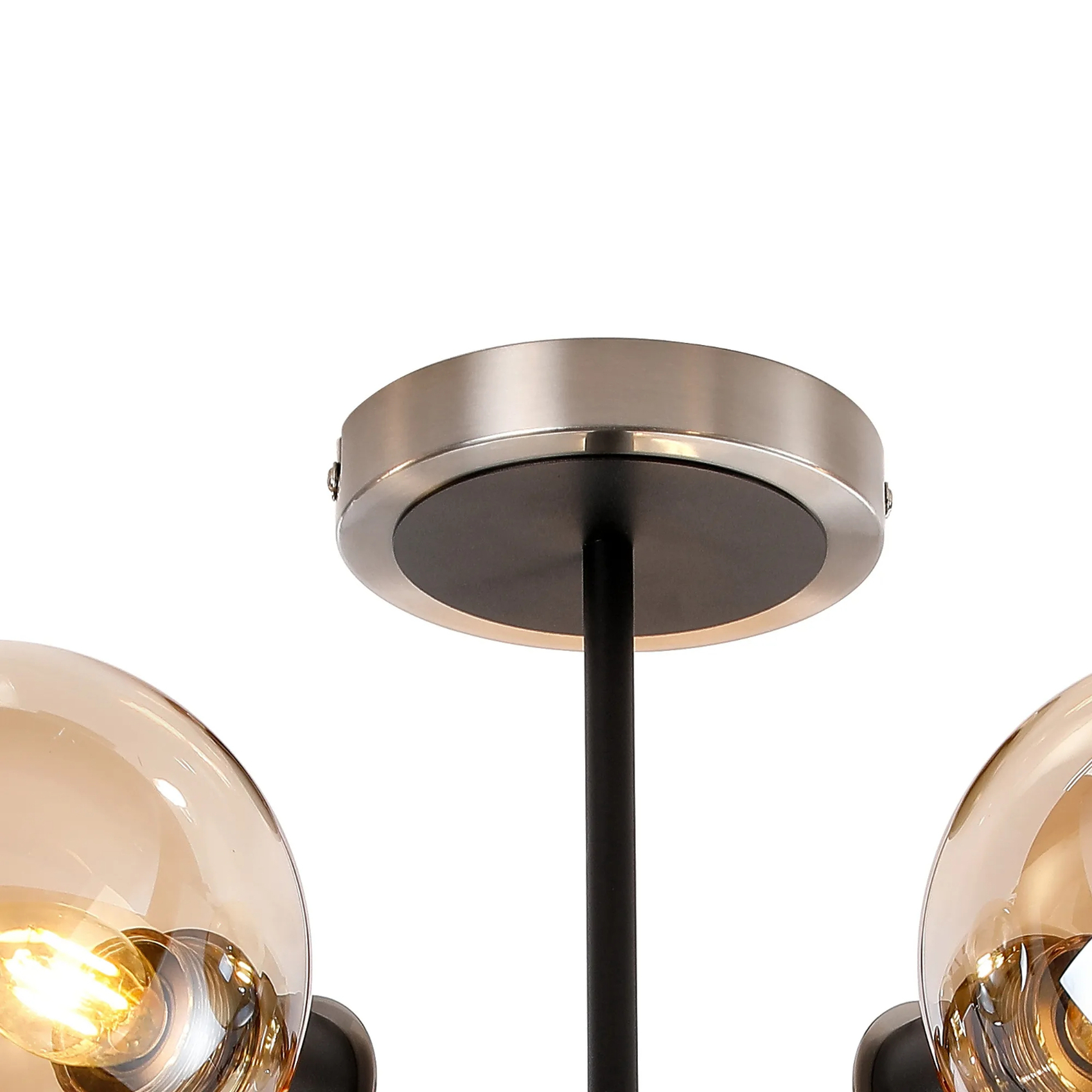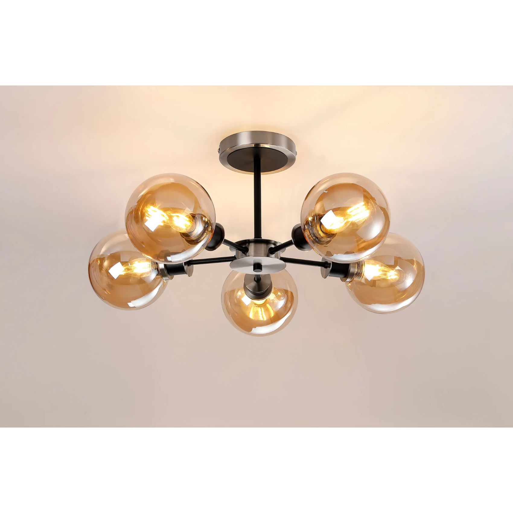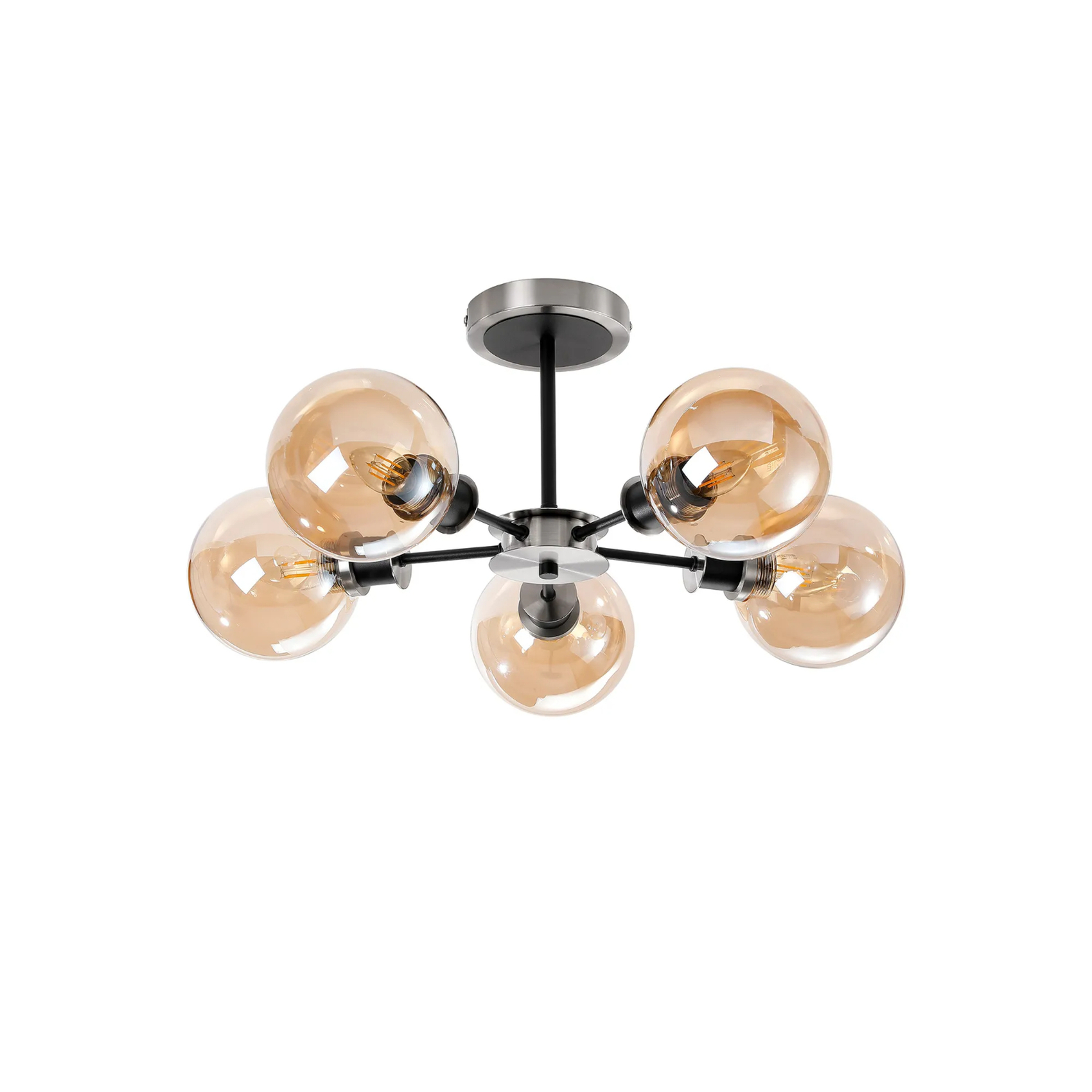 Idolite Haughton IP Semi Ceiling, 5 x E14 With 15cm Round Glass Shade, Satin Nickel, Amber Plated & Satin Black | IDOMA/NS6099