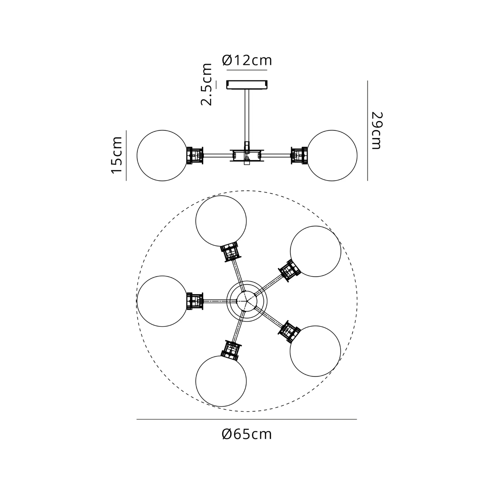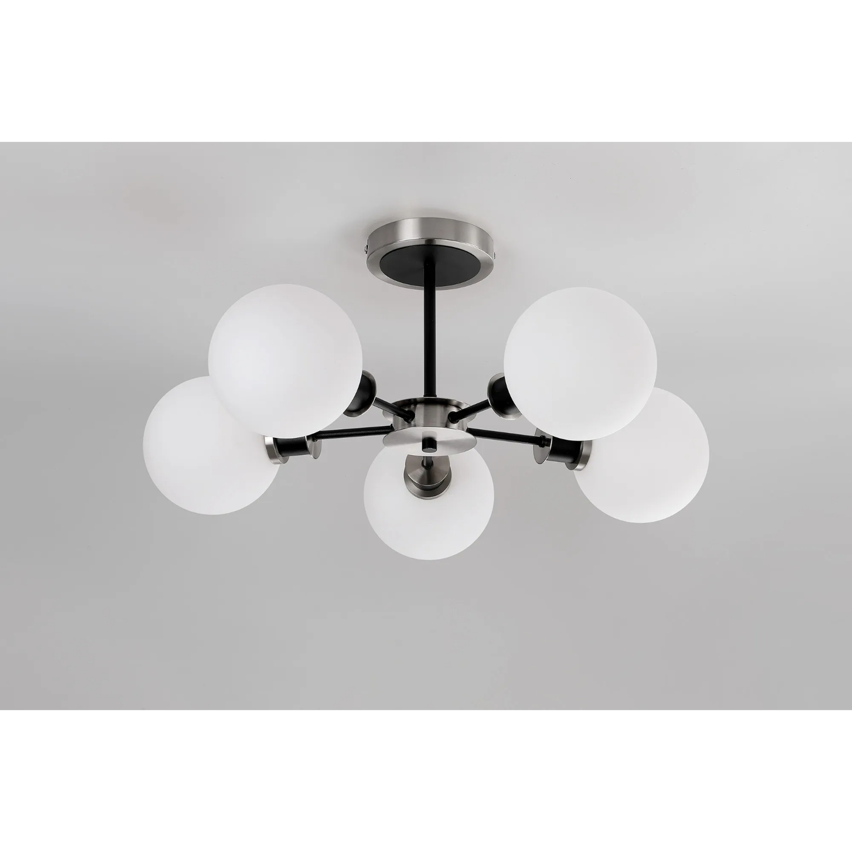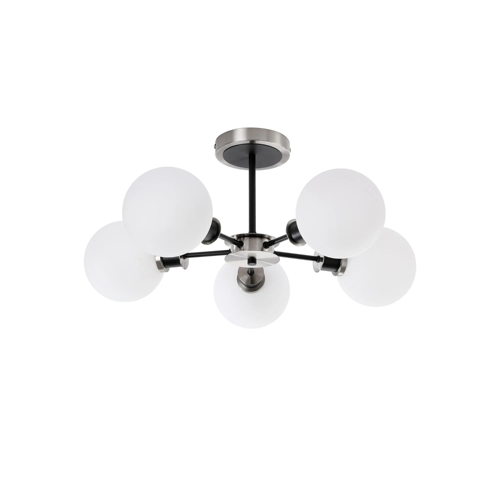 Idolite Haughton IP Semi Ceiling, 5 x E14 With 15cm Round Glass Shade, Satin Nickel, Opal & Satin Black | IDOPO/NS6099