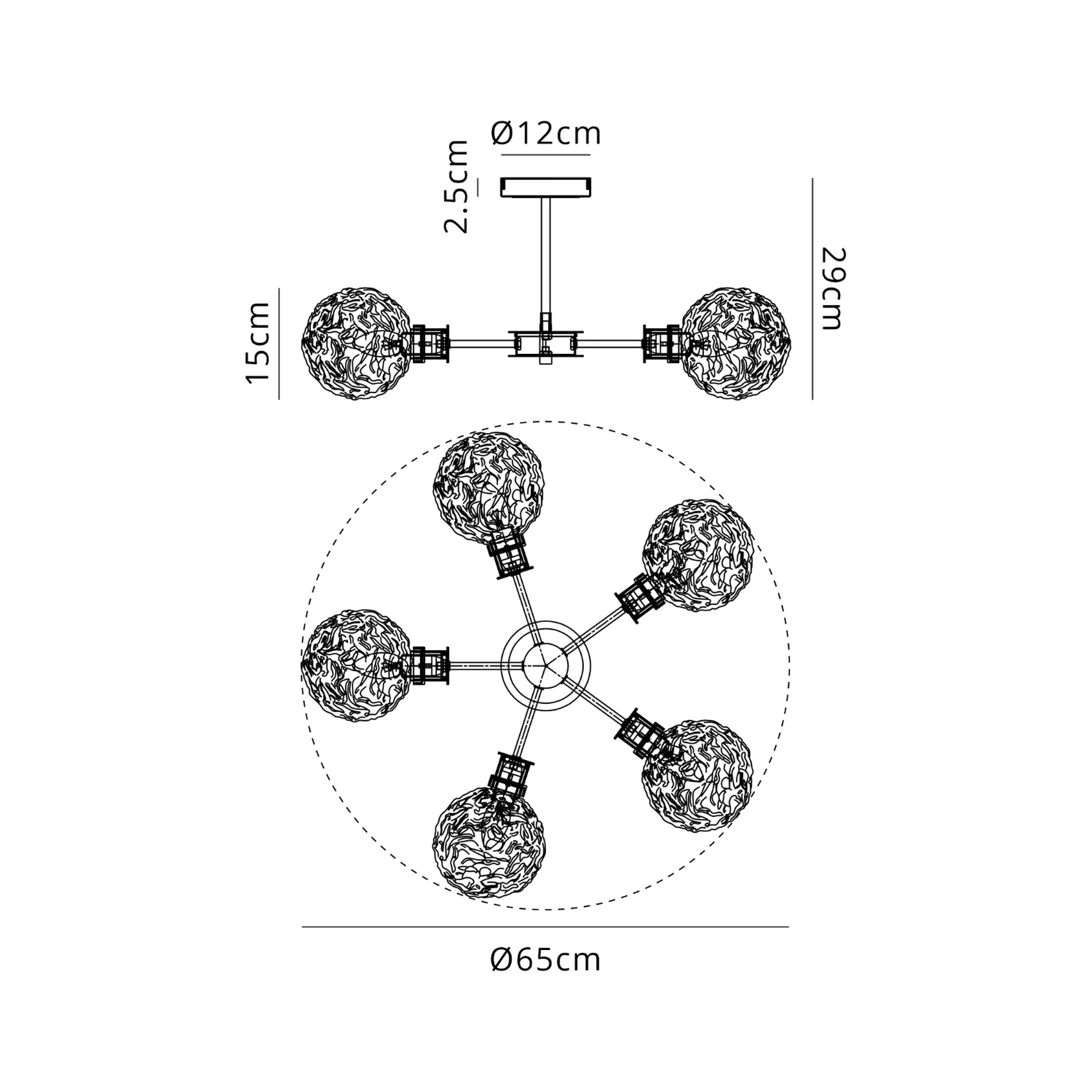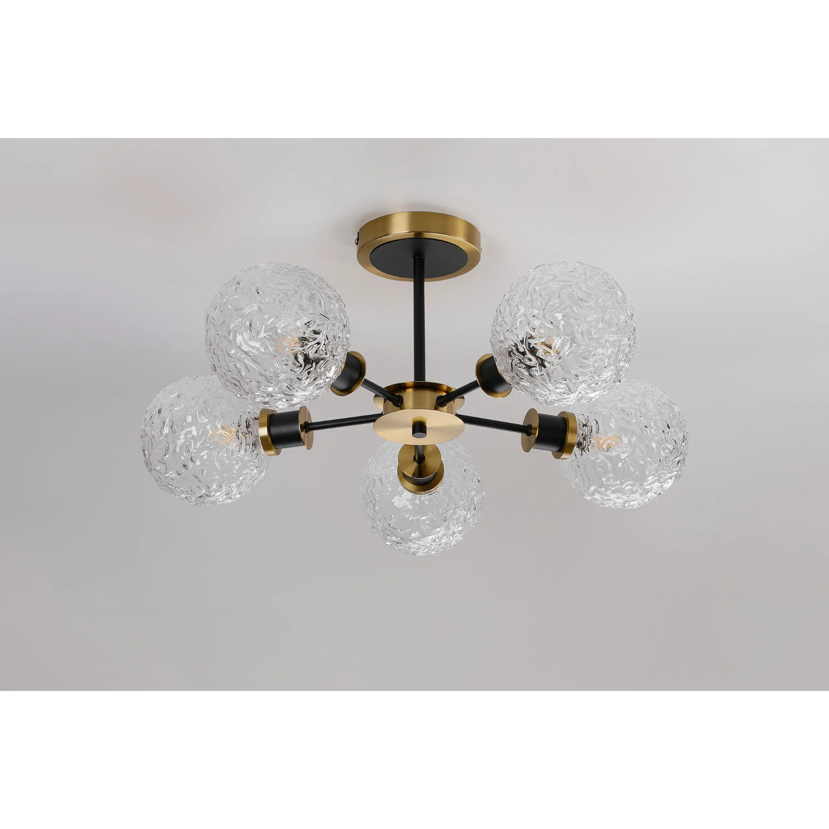 Idolite Haughton IP Semi Ceiling, 5 x E14 With 15cm Round Textured Crumple Glass Shade, Brass, Clear & Satin Black | IDOLCPRC/RB6099