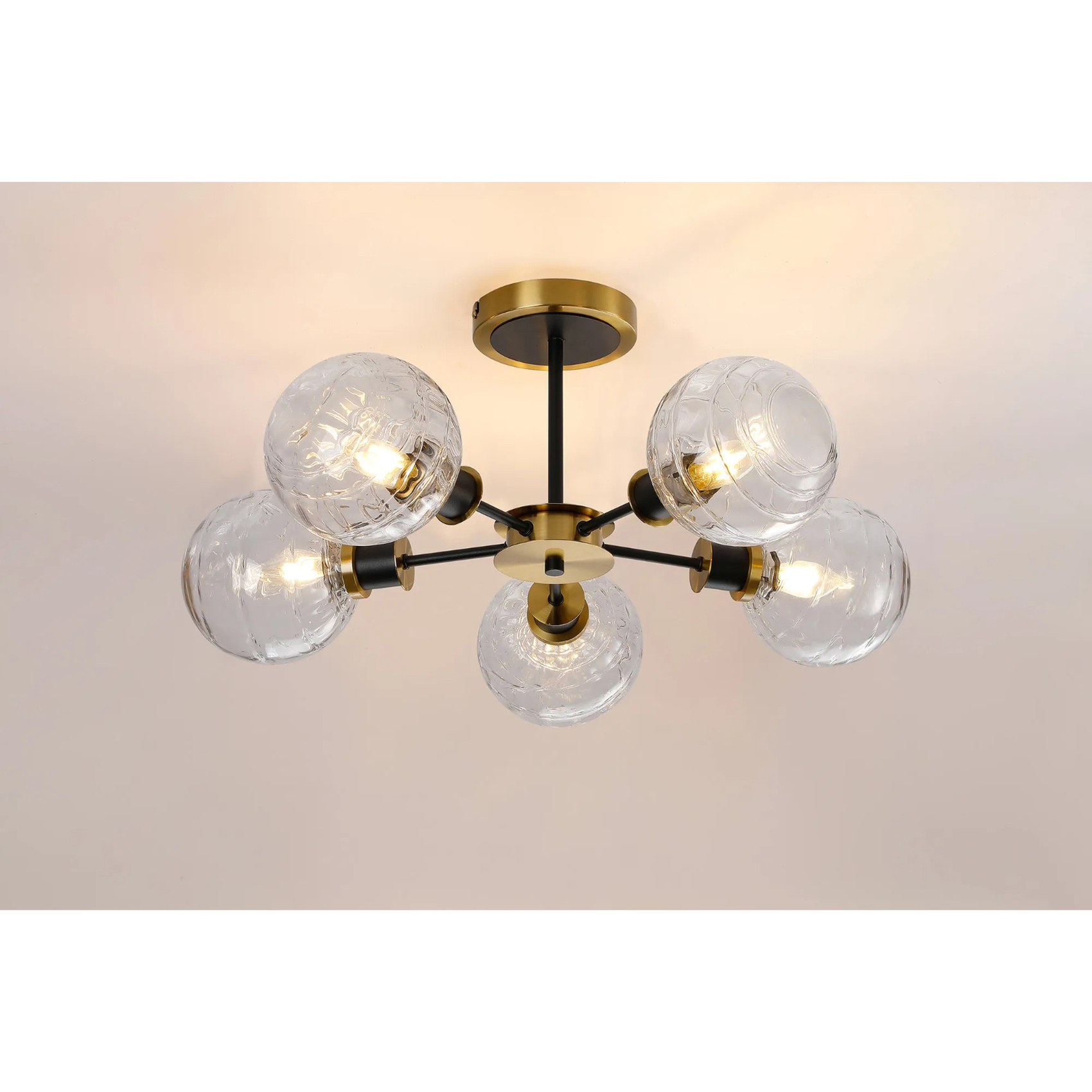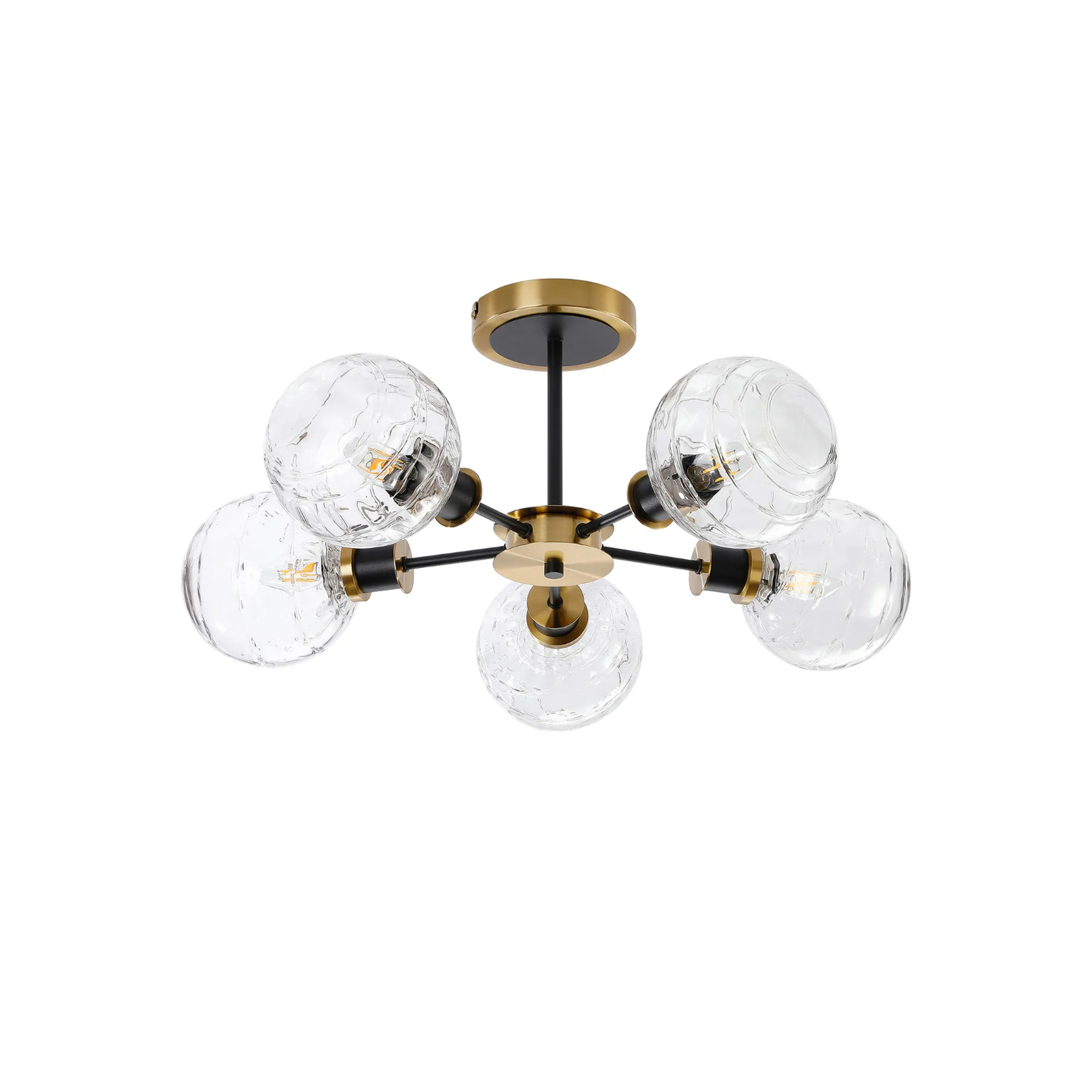 Idolite Haughton IP Semi Ceiling, 5 x E14 With 15cm Round Textured Melting Glass Shade, Brass, Clear & Satin Black | IDOLCTLM/RB6099