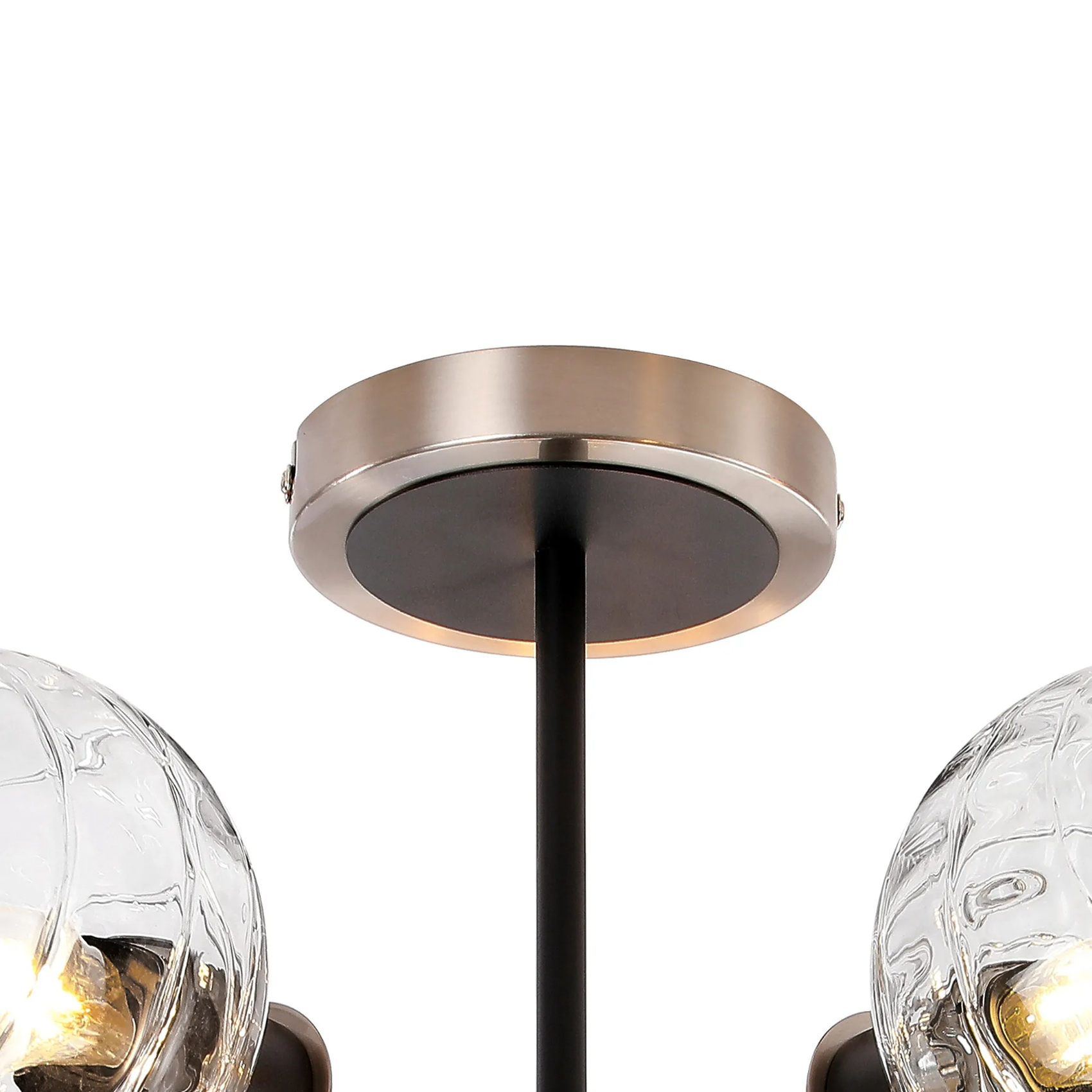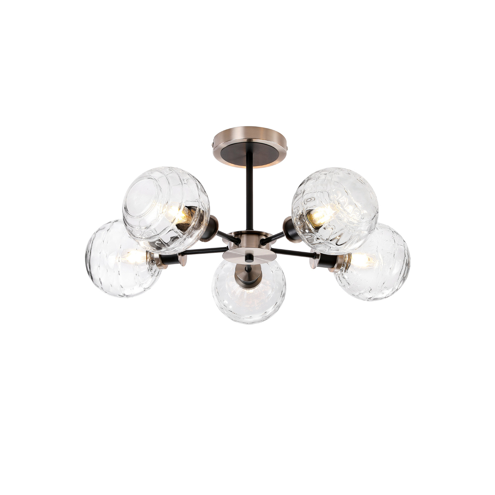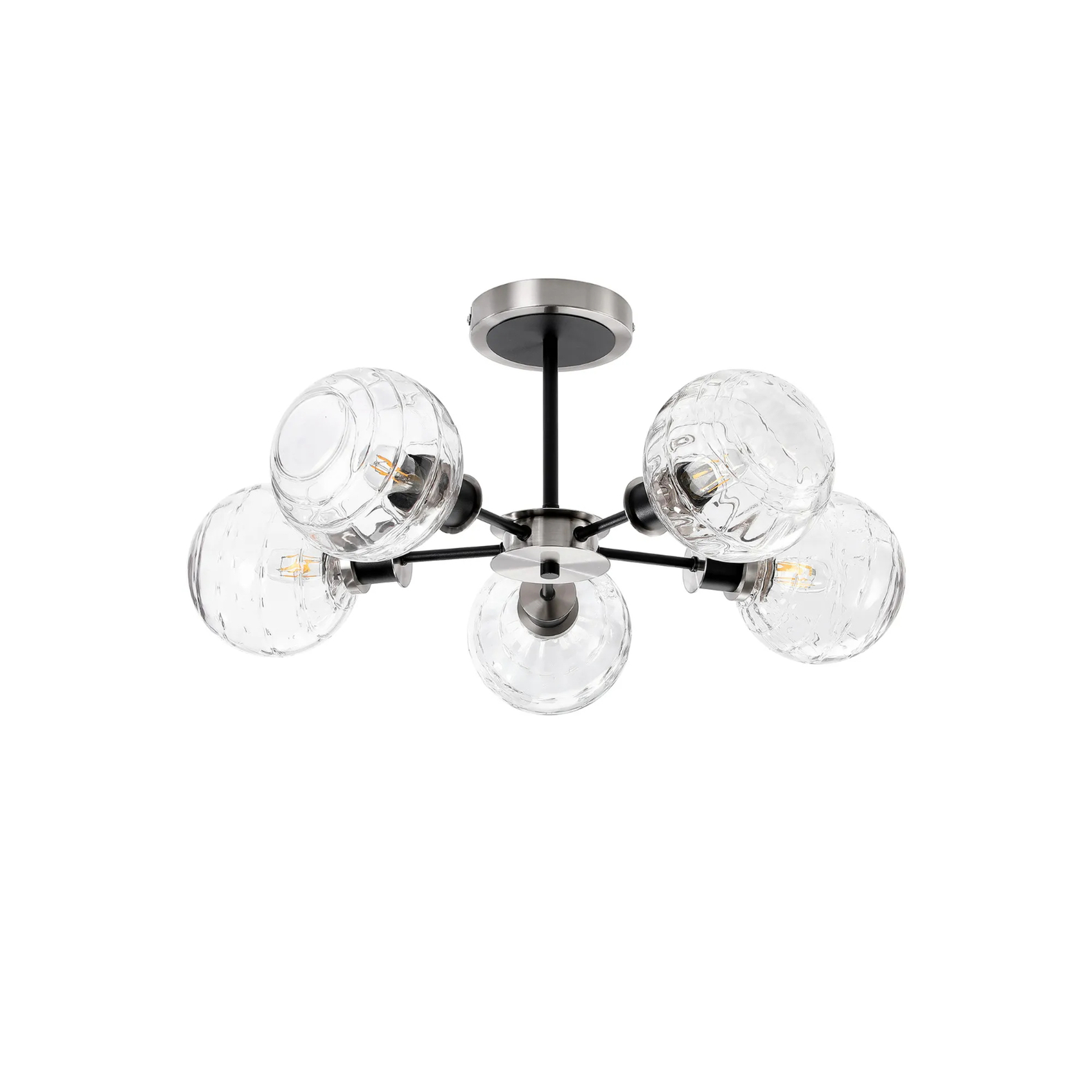 Idolite Haughton IP Semi Ceiling, 5 x E14 With 15cm Round Textured Melting Glass Shade, Satin Nickel, Clear & Satin Black | IDOLCTLM/NS6099