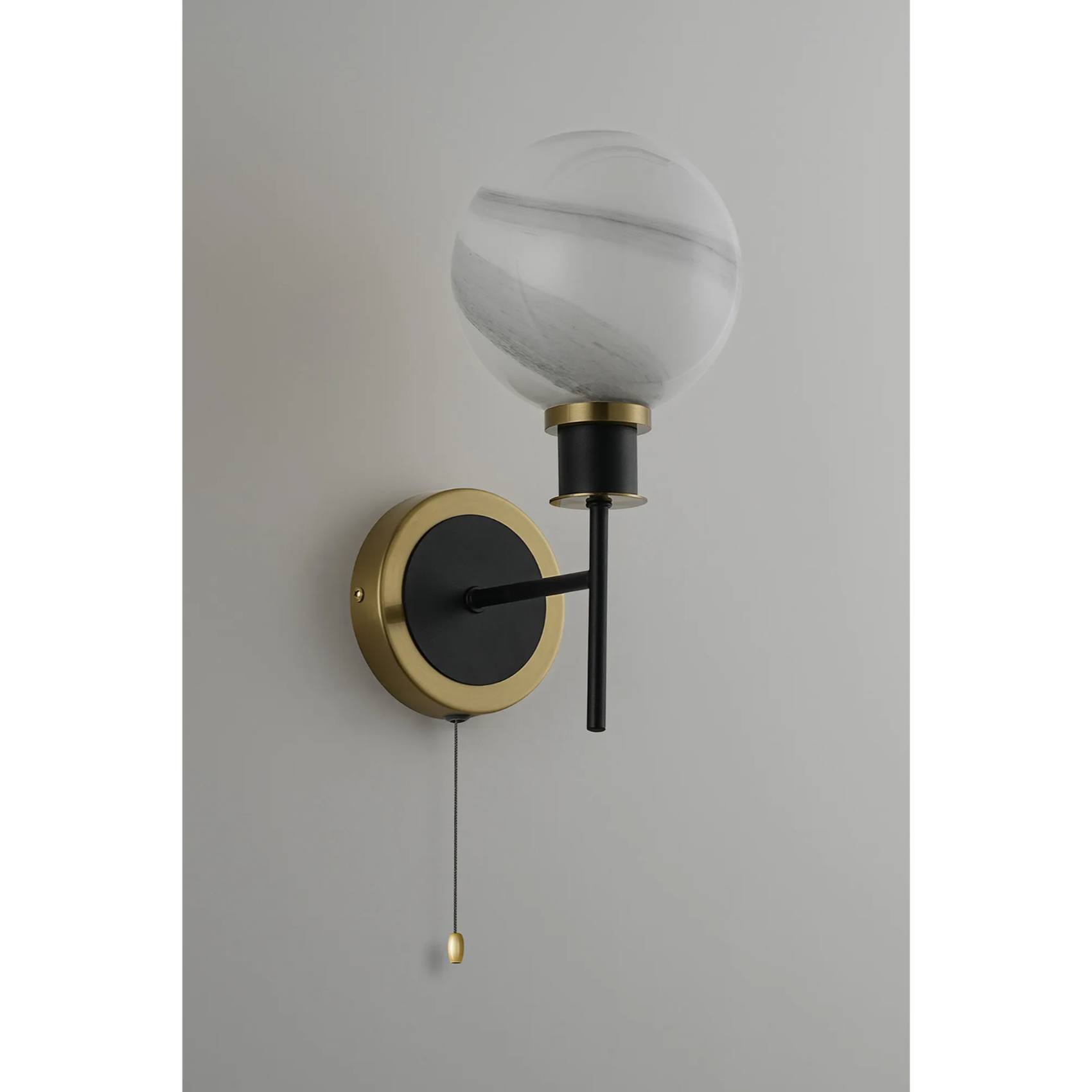 Idolite Haughton IP Switched Wall Light, 1 x E14 With 15cm Round Marble Effect Glass Shade, Brass, White & Satin Black | IDOYG/HWLBM/RB7099