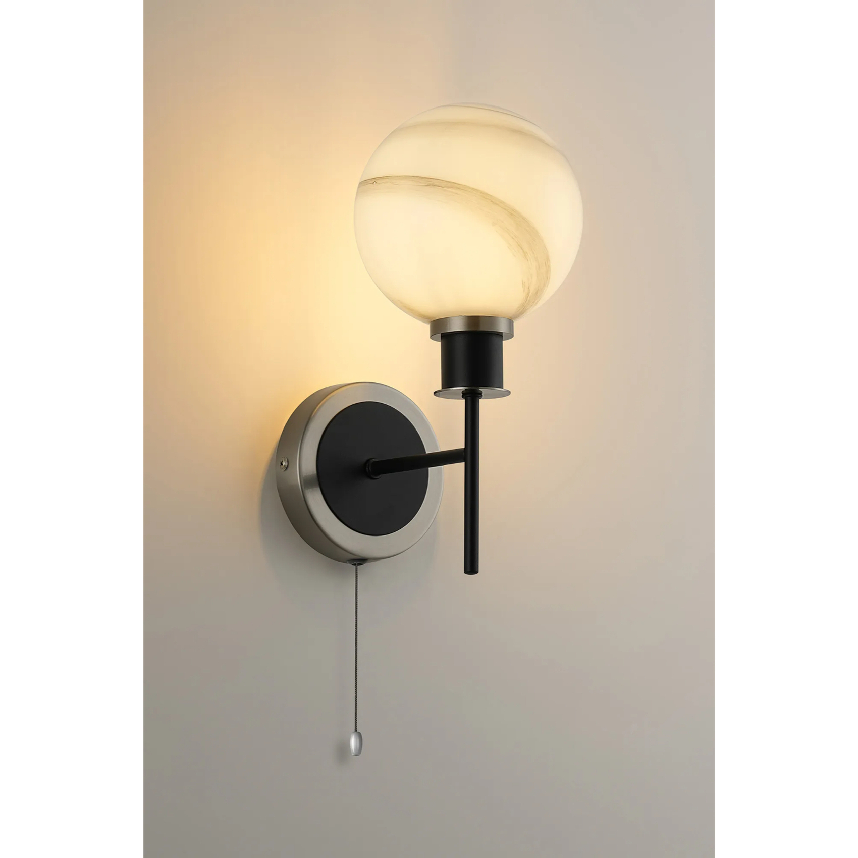 Idolite Haughton IP Switched Wall Light, 1 x E14 With 15cm Round Marble Effect Glass Shade, Satin Nickel, White & Satin Black | IDOYG/HWLBM/NS7099