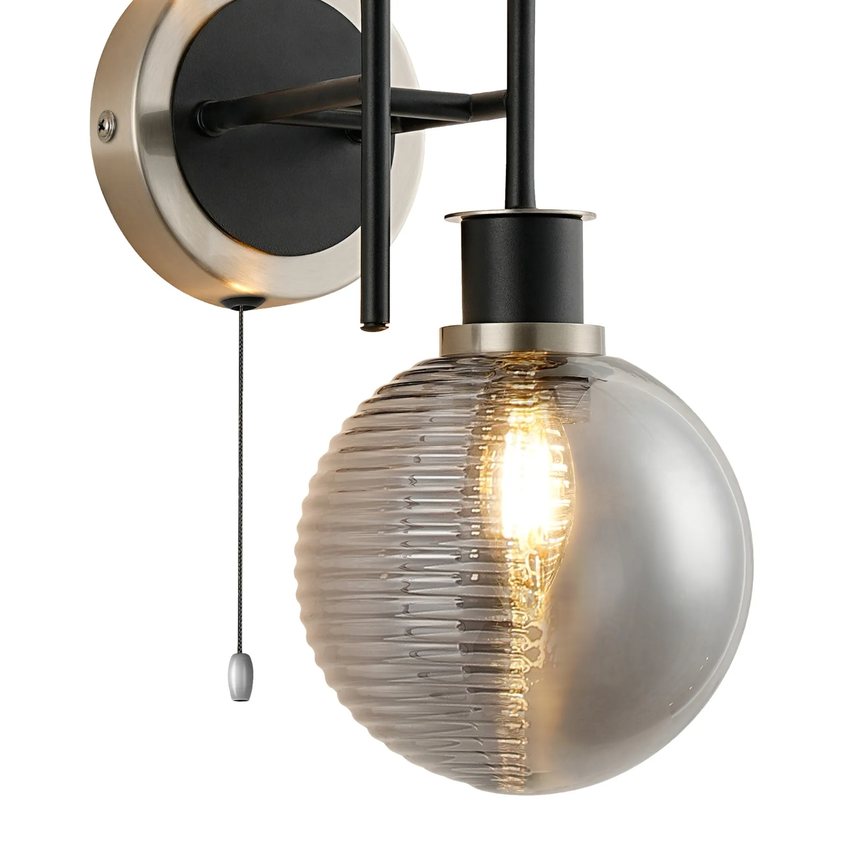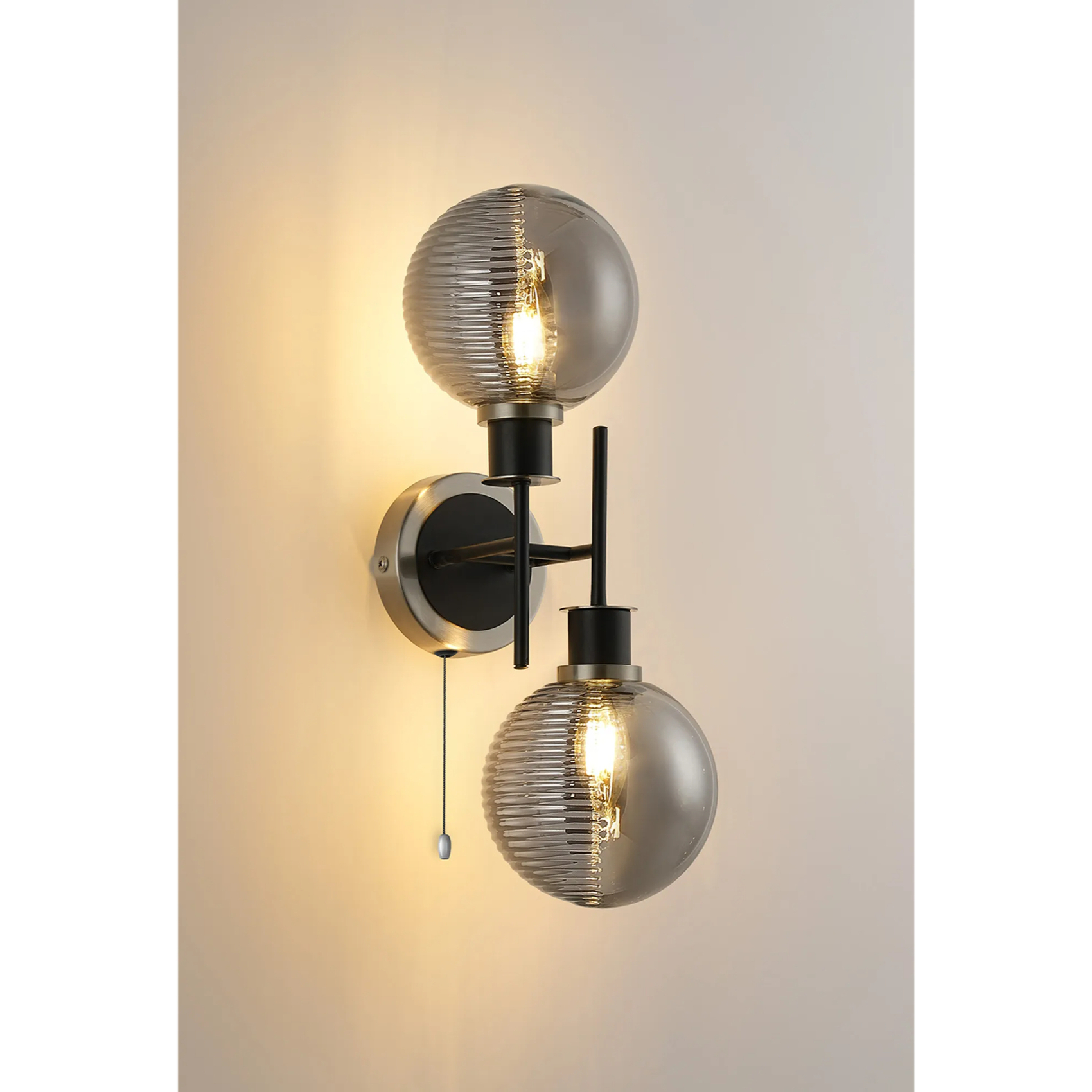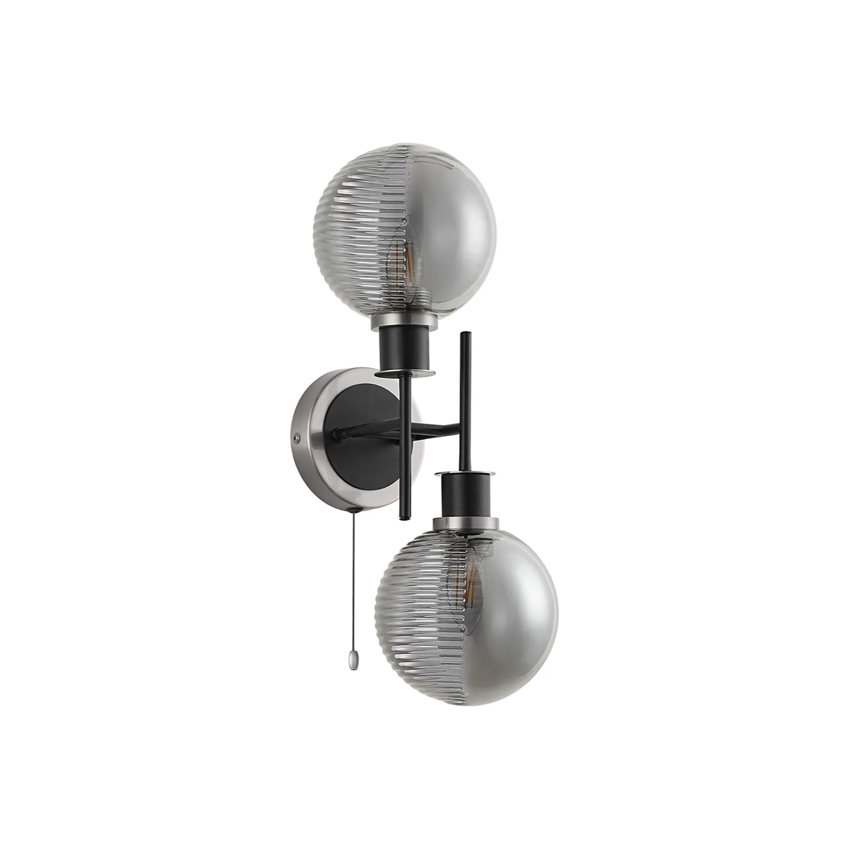 Idolite Haughton IP Switched Wall Light, 2 Light E14 IP44 With 15cm Round Double Textured Smooth/Ribbed Shade, Satin Nickel, Smoke Plated/Satin Black | IDOMSBRS/NS8099