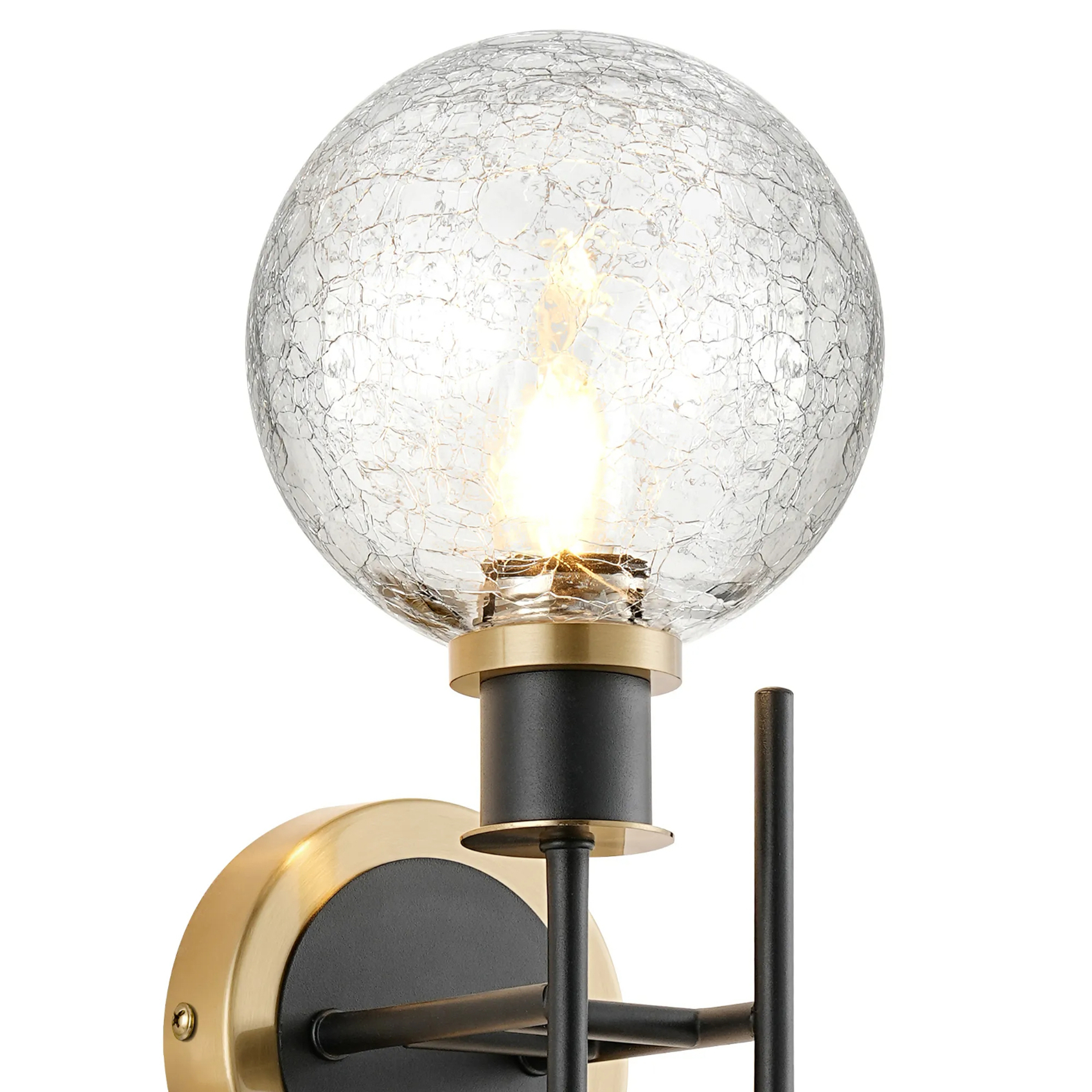 Idolite Haughton IP Switched Wall Light, 2 x E14 With 15cm Round Crackled Glass Shade, Brass, Clear & Satin Black | IDOLCKRC/RB8099