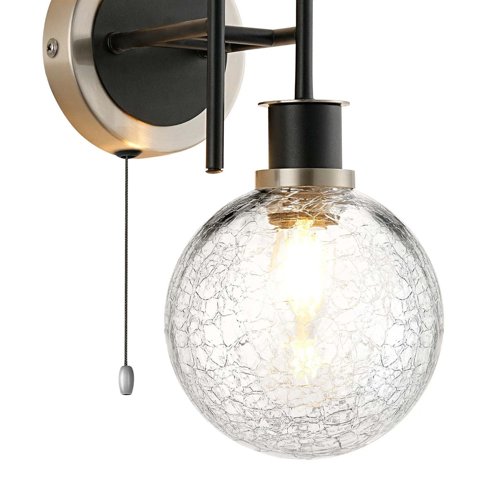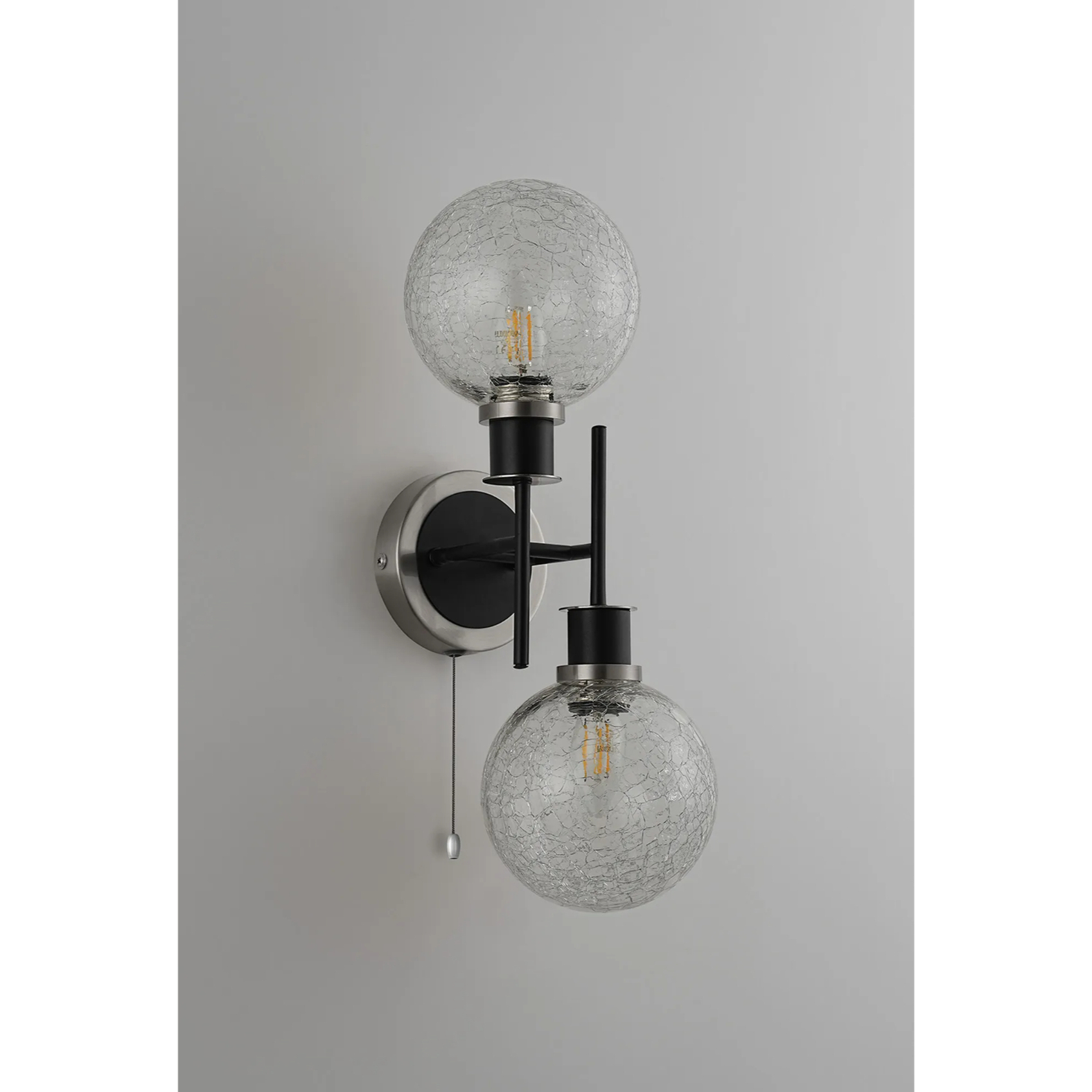 Idolite Haughton IP Switched Wall Light, 2 x E14 With 15cm Round Crackled Glass Shade, Satin Nickel, Clear & Satin Black | IDOLCKRC/NS8099