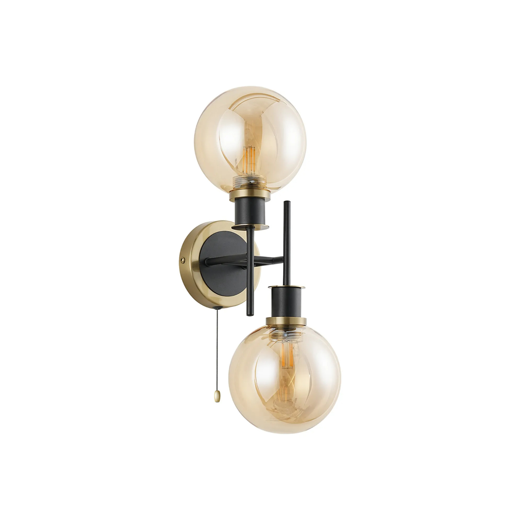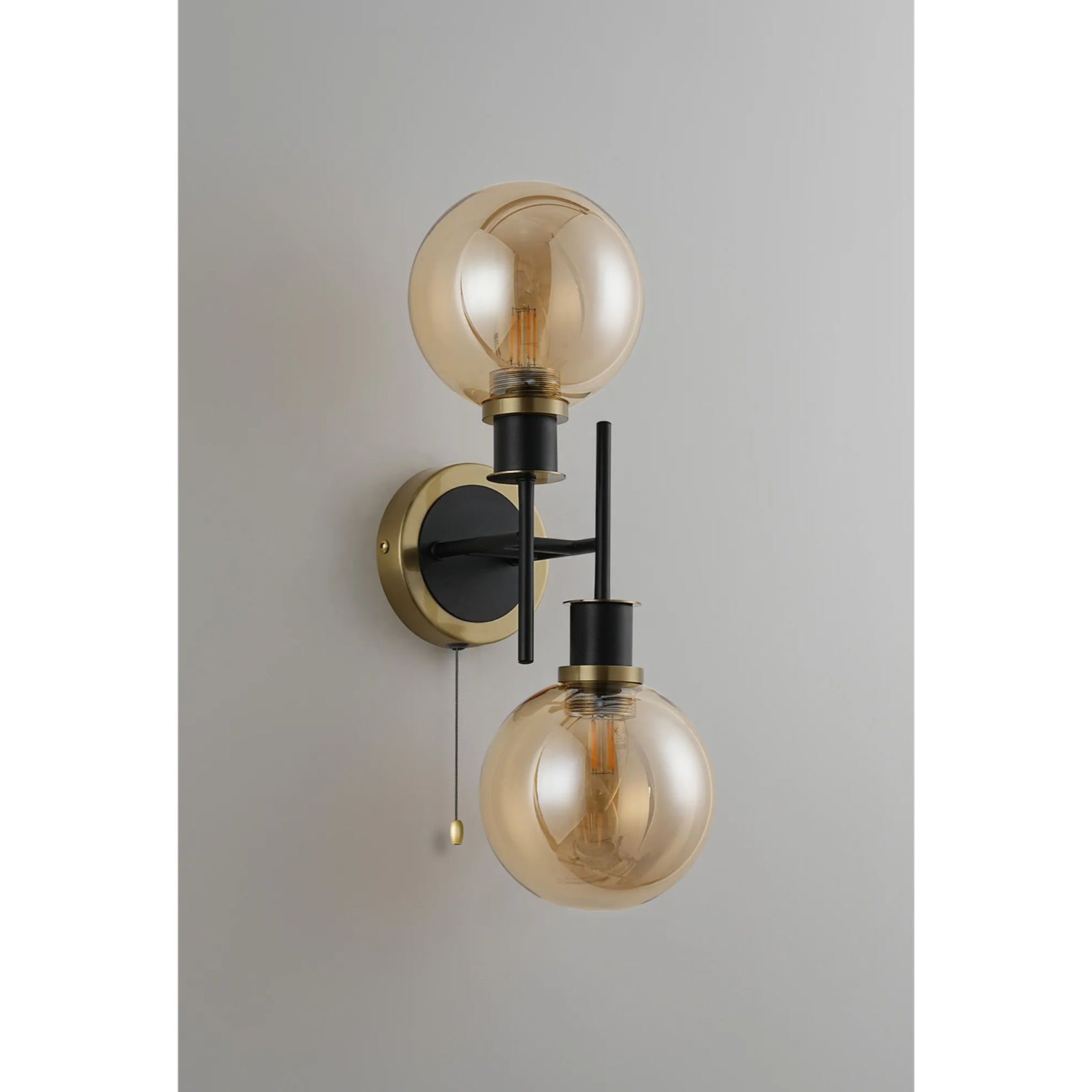 Idolite Haughton IP Switched Wall Light, 2 x E14 With 15cm Round Glass Shade, Brass, Amber Plated & Satin Black | IDOMA/RB8099