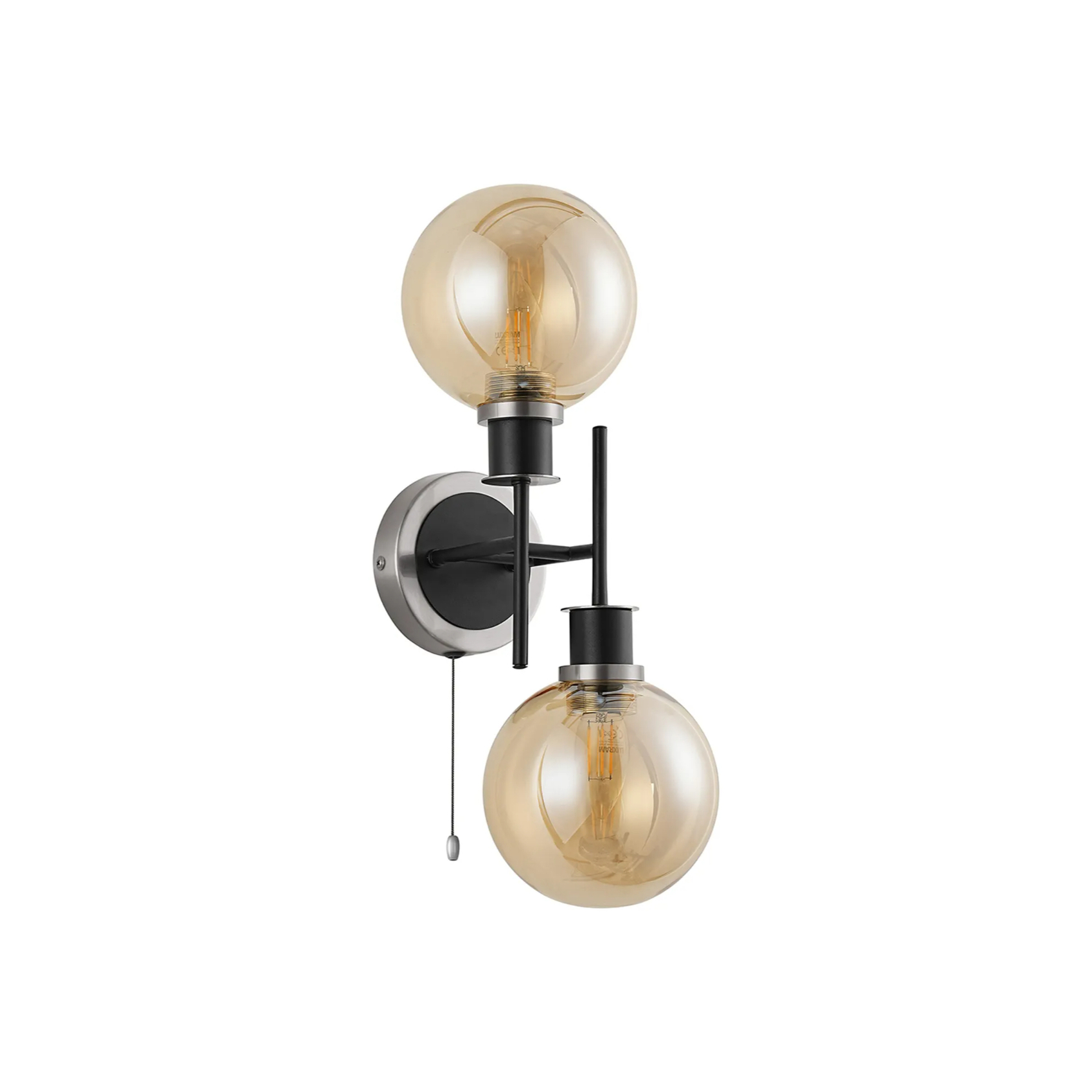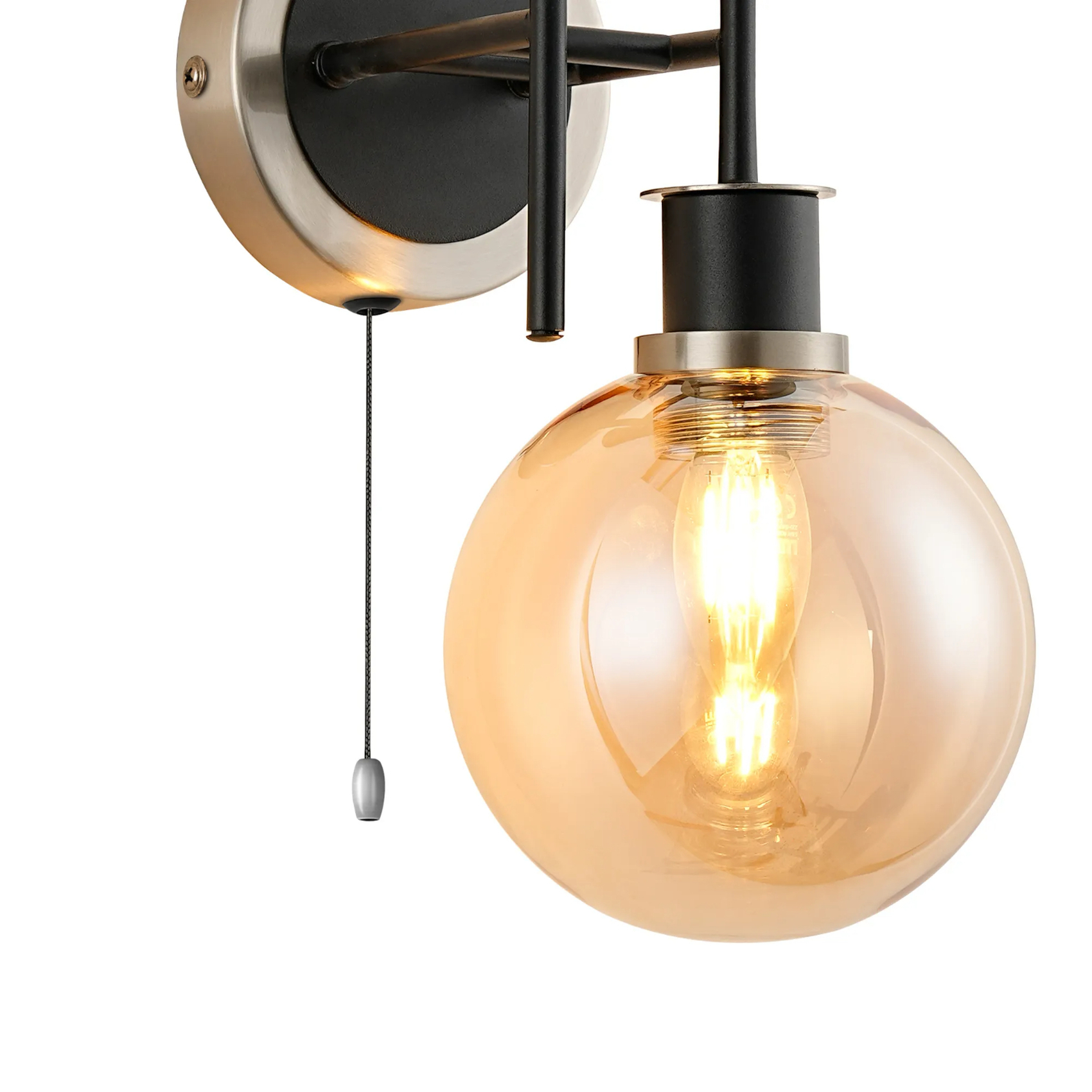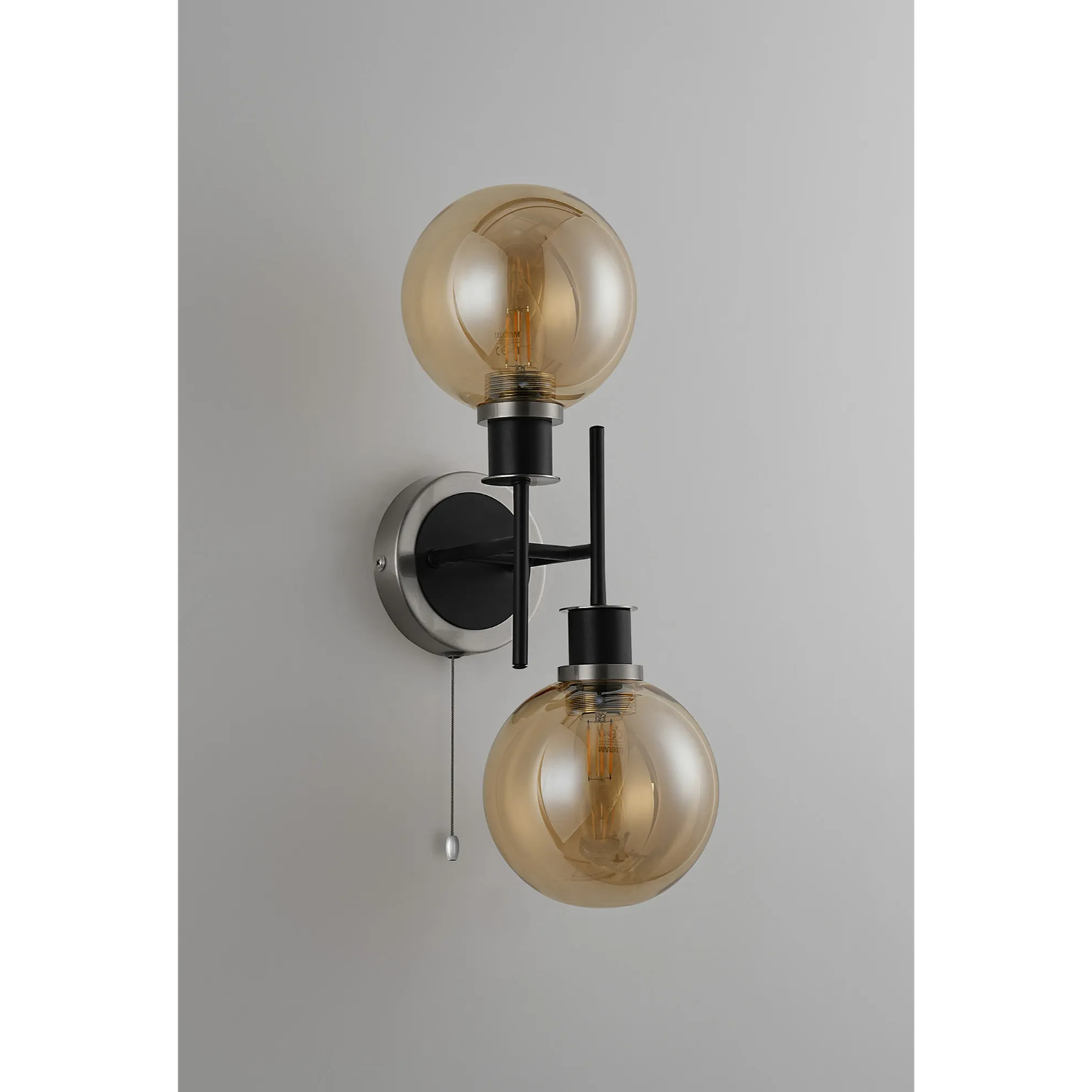 Idolite Haughton IP Switched Wall Light, 2 x E14 With 15cm Round Glass Shade, Satin Nickel, Amber Plated & Satin Black | IDOMA/NS8099