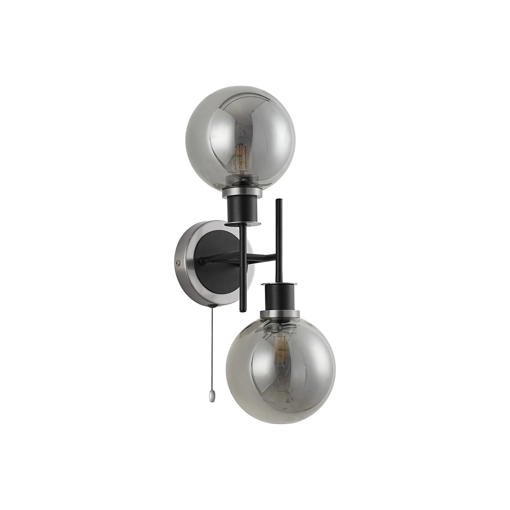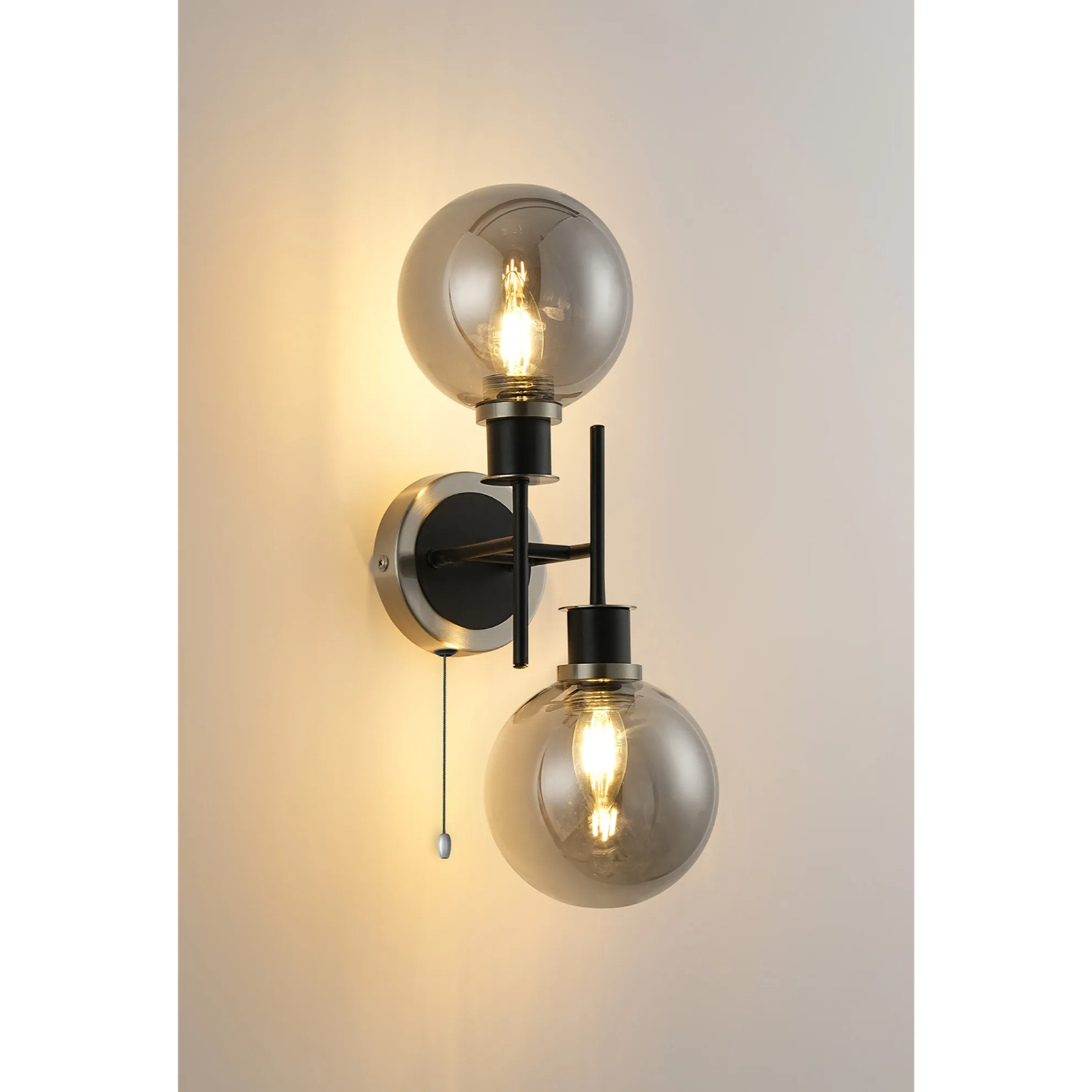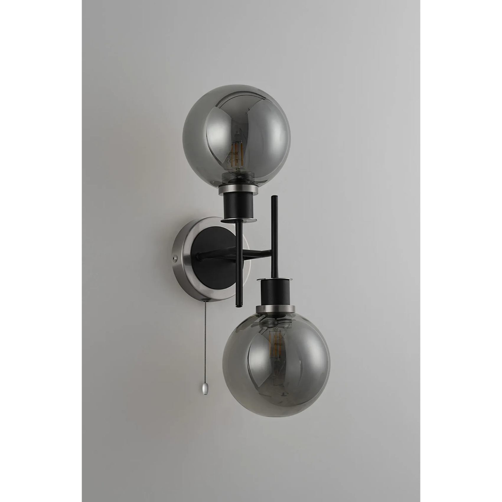Idolite Haughton IP Switched Wall Light, 2 x E14 With 15cm Round Glass Shade, Satin Nickel, Smoke Plated & Satin Black | IDOMS/NS8099