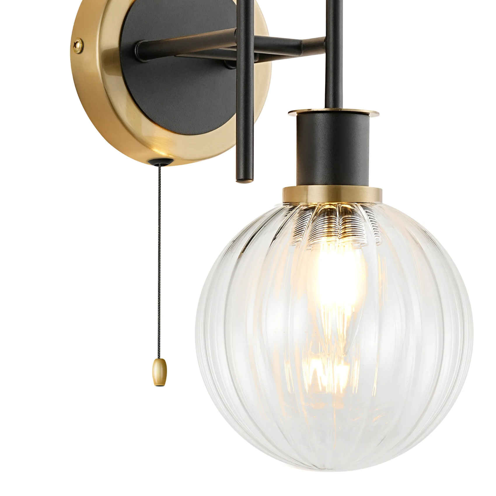 Idolite Haughton IP Switched Wall Light, 2 x E14 With 15cm Round Segment Glass Shade, Brass, Clear & Satin Black | IDOLCGES/RB8099