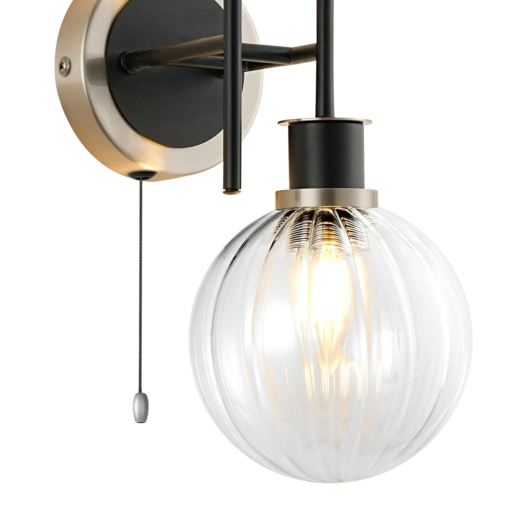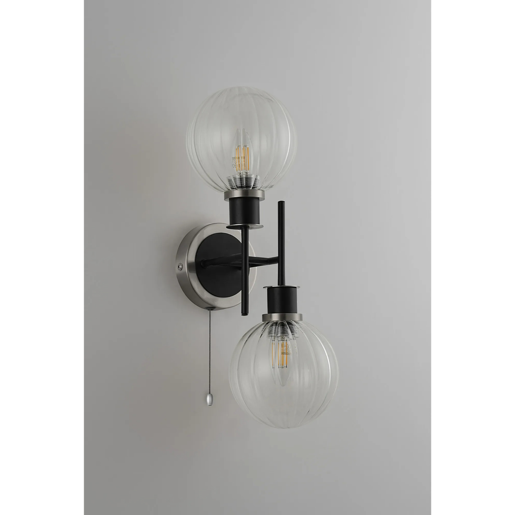 Idolite Haughton IP Switched Wall Light, 2 x E14 With 15cm Round Segment Glass Shade, Satin Nickel, Clear & Satin Black | IDOLCGES/NS8099