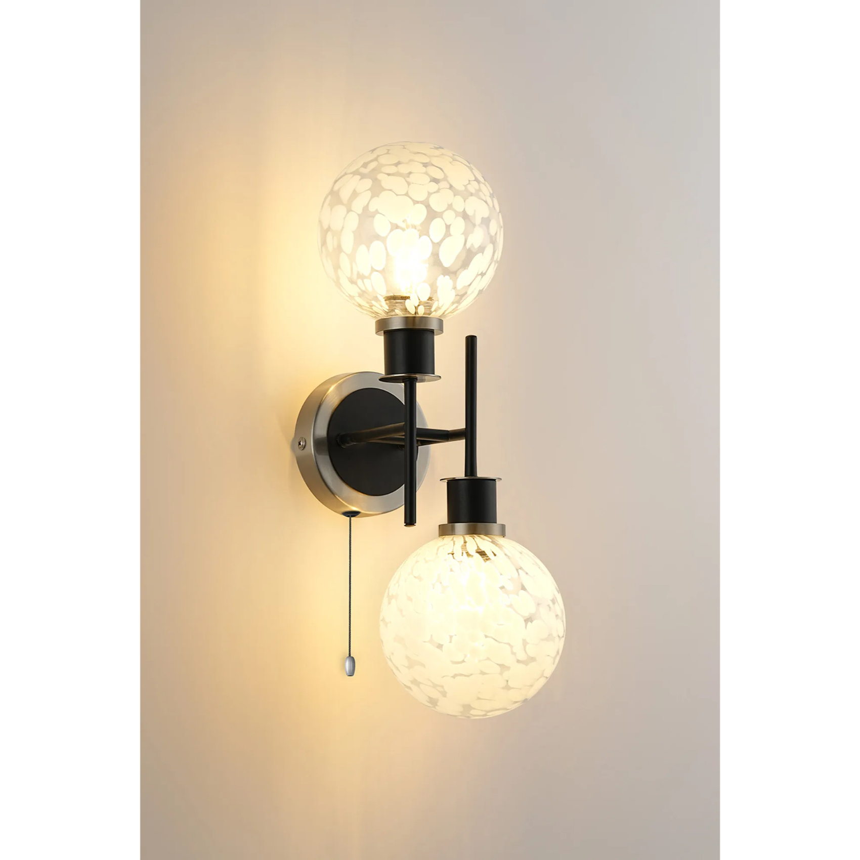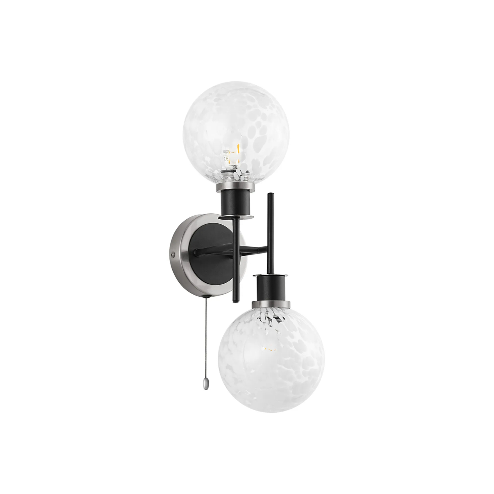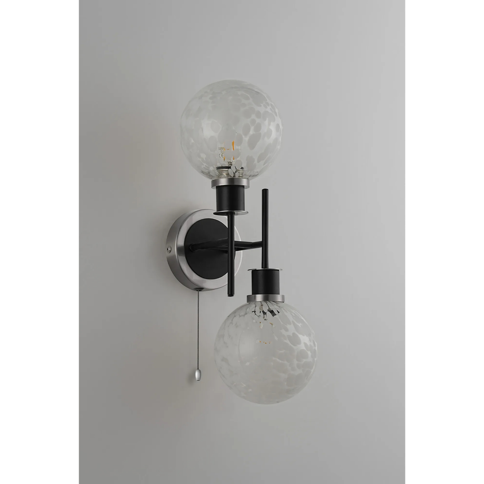 Idolite Haughton IP Switched Wall Light, 2 x E14 With 15cm Round Speckled Glass Shade, Satin Nickel, White & Satin Black | IDOLC/HWKPS/NS8099
