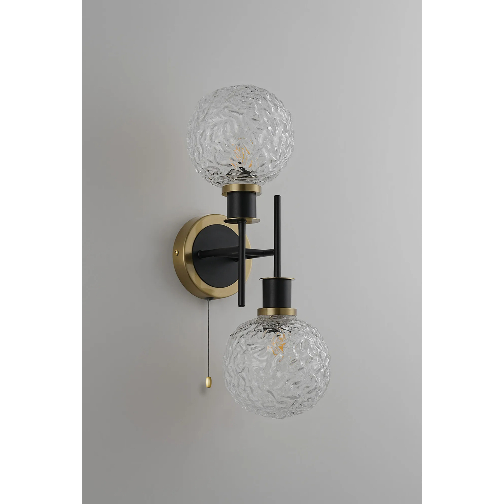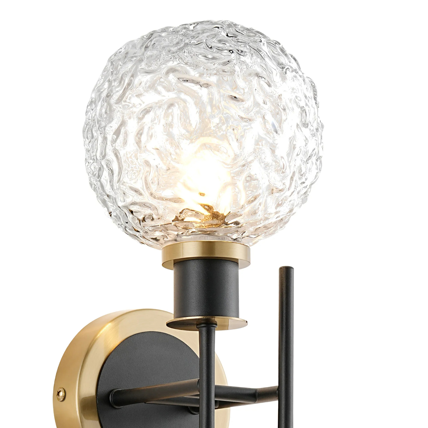 Idolite Haughton IP Switched Wall Light, 2 x E14 With 15cm Round Textured Crumple Glass Shade, Brass, Clear & Satin Black | IDOLCPRC/RB8099