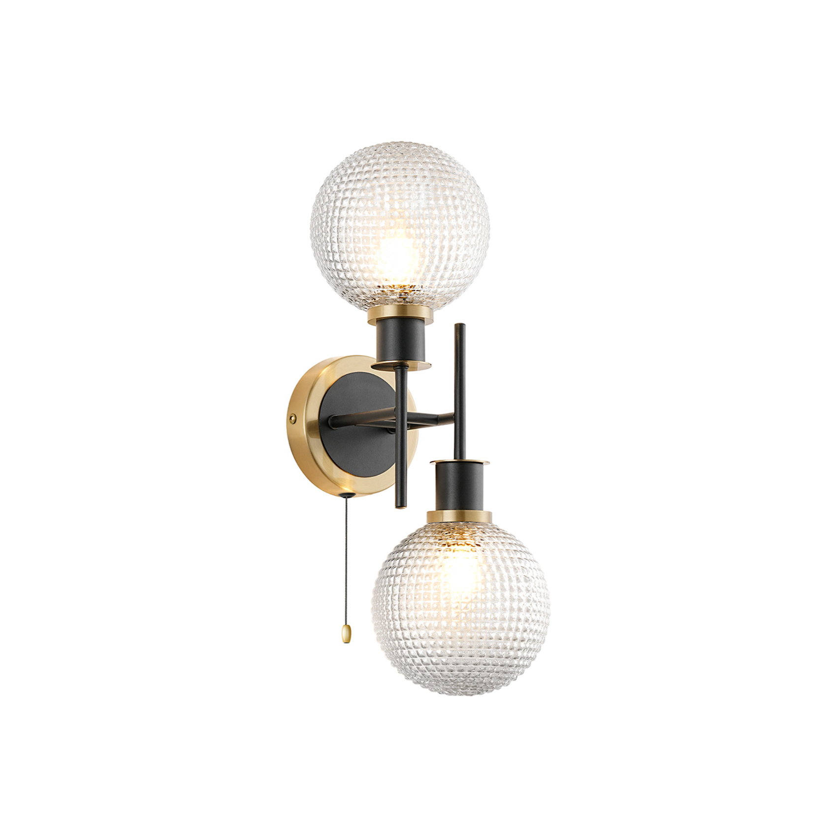Idolite Haughton IP Switched Wall Light, 2 x E14 With 15cm Round Textured Diamond Pattern Glass Shade, Brass, Clear & Satin Black | IDOLCAID/RB8099