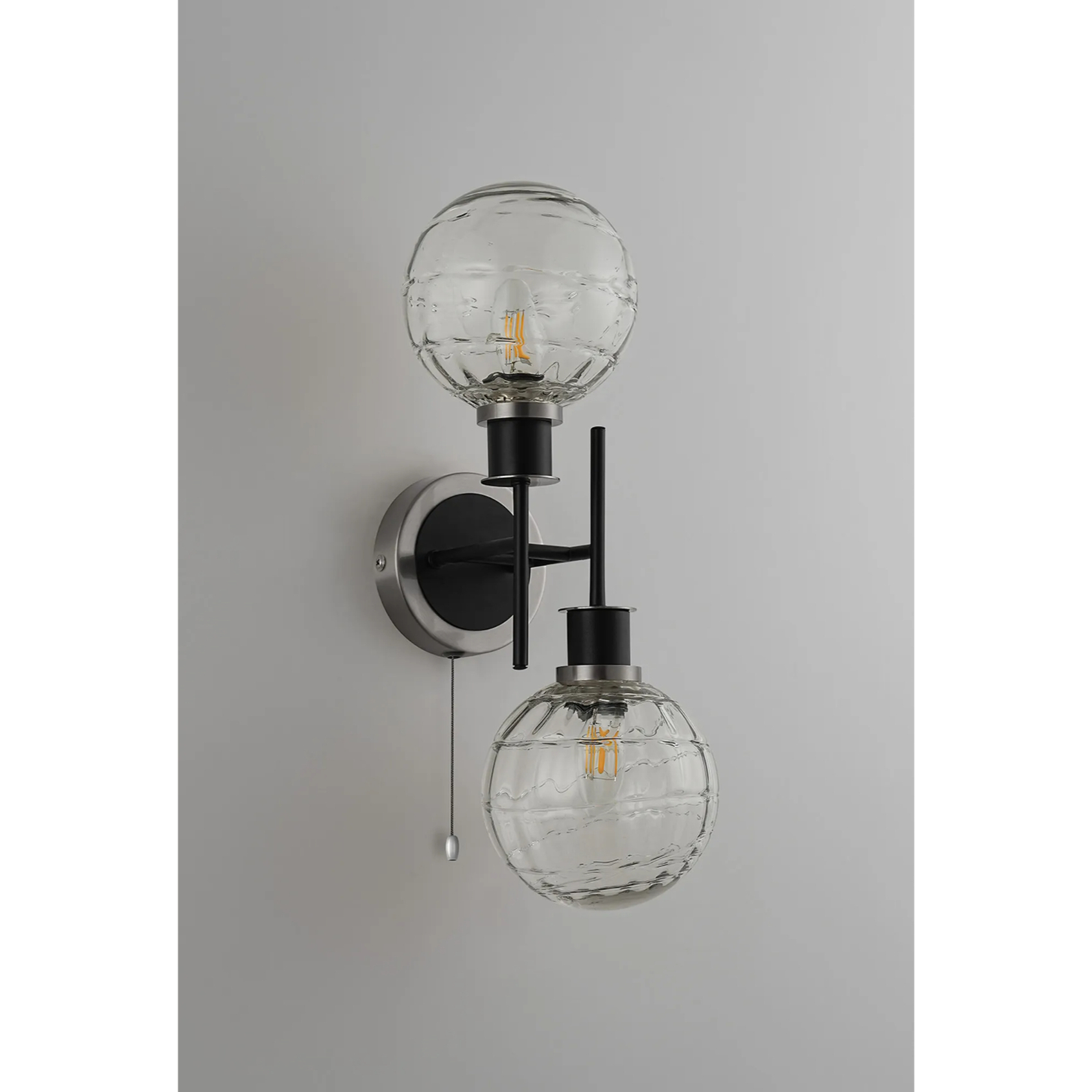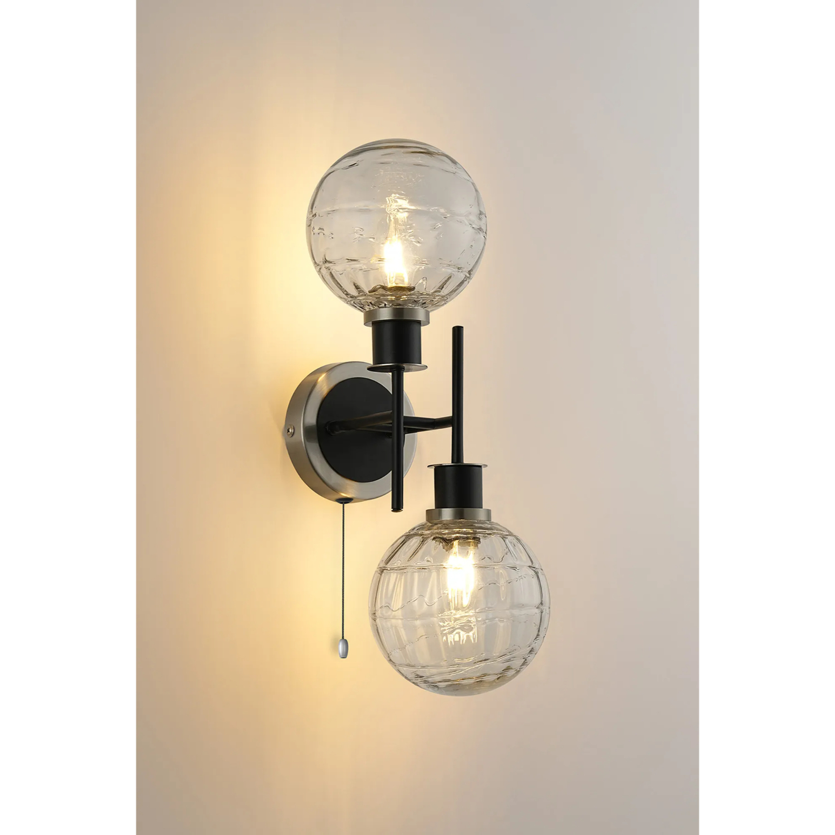 Idolite Haughton IP Switched Wall Light, 2 x E14 With 15cm Round Textured Melting Glass Shade, Satin Nickel, Clear & Satin Black | IDOLCTLM/NS8099