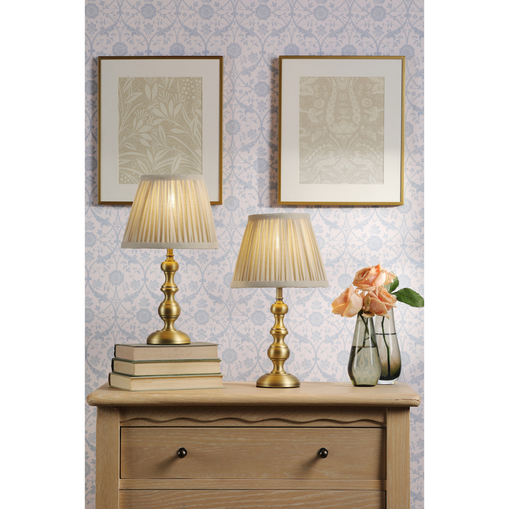 Laura Ashley Ezra Twin Pack of Antique Brass Table Lamps Complete With Pleated Oatmeal Shades - Switched | LA3756706-Q