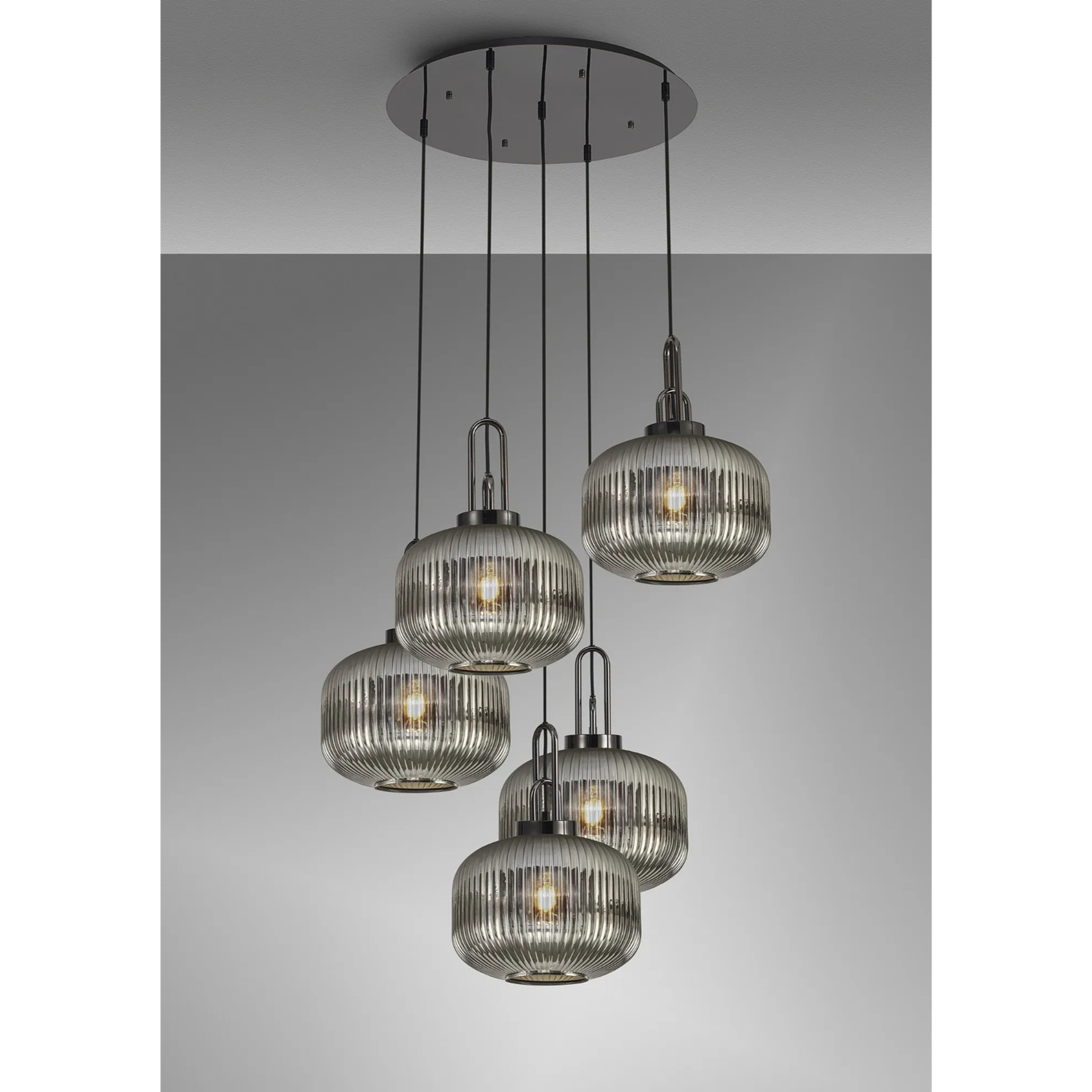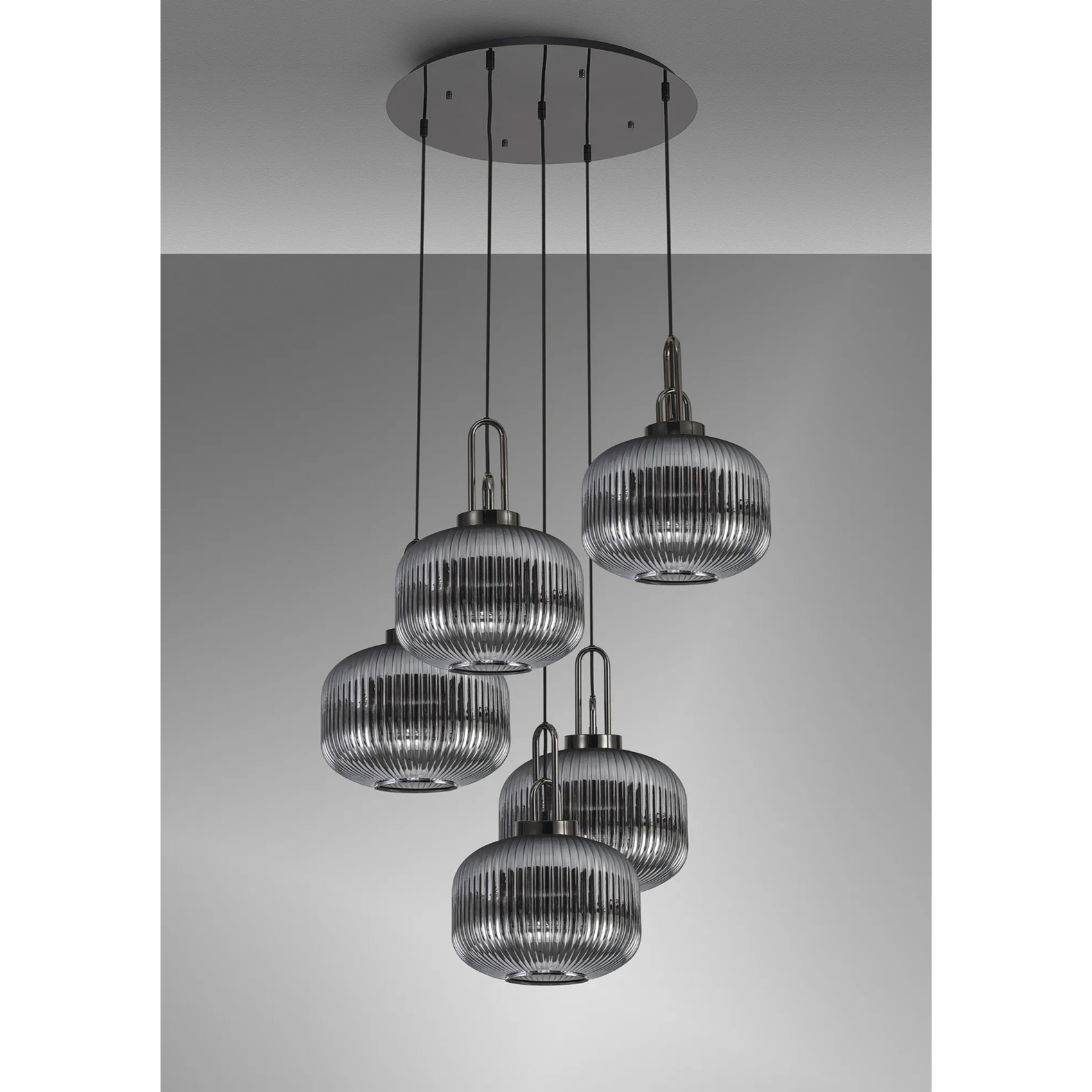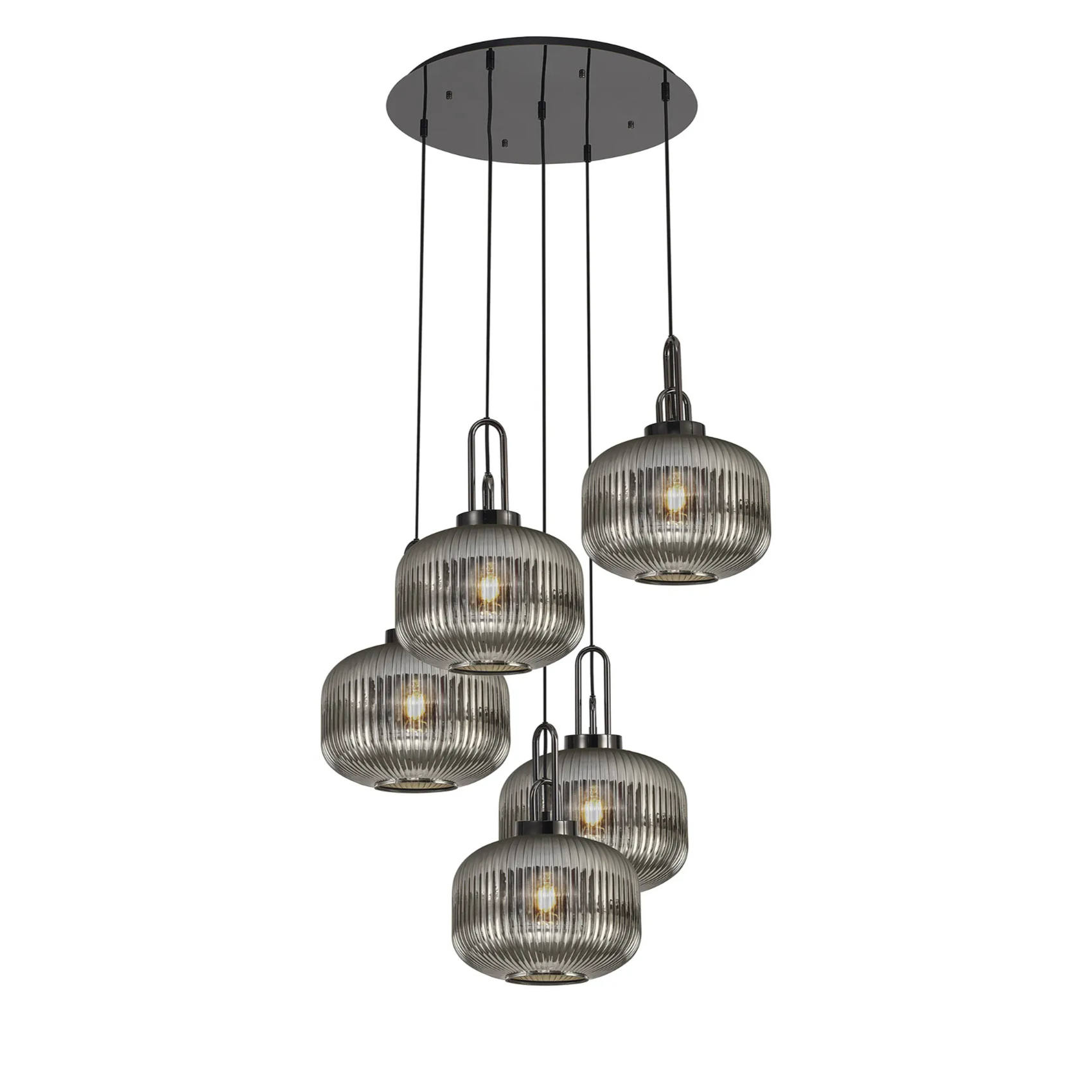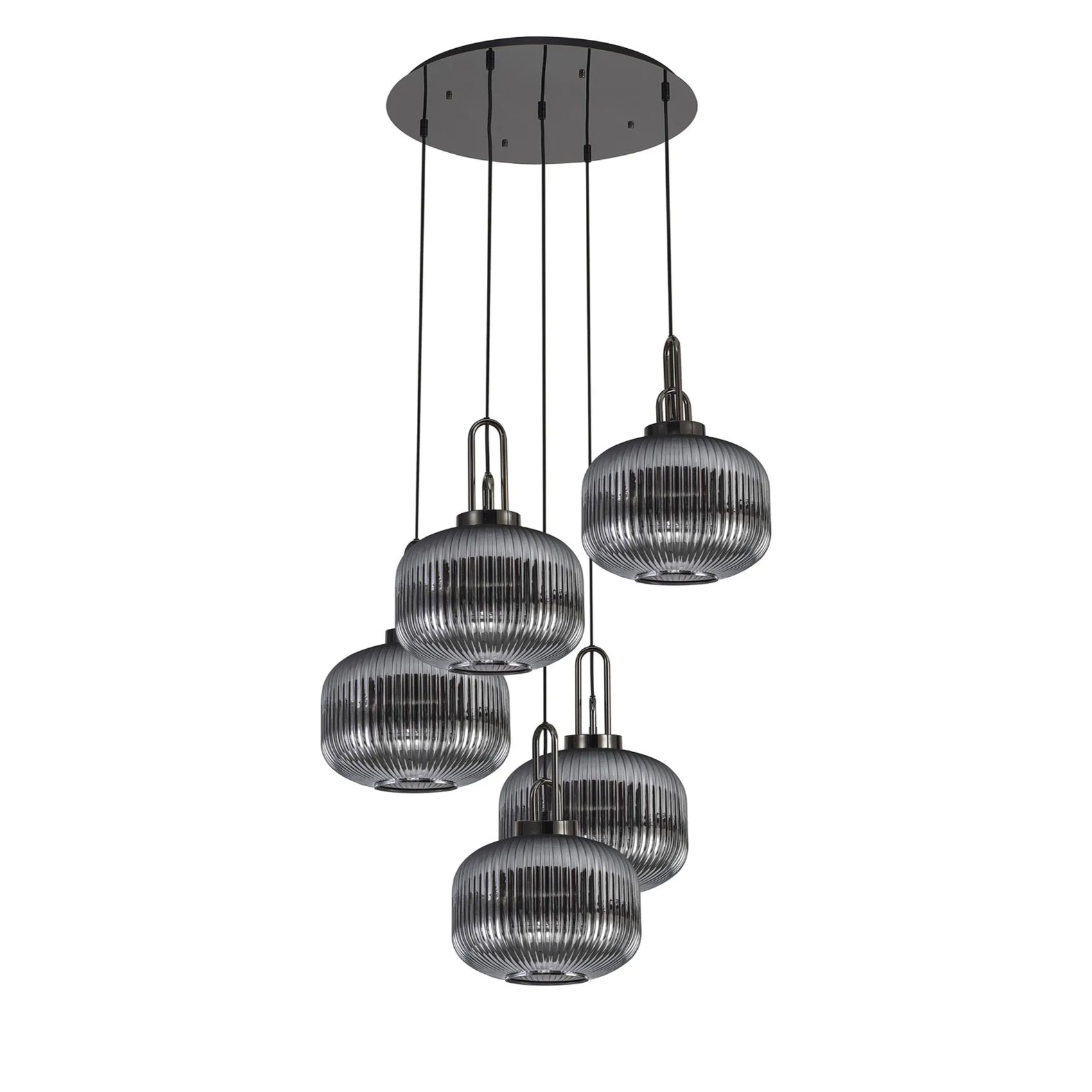 Idolite Camille 2.5m Round Pendant, 5 x E27, Black Chrome/Matt Black With 30cm Pumpkin Shaped Ribbed Smoked Glass | IDOK4960