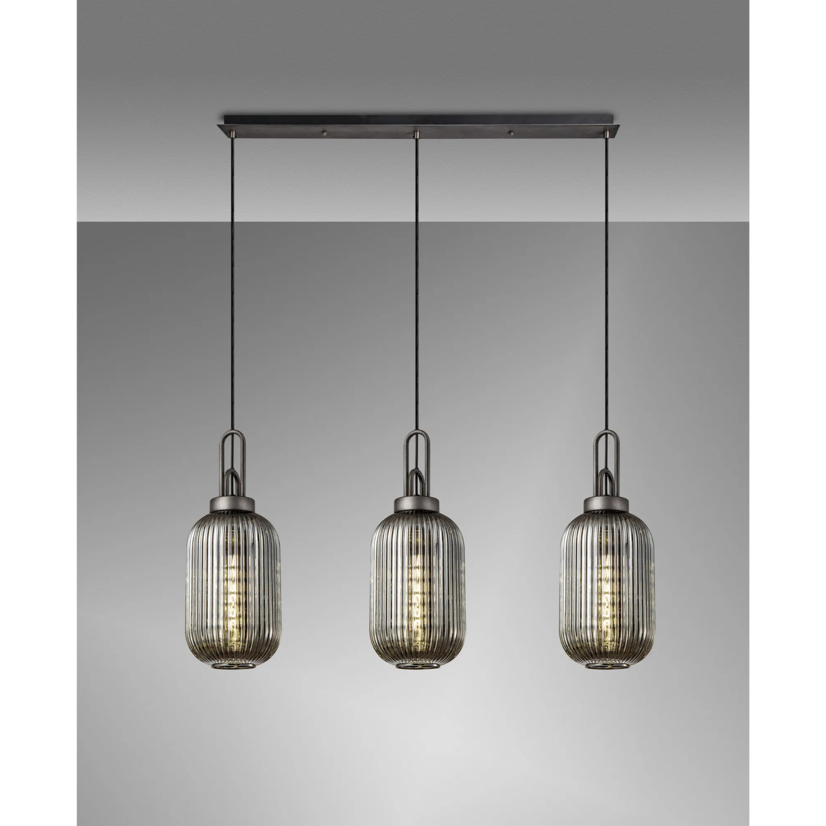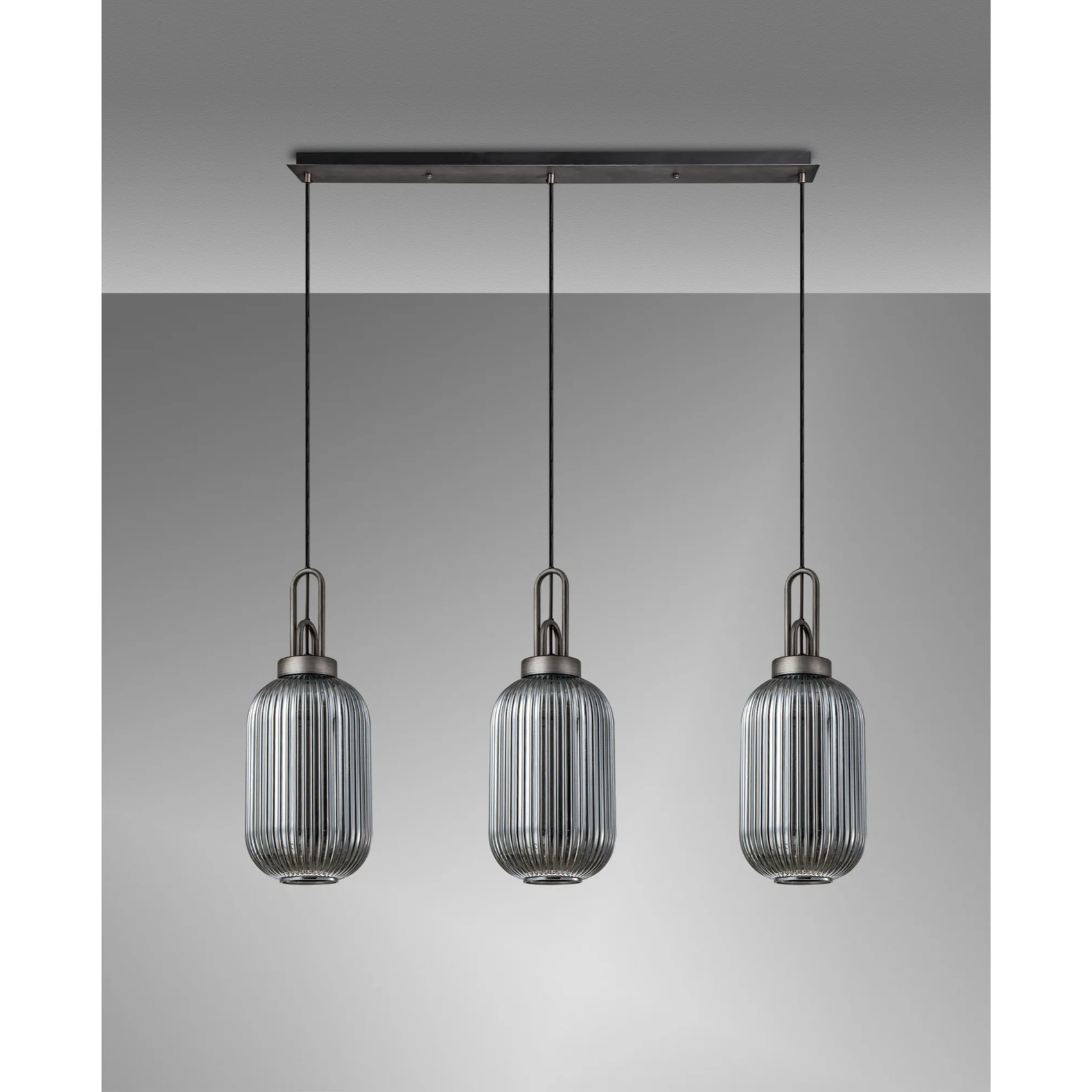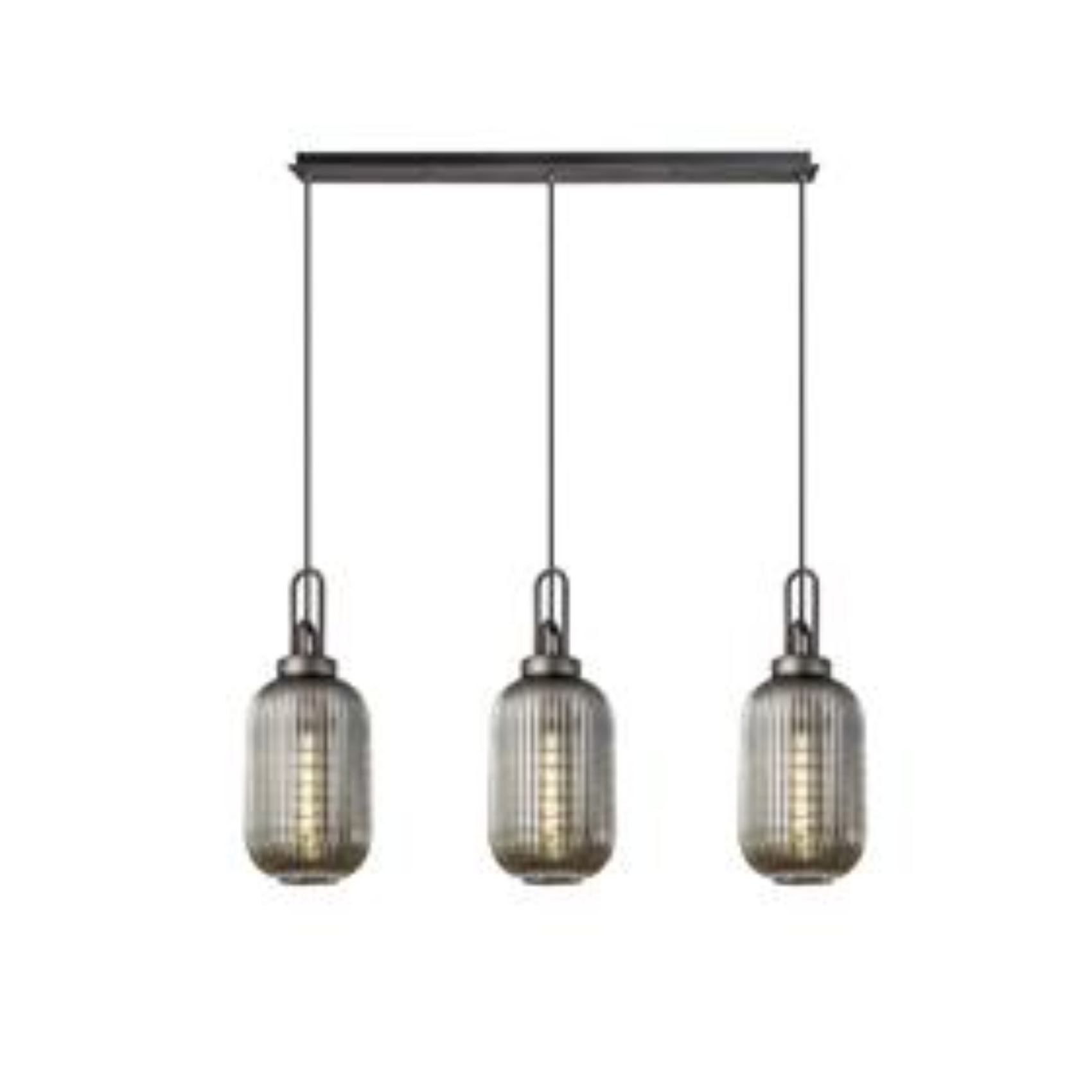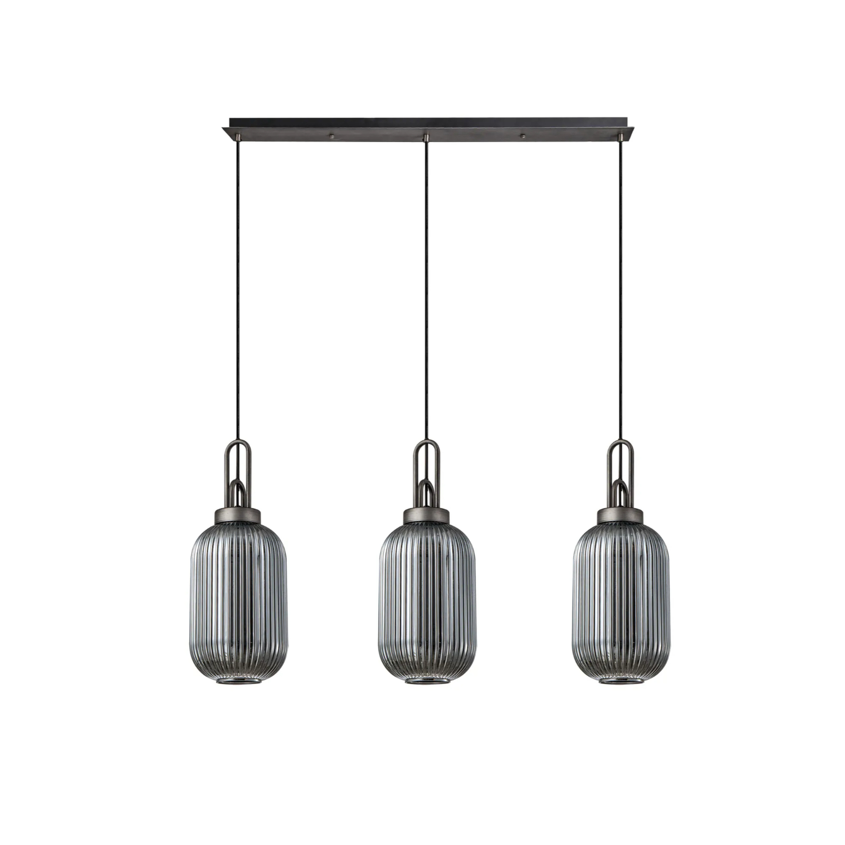 Idolite Camille Linear 3 Light Pendant With 20cm Tubular Ribbed Glass, Aged Pewter/Matt Black Smoked | IDOK2670