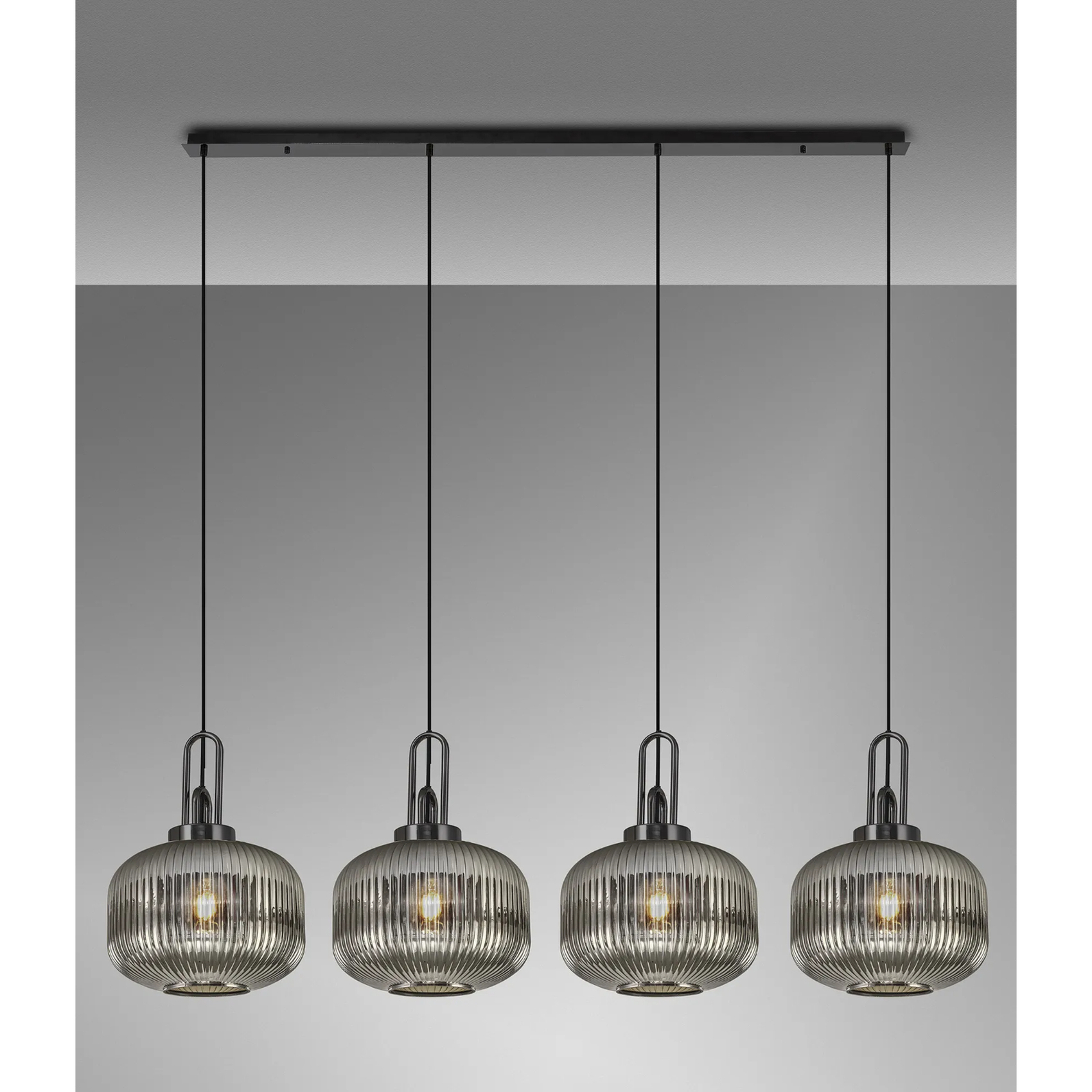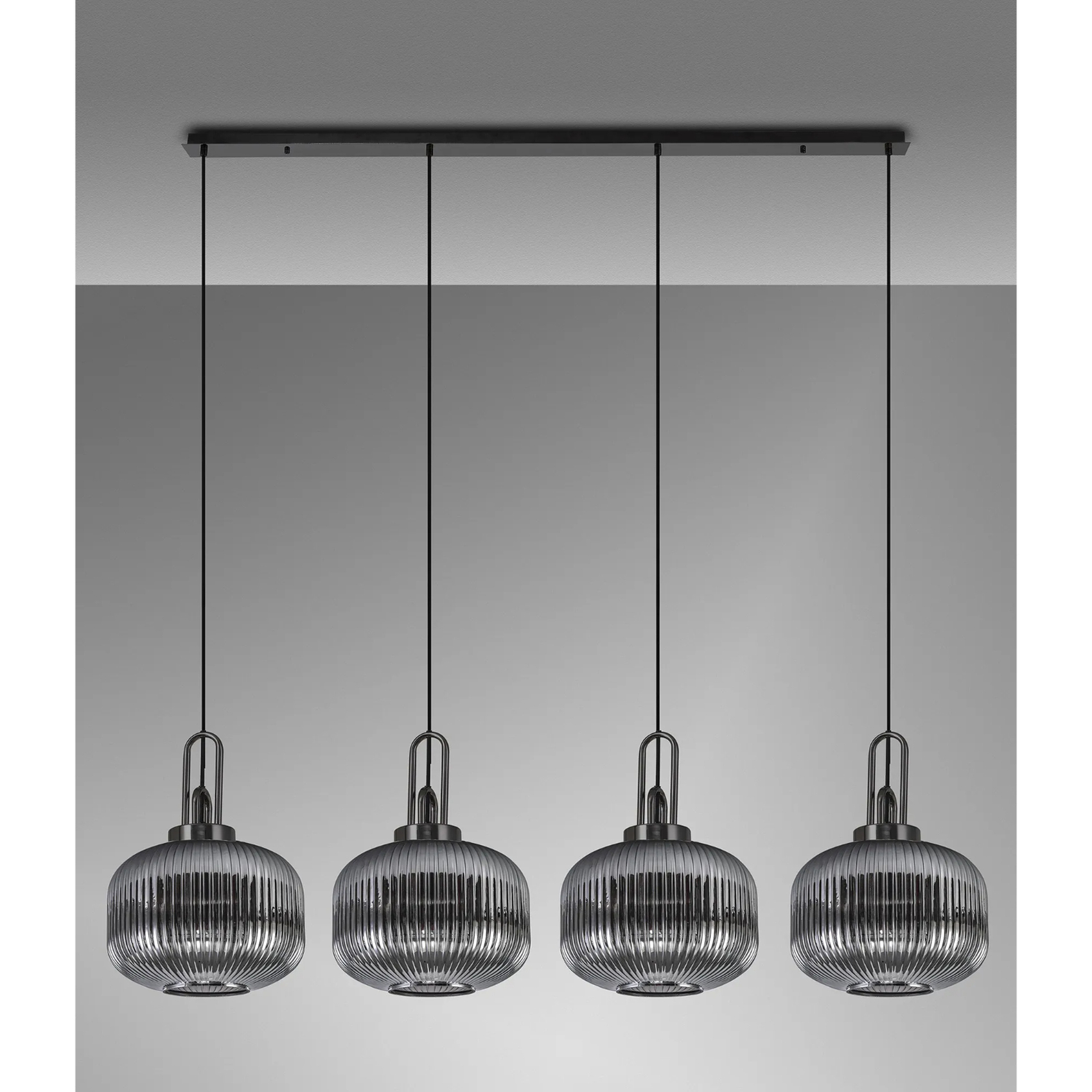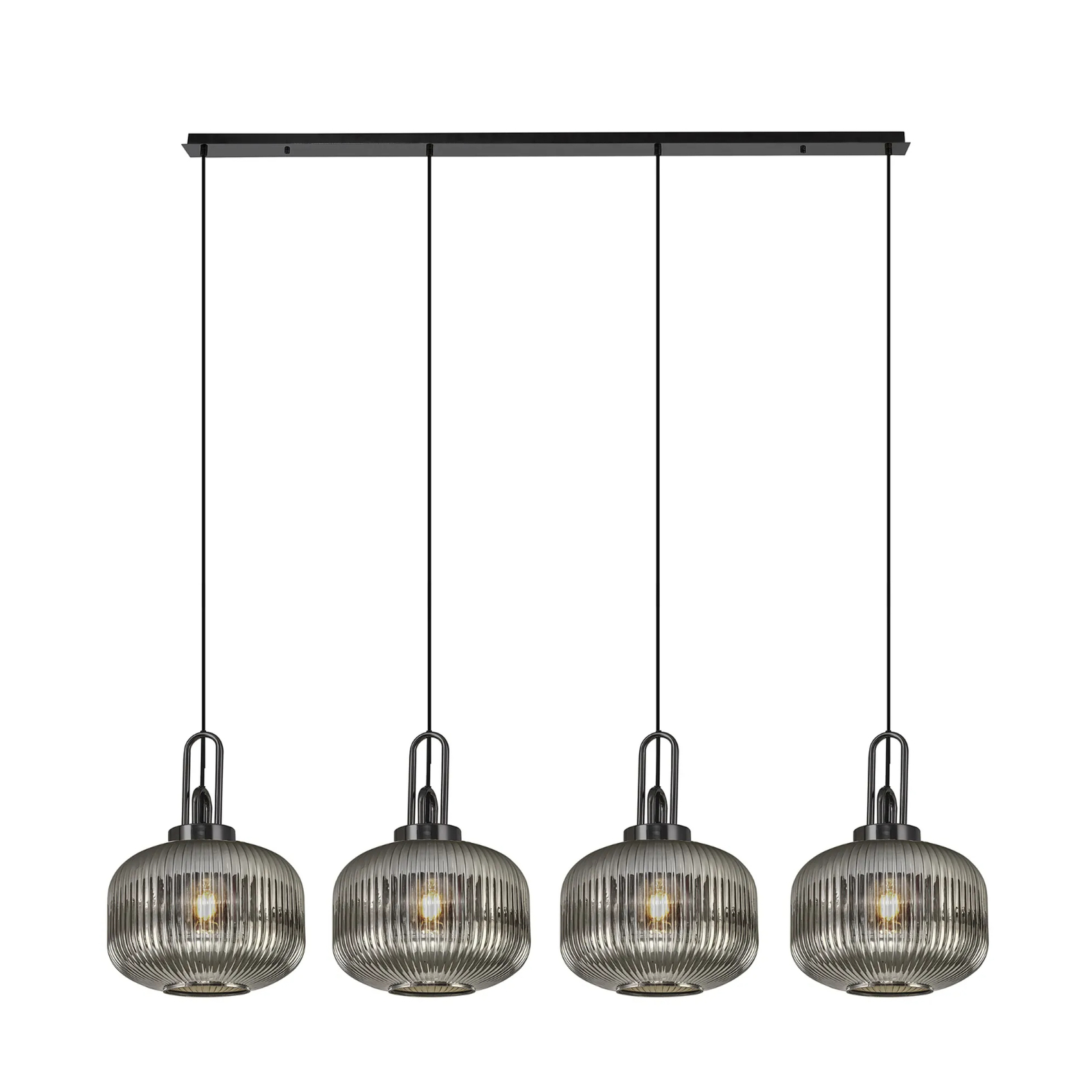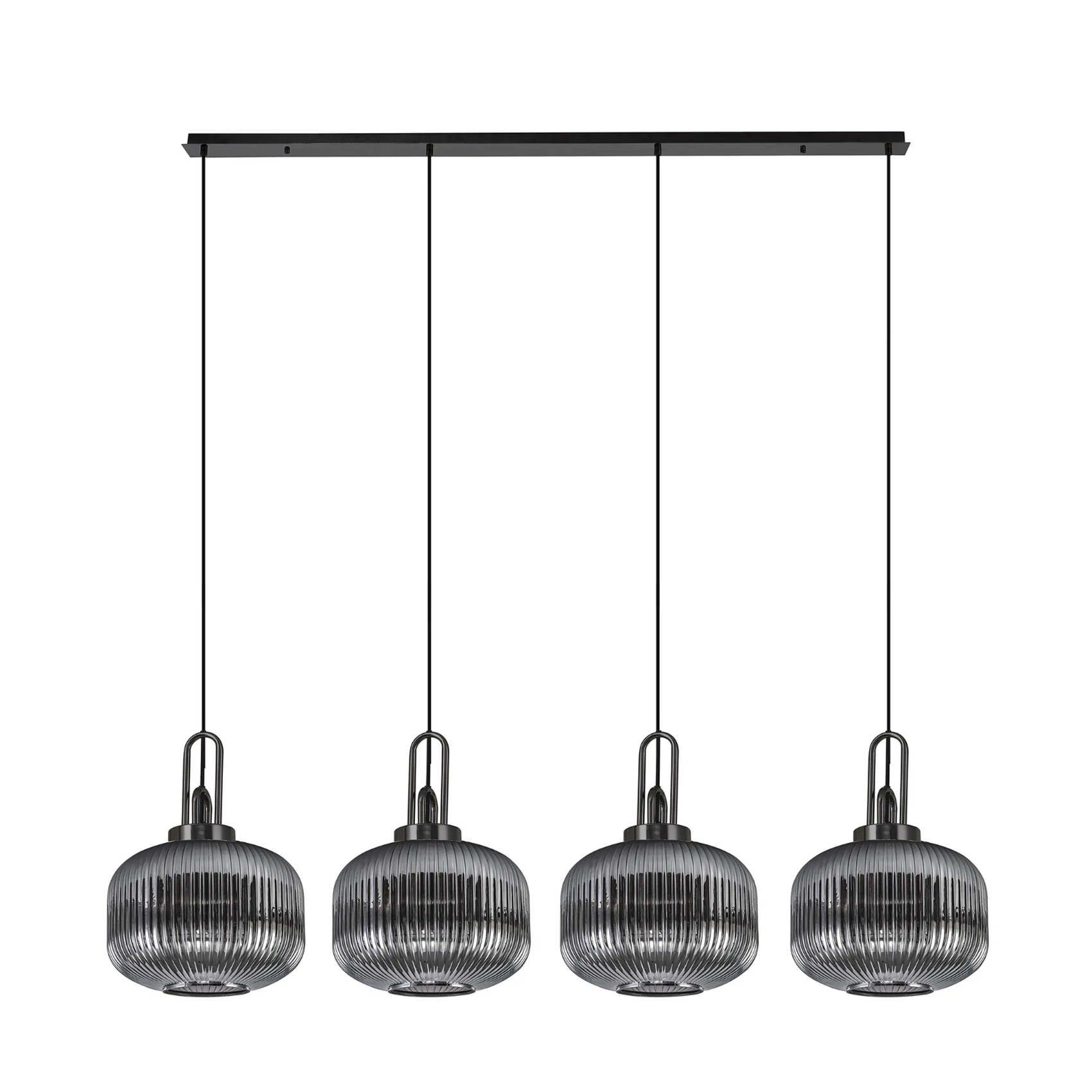 Idolite Camille Linear Pendant, 4 x E27, Black Chrome/Matt Black With 30cm Pumpkin Shaped Ribbed Smoked Glass | IDOK2960