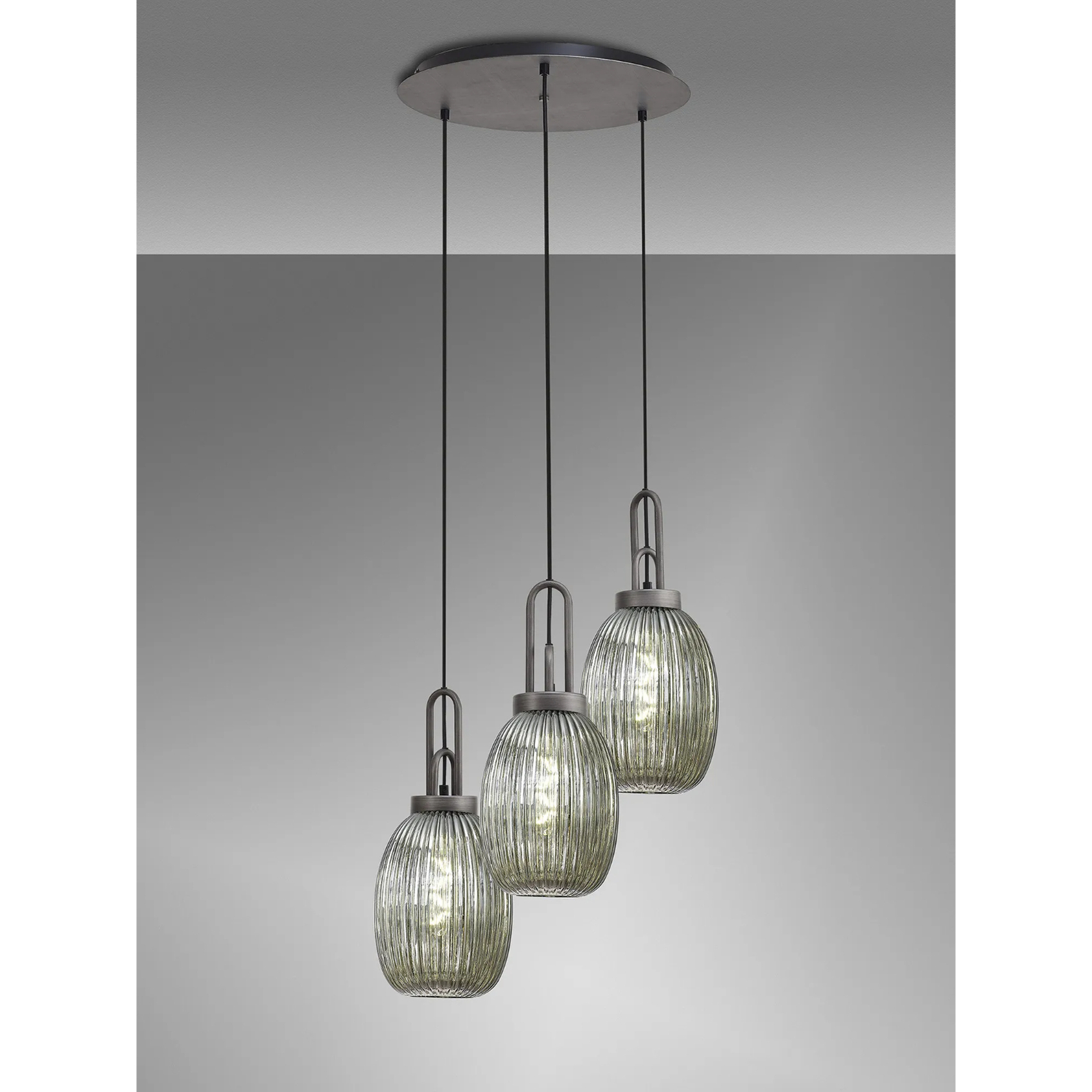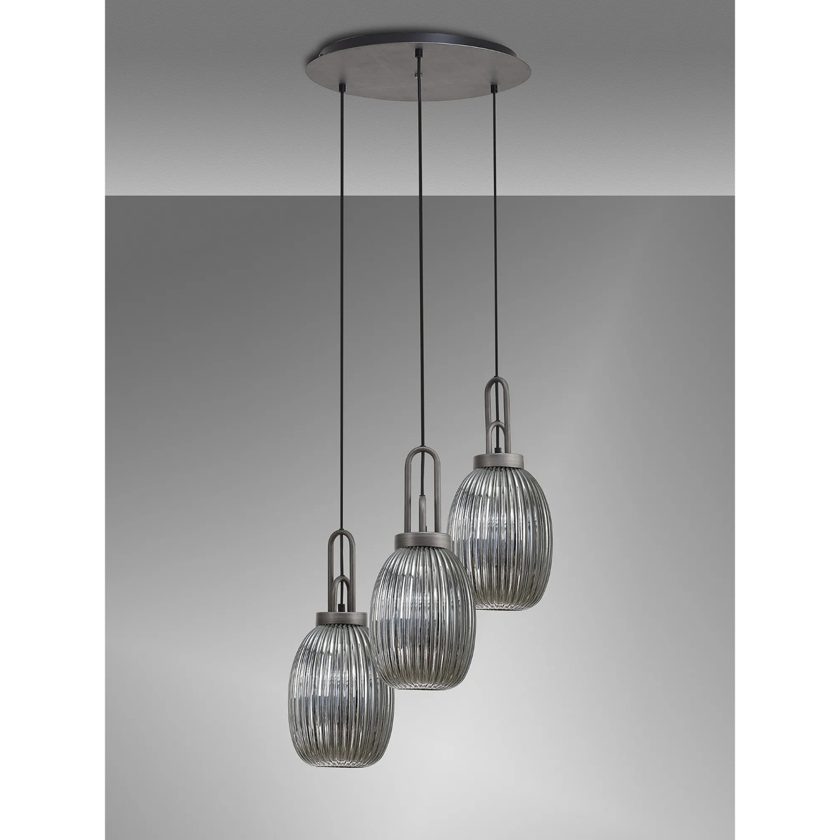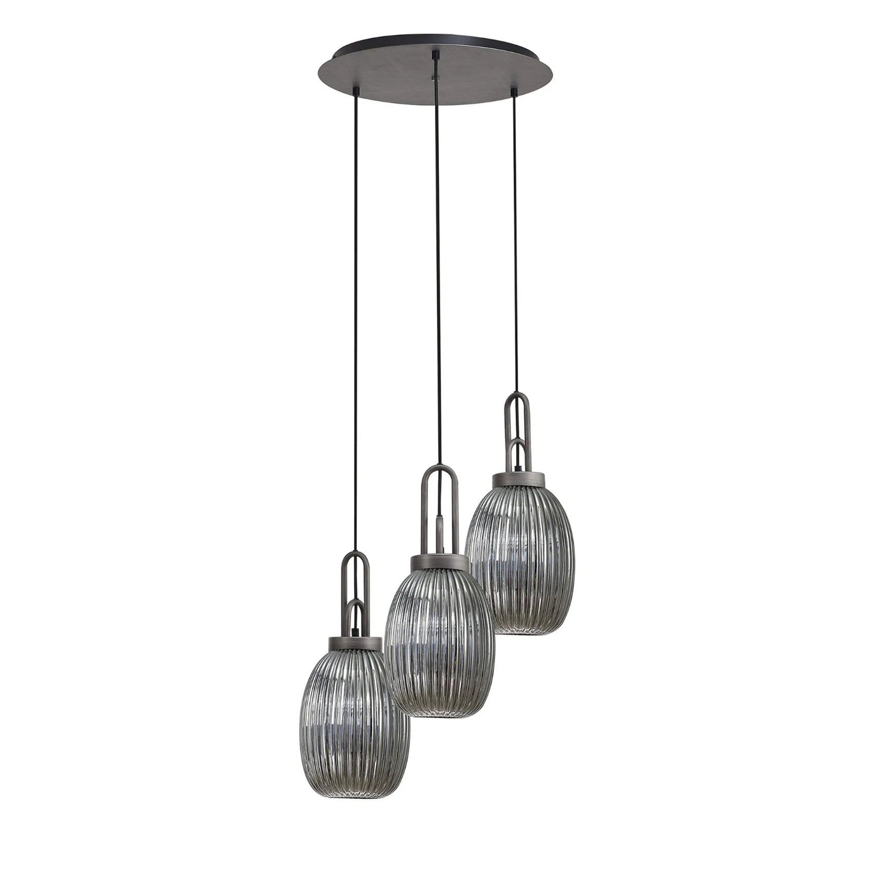 Idolite Camille Round 3 Light Pendant With 20cm Almond Ribbed Glass, Aged Pewter/Matt Black Smoked | IDOK6280