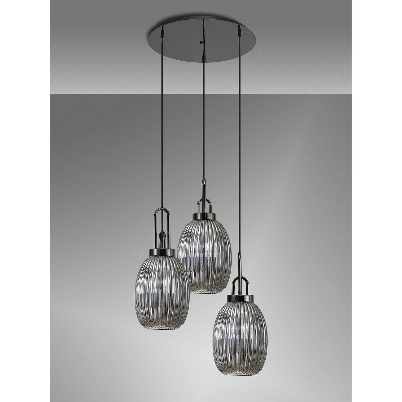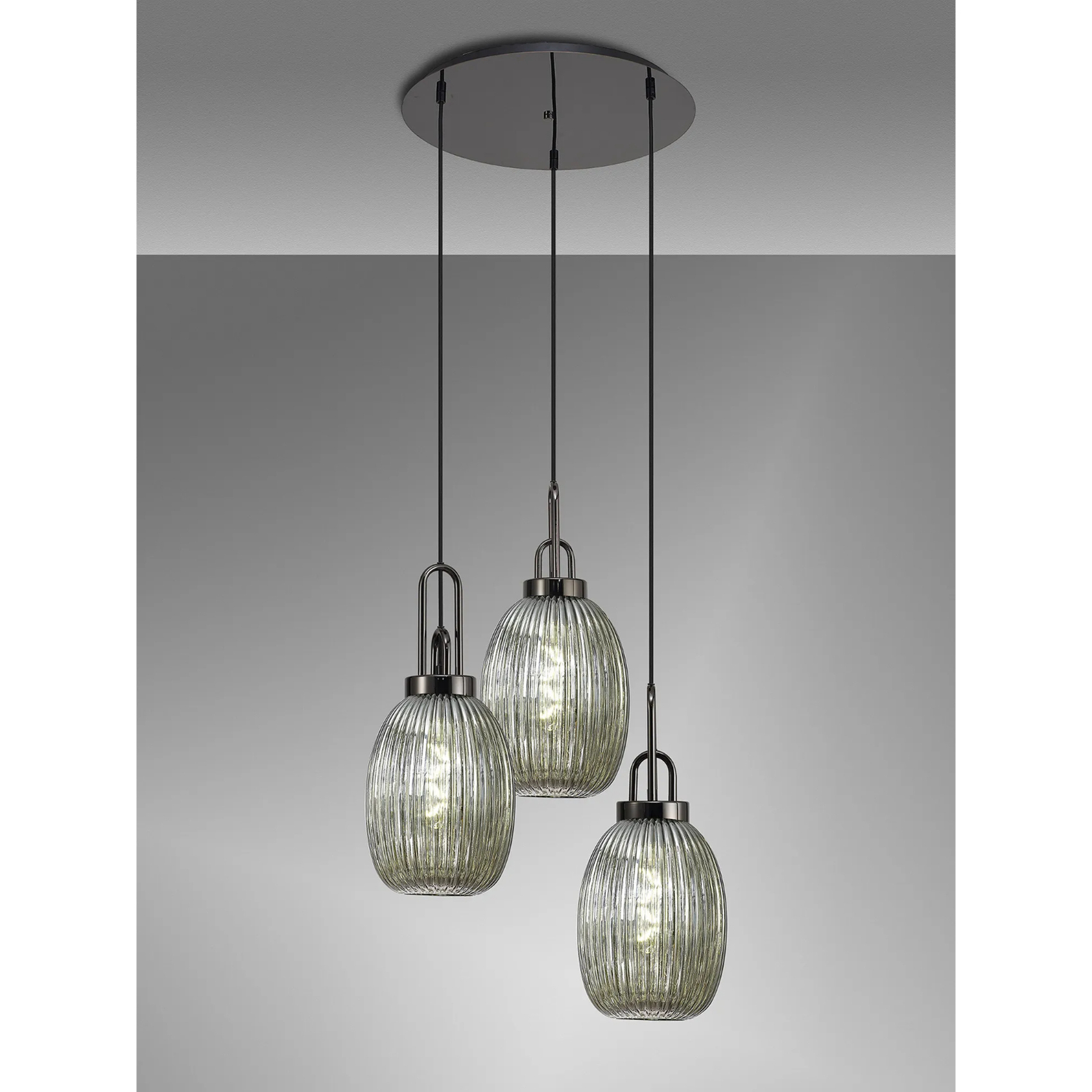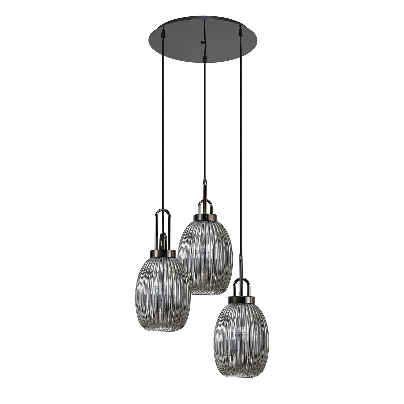 Idolite Camille Round 3 Light Pendant With 20cm Almond Ribbed Glass, Black Chrome/Matt Black Smoked | IDOK4380