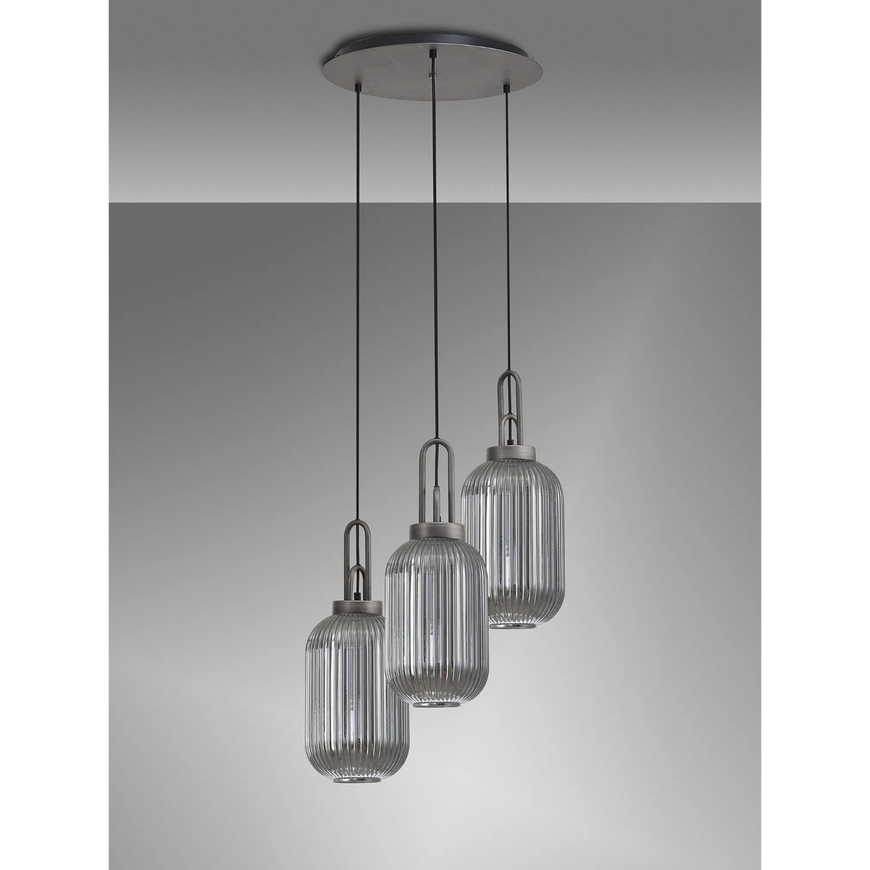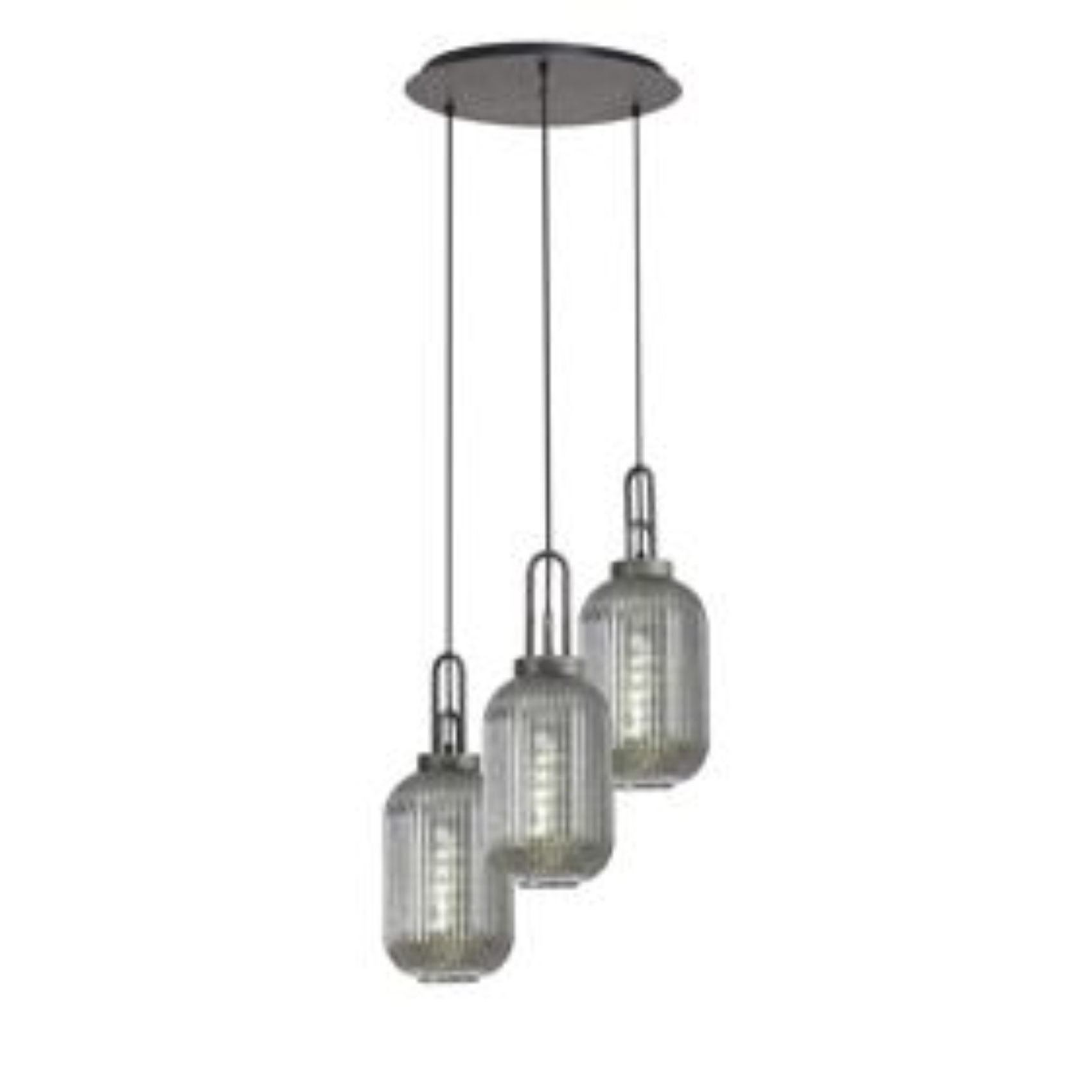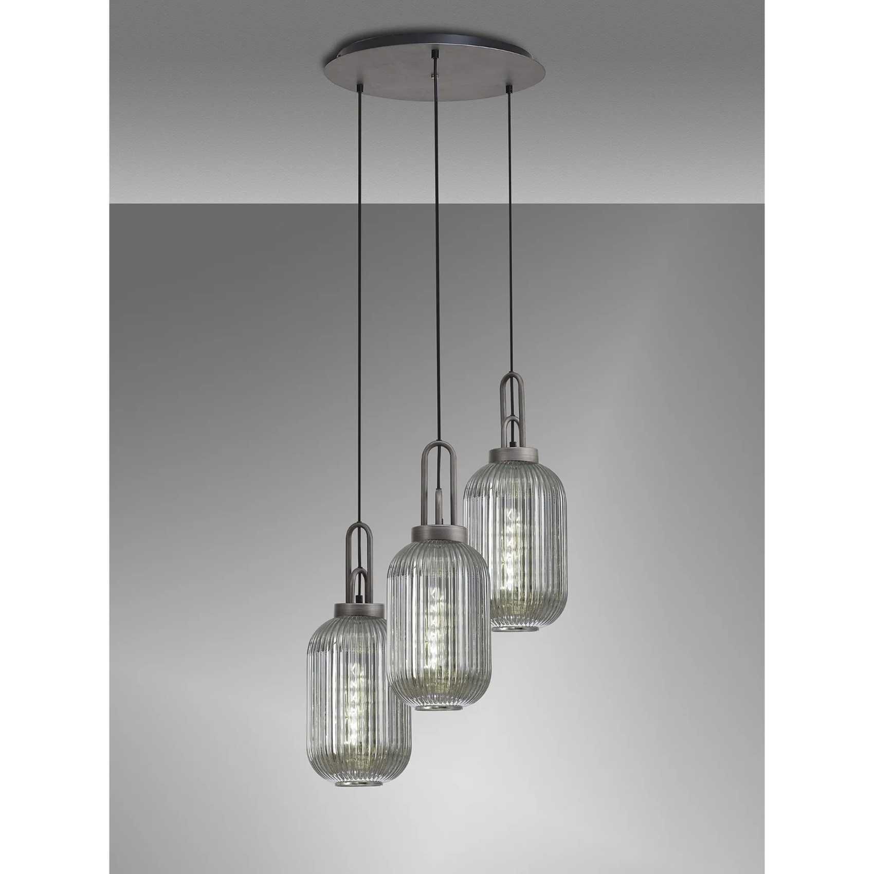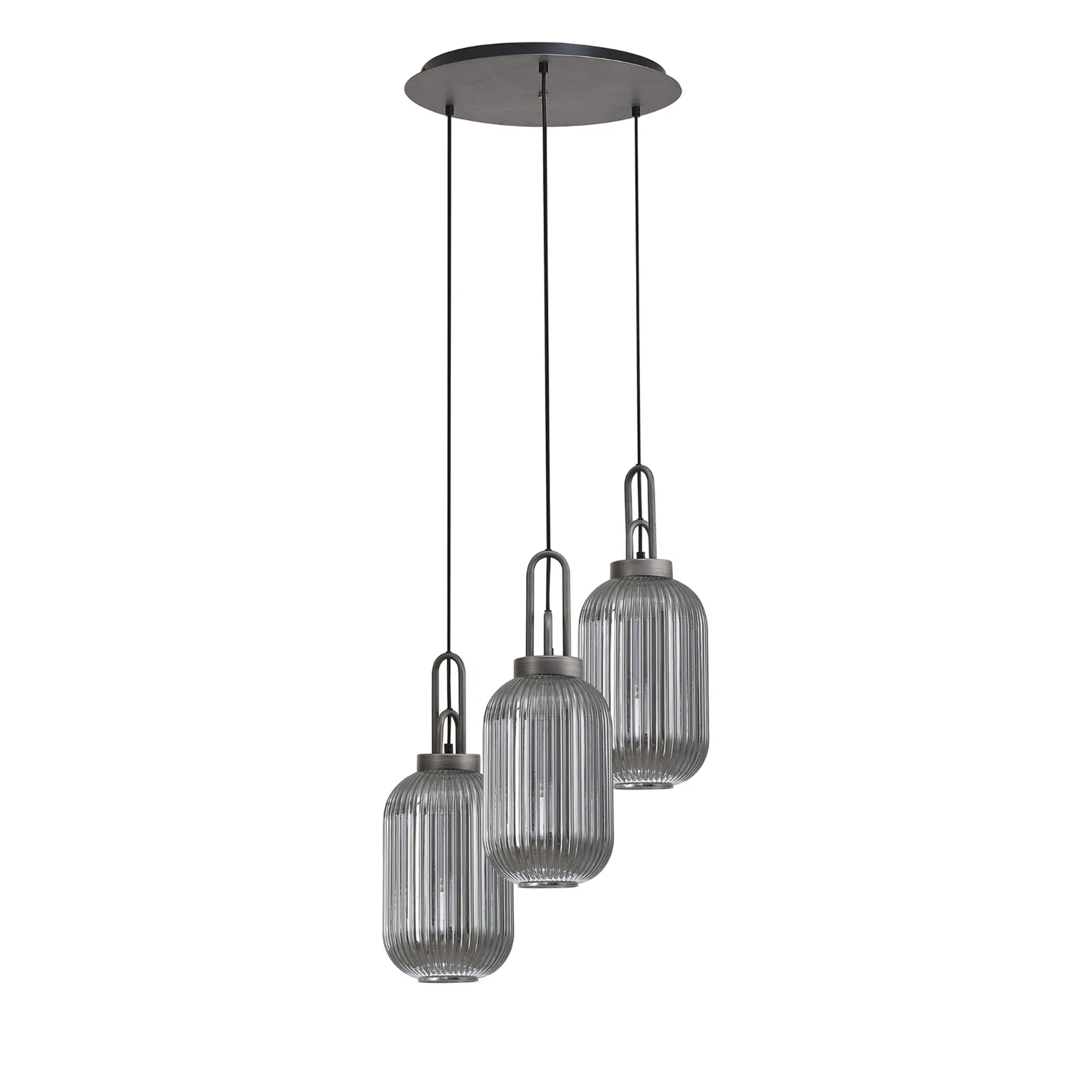 Idolite Camille Round 3 Light Pendant With 20cm Tubular Ribbed Glass, Aged Pewter/Matt Black Smoked | IDOK4670
