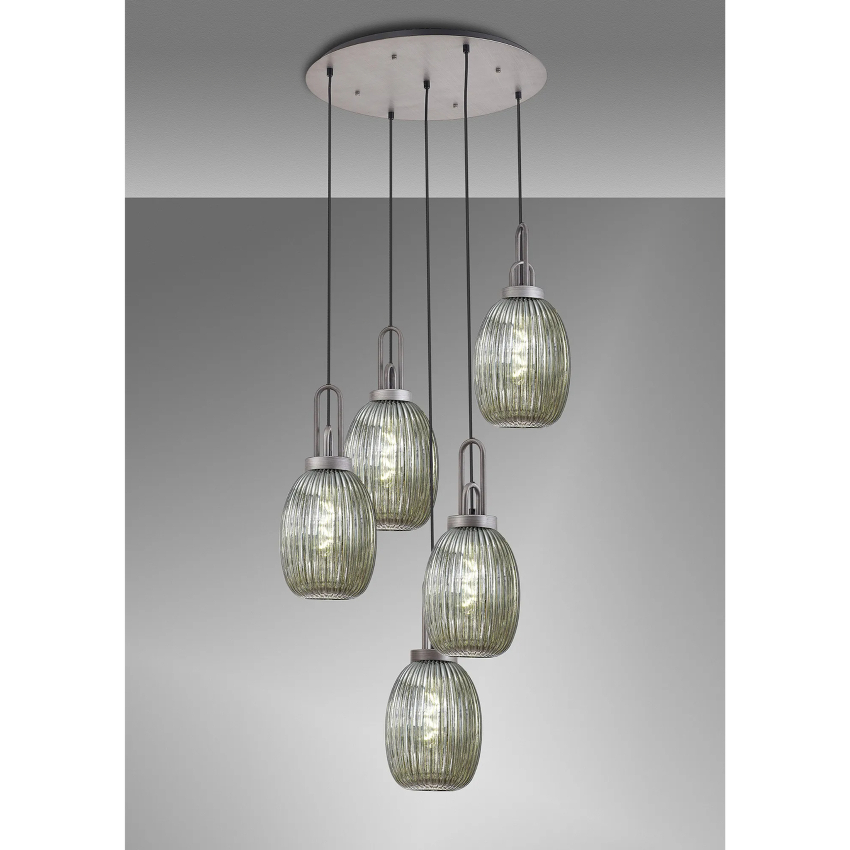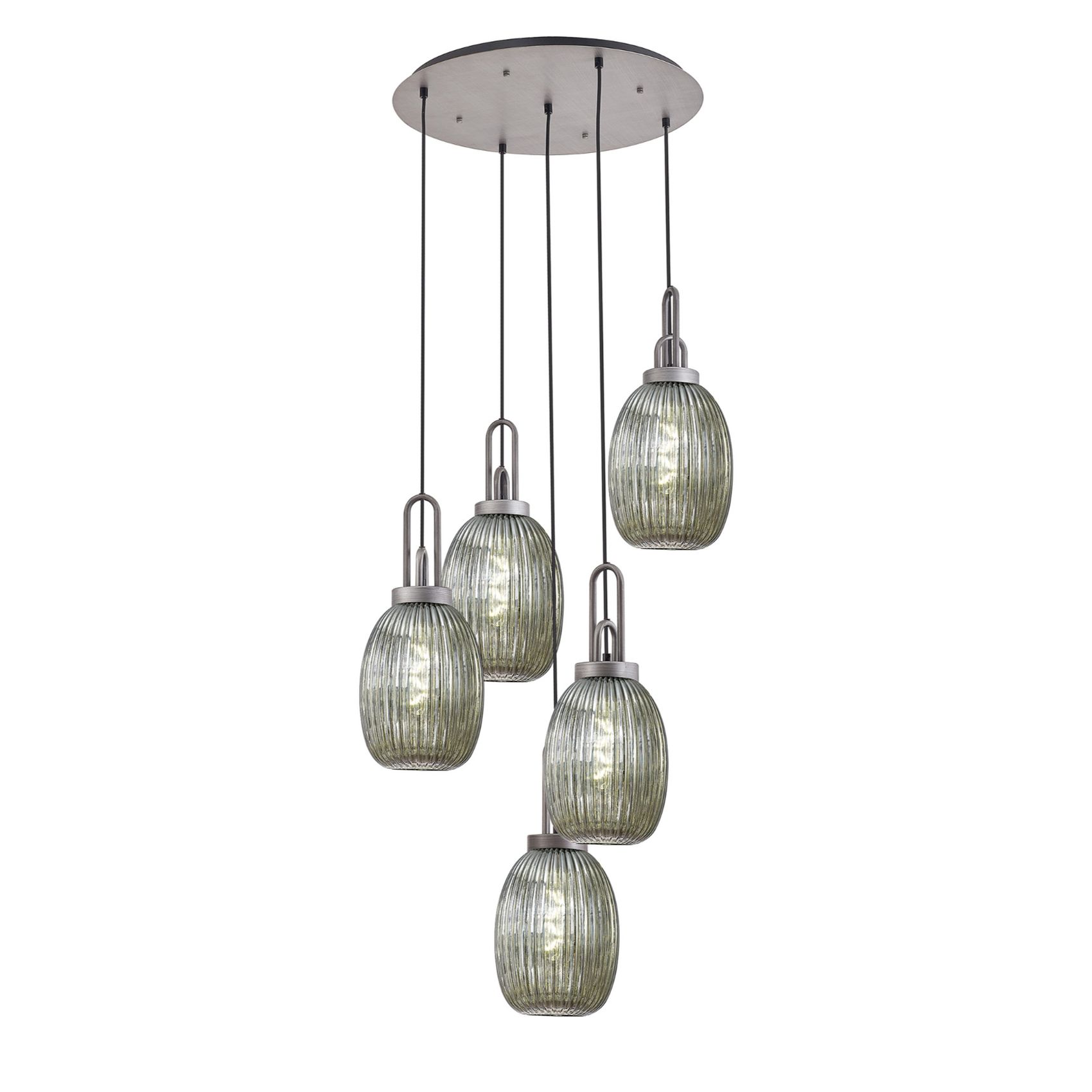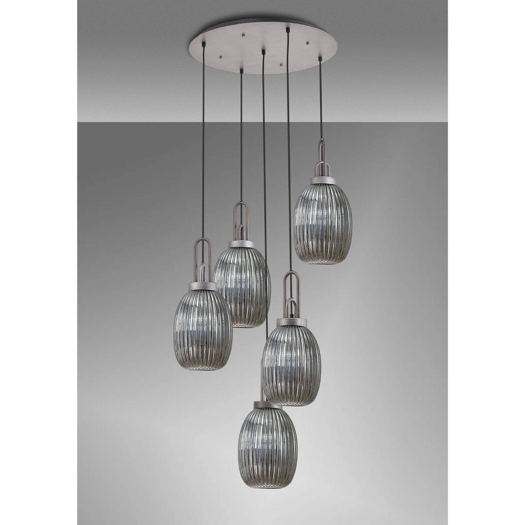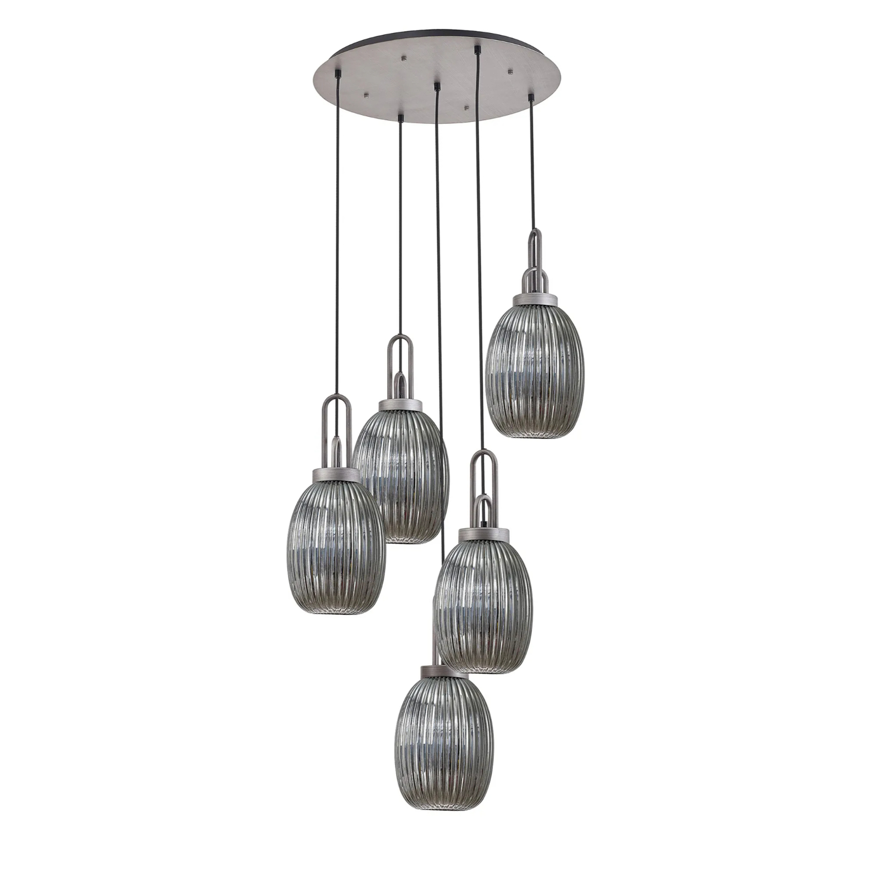 Idolite Camille Round 5 Light Pendant With 20cm Almond Ribbed Glass, Aged Pewter/Matt Black Smoked | IDOK7280