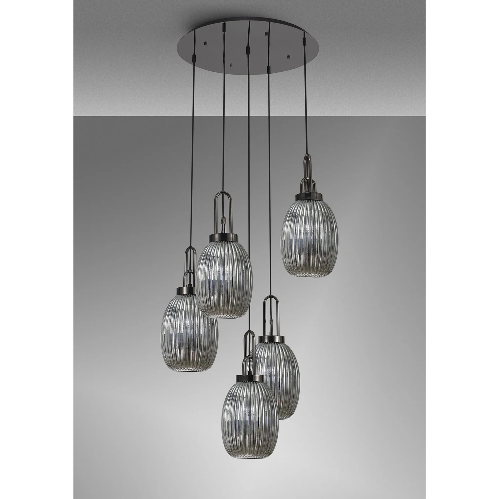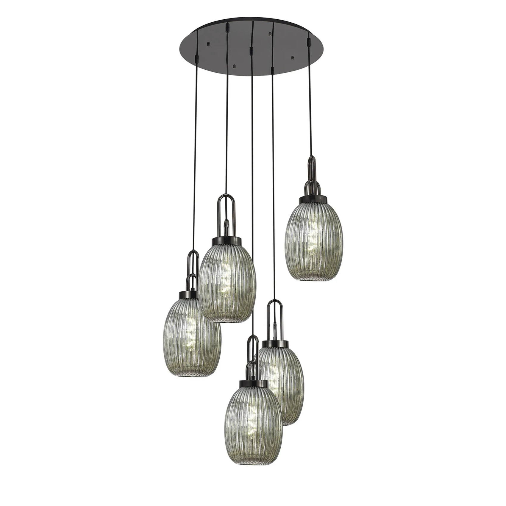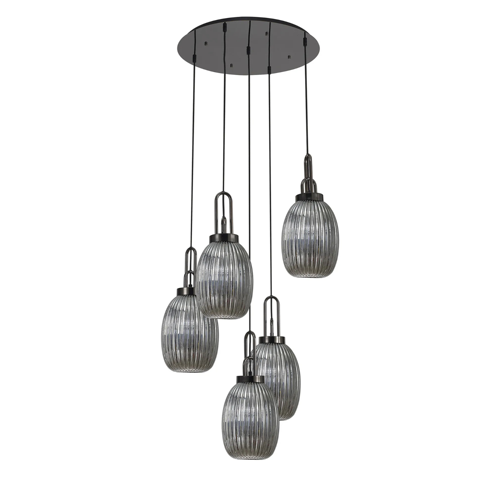 Idolite Camille Round 5 Light Pendant With 20cm Almond Ribbed Glass, Black Chrome/Matt Black Smoked | IDOK5380