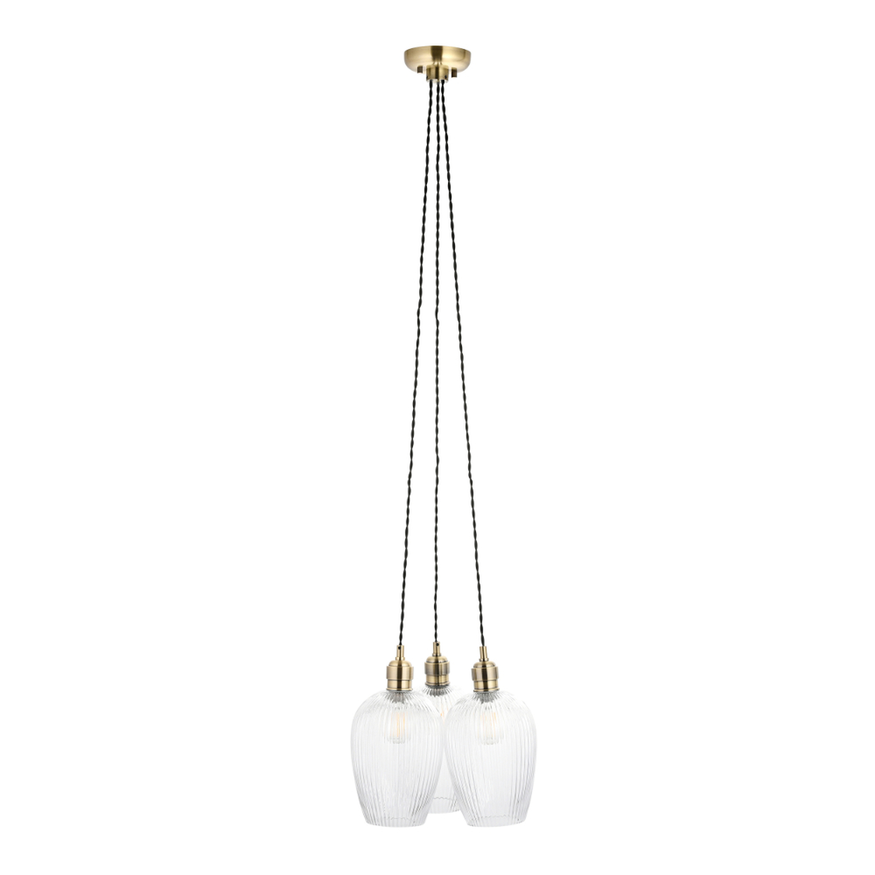 Thorlight Trentham 3 Light Antique Brass Cluster Pendant Light Complete With Clear Ribbed Glasses | 120656