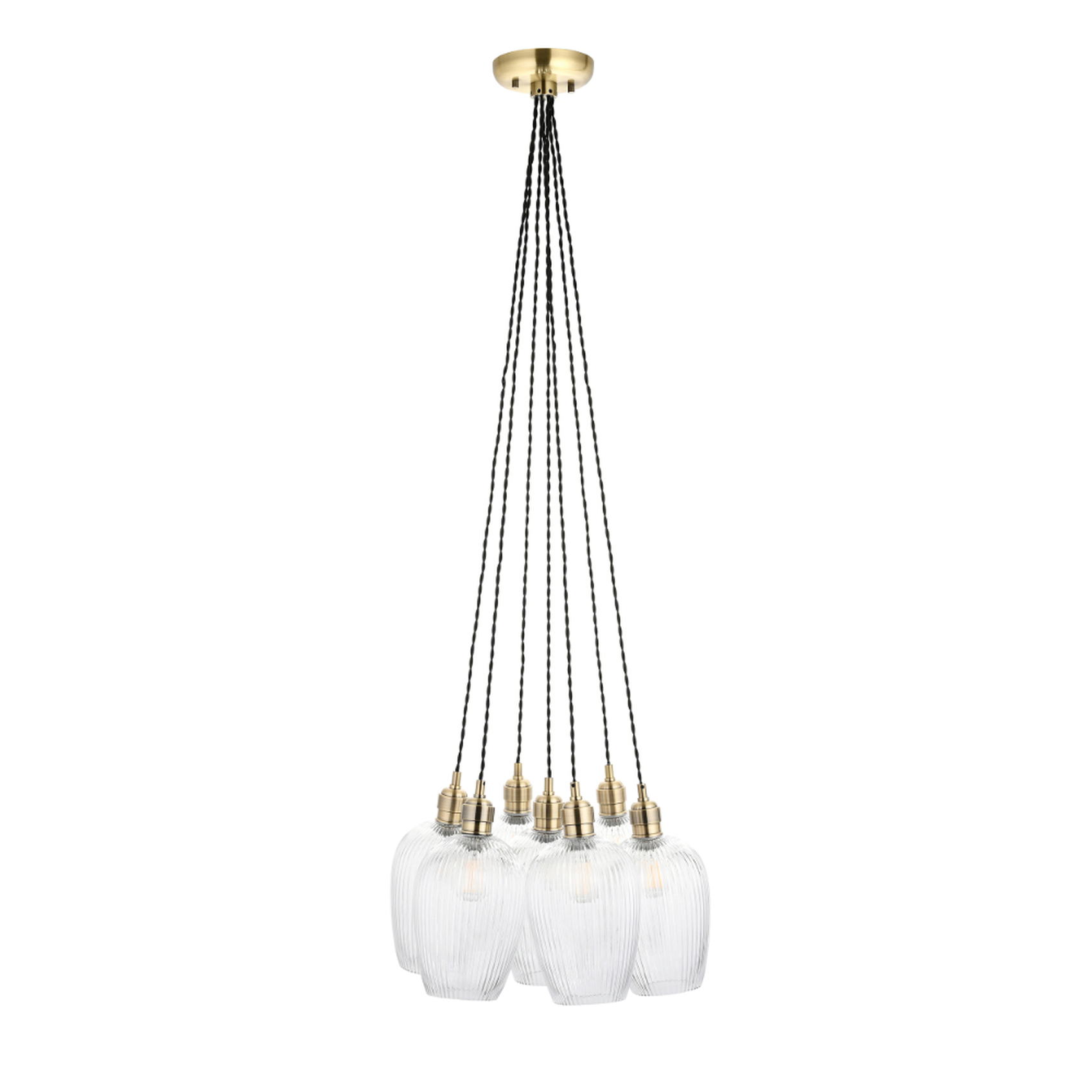 Thorlight Trentham Large 7 Light Antique Brass Stairway Cluster Light Complete With Clear Ribbed Glass Shades | 120655
